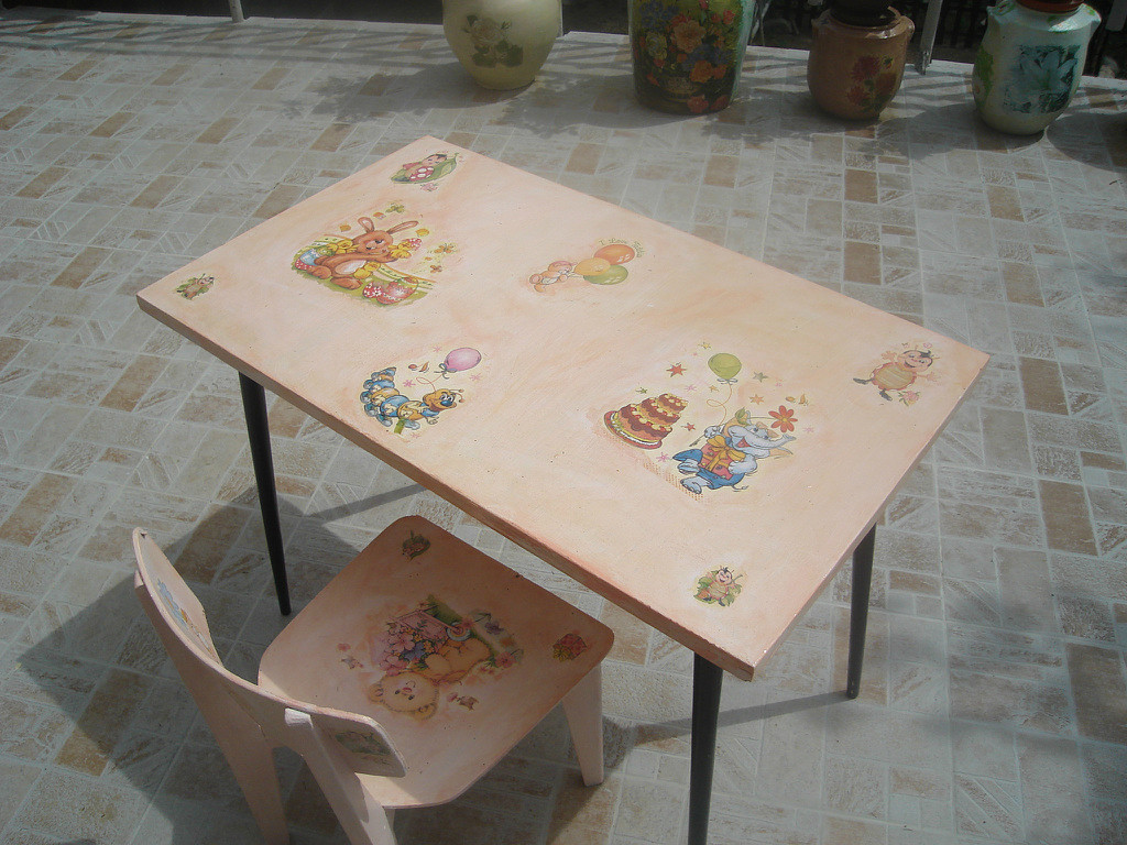 Использовала для декупажа старие столики и стулья, коробки картонние из под Узо, банки железние и прочие ненужние безделушки.