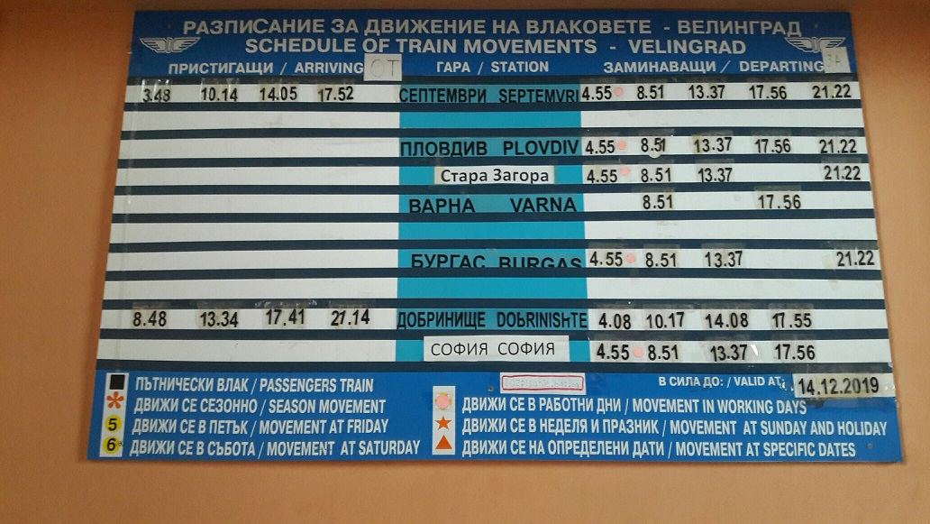 На табло с расписанием есть и Варна, и Бургас, и Пловдив, и София. И время отправления во все эти города одинаково, потому что в городе Велинграде проходит только узкоколейка, и на привычные нам поезда нужно пересаживаться в Семтември.
