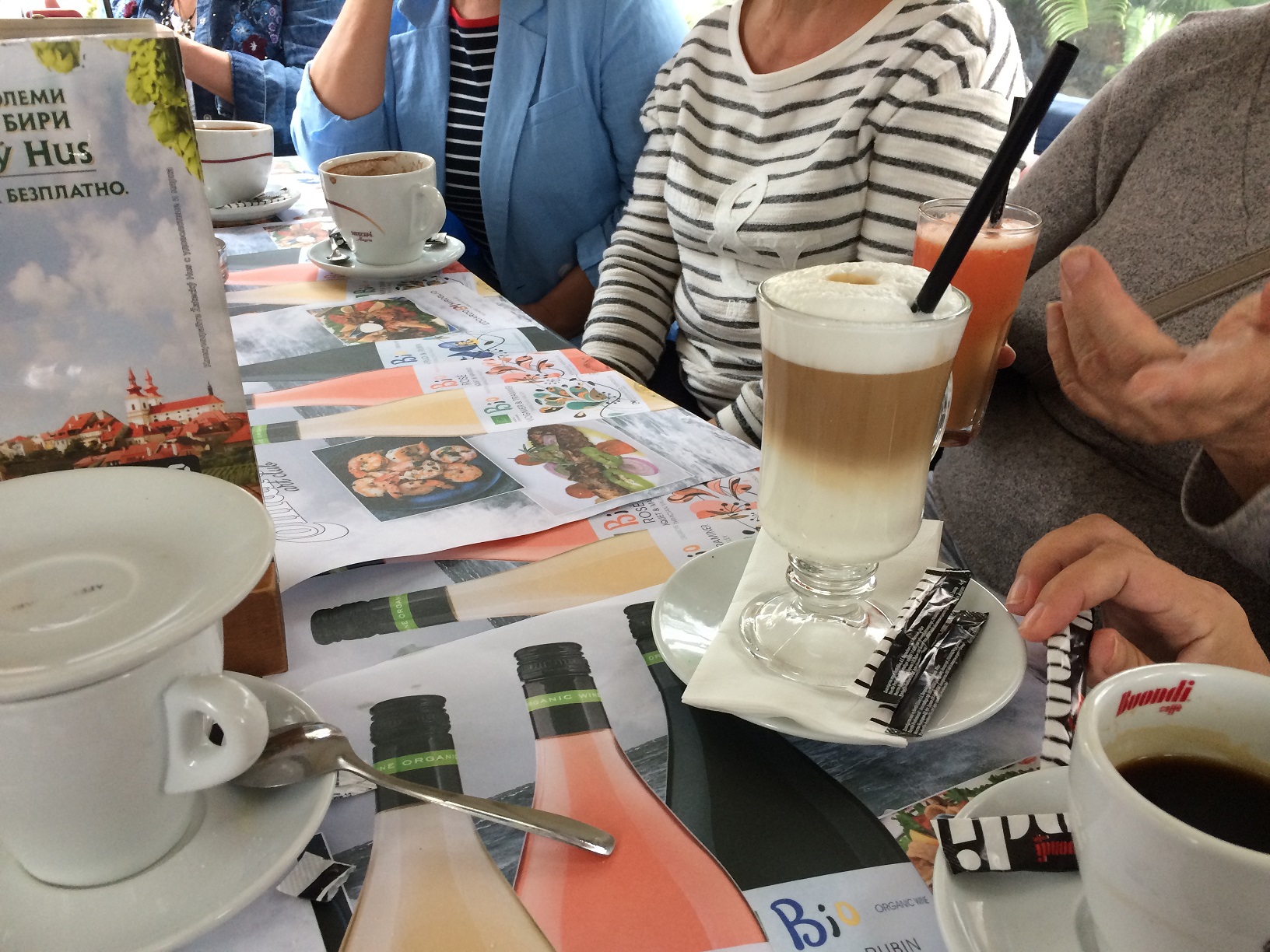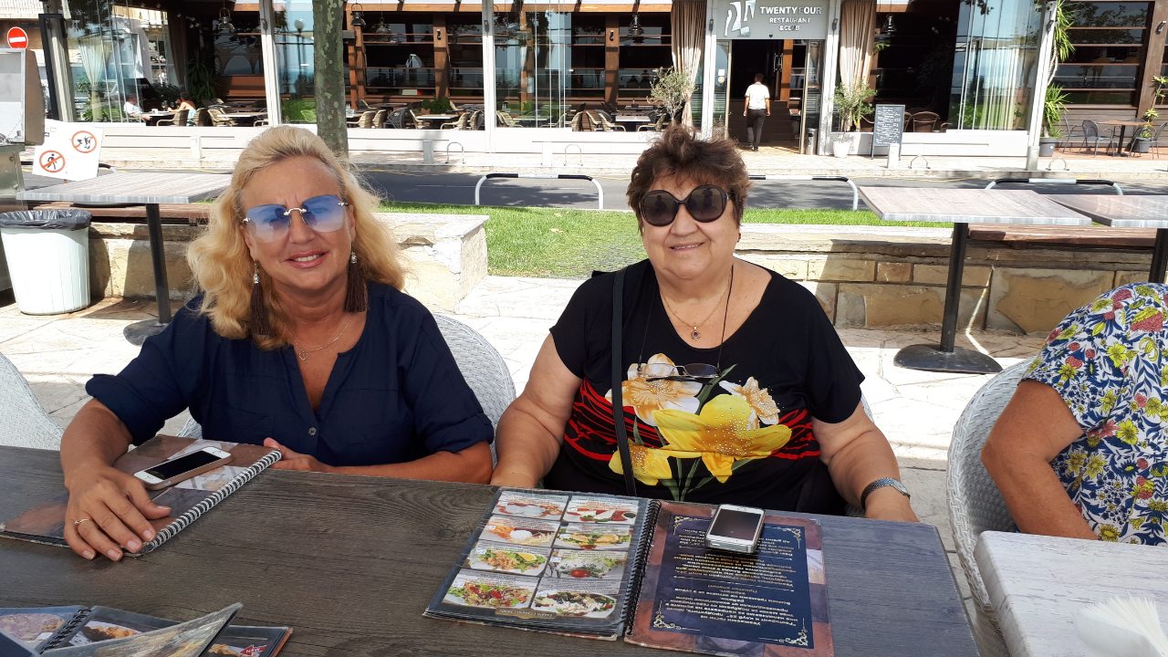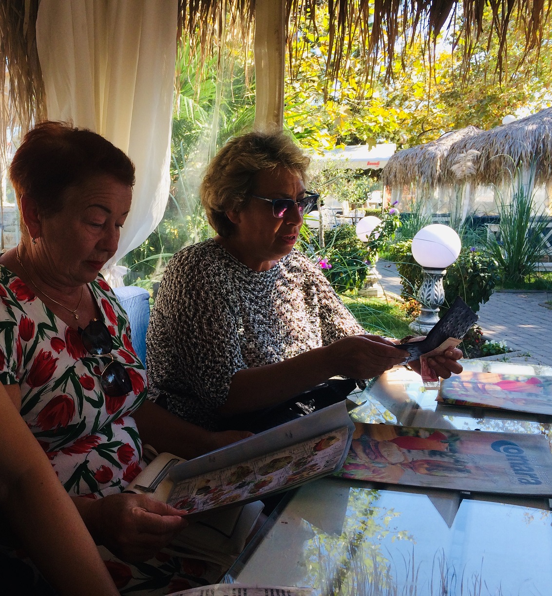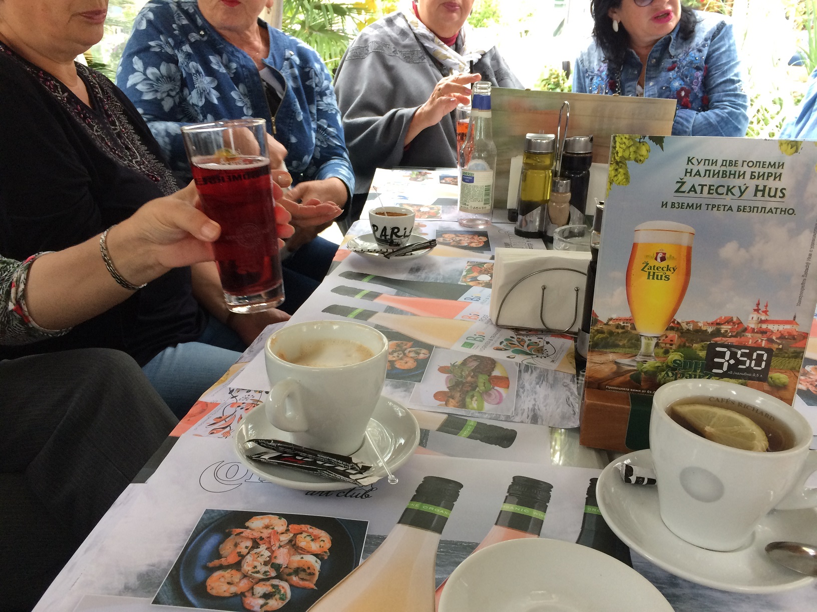 Поскольку вчера был День пенсионеров или День пожилых людей, то решили хоть что-нибудь выпить в честь этого дня. Девочки смотрят карту напитков.