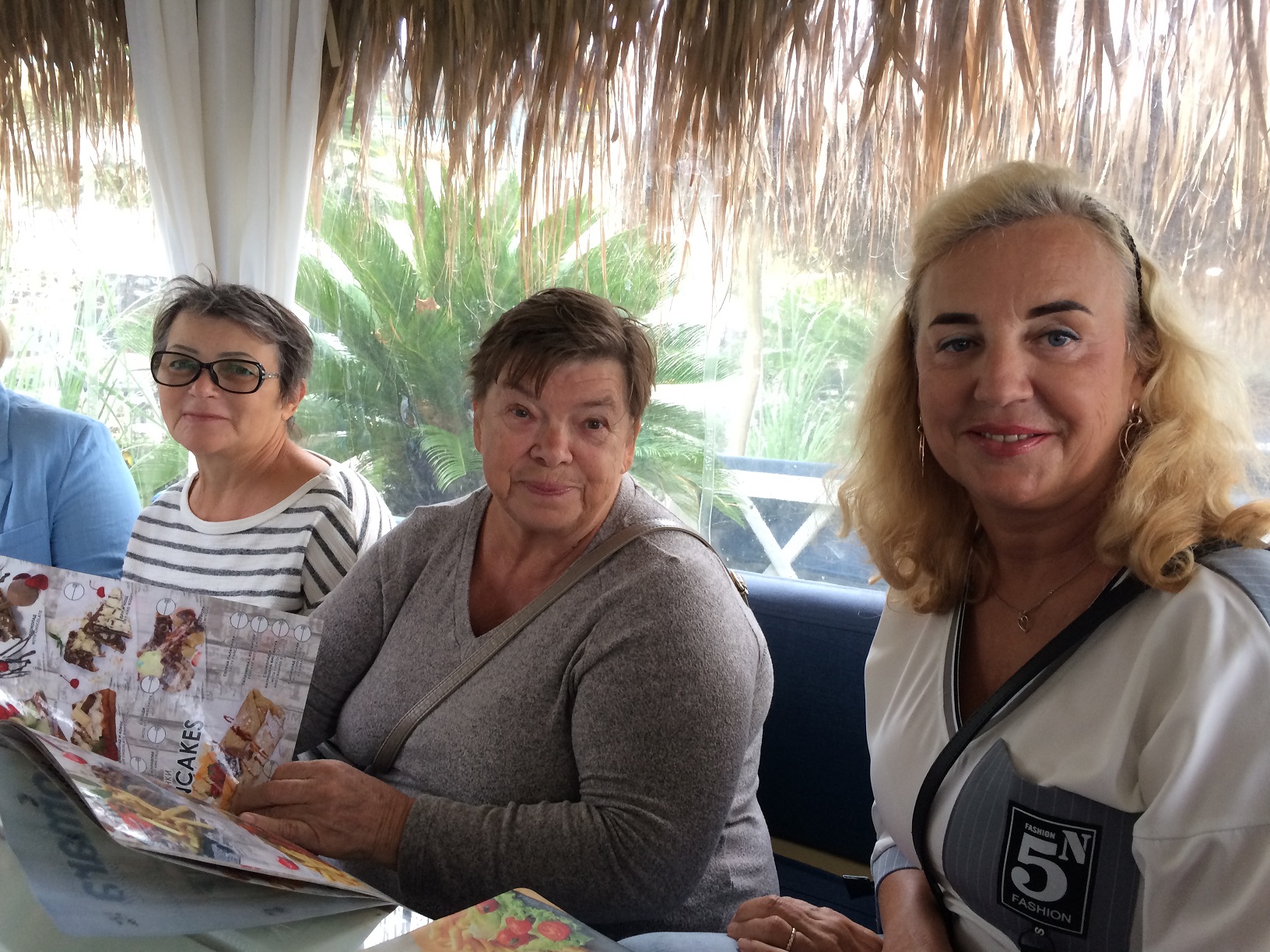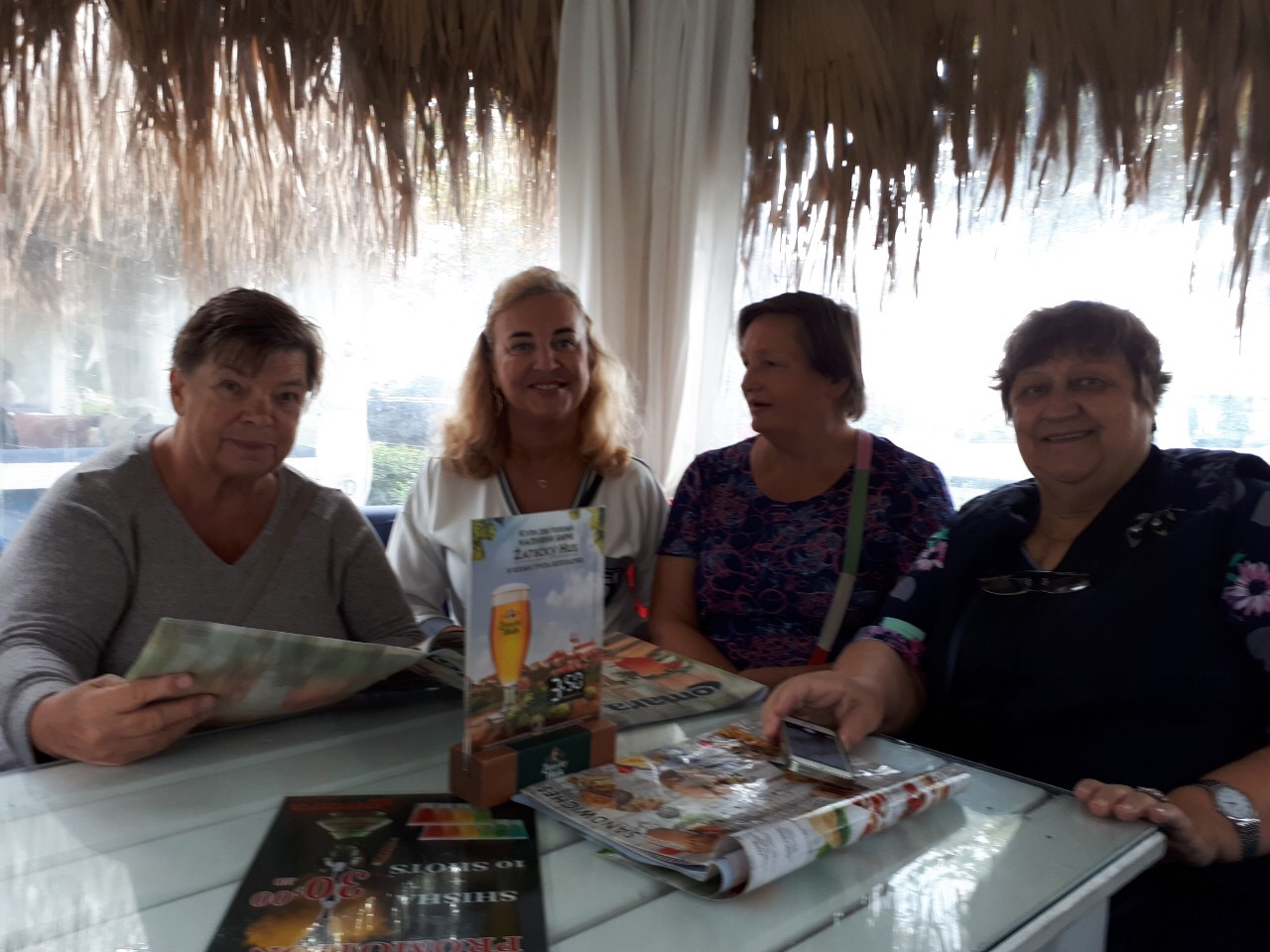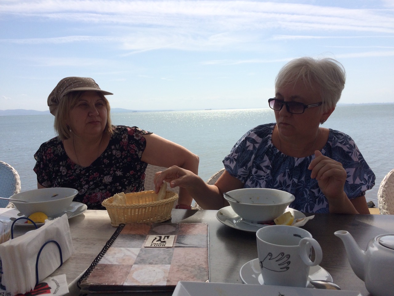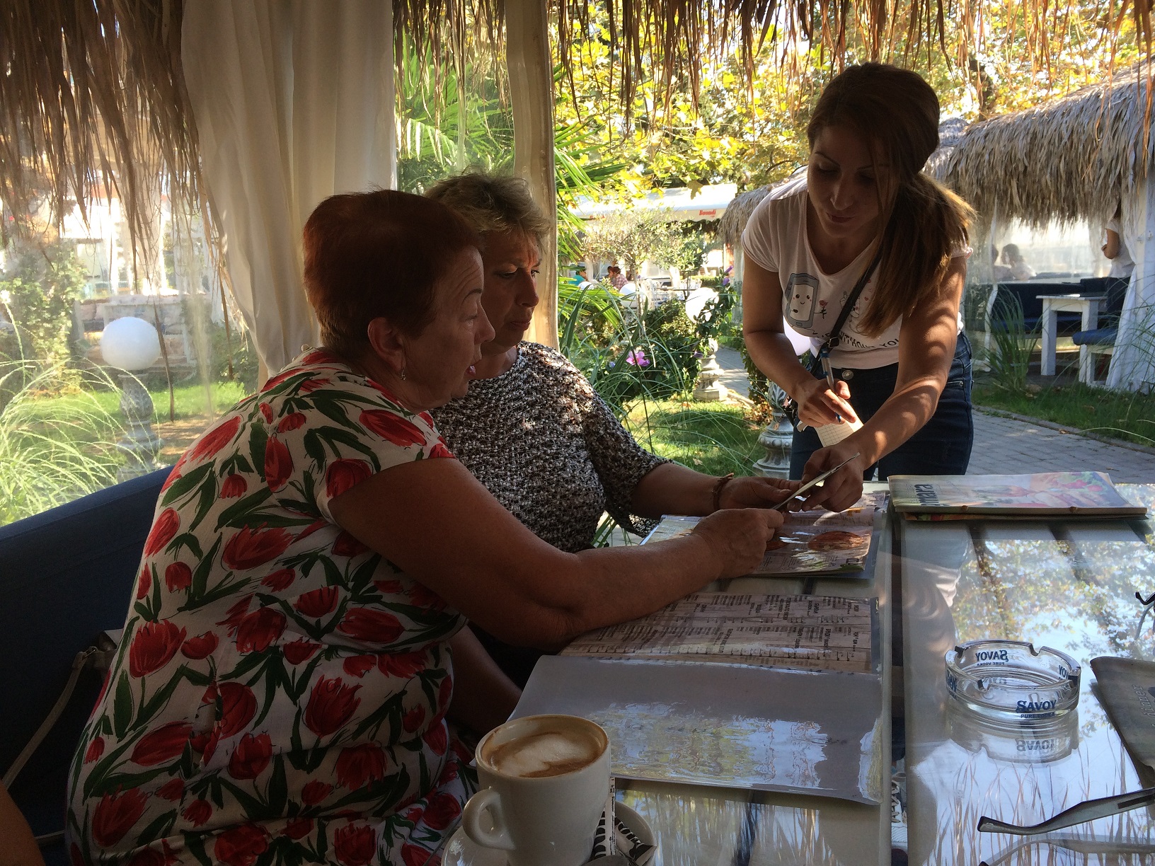 Поскольку вчера был День пенсионеров или День пожилых людей, то решили хоть что-нибудь выпить в честь этого дня. Девочки смотрят карту напитков.