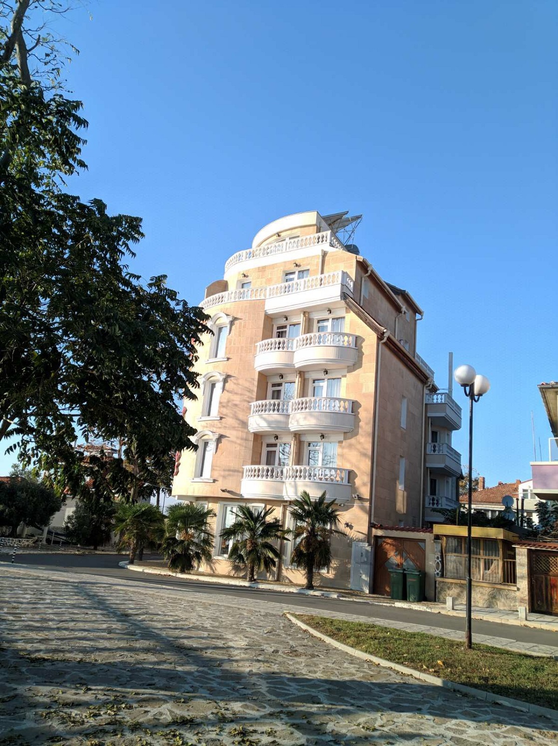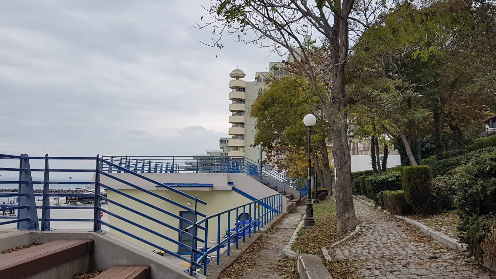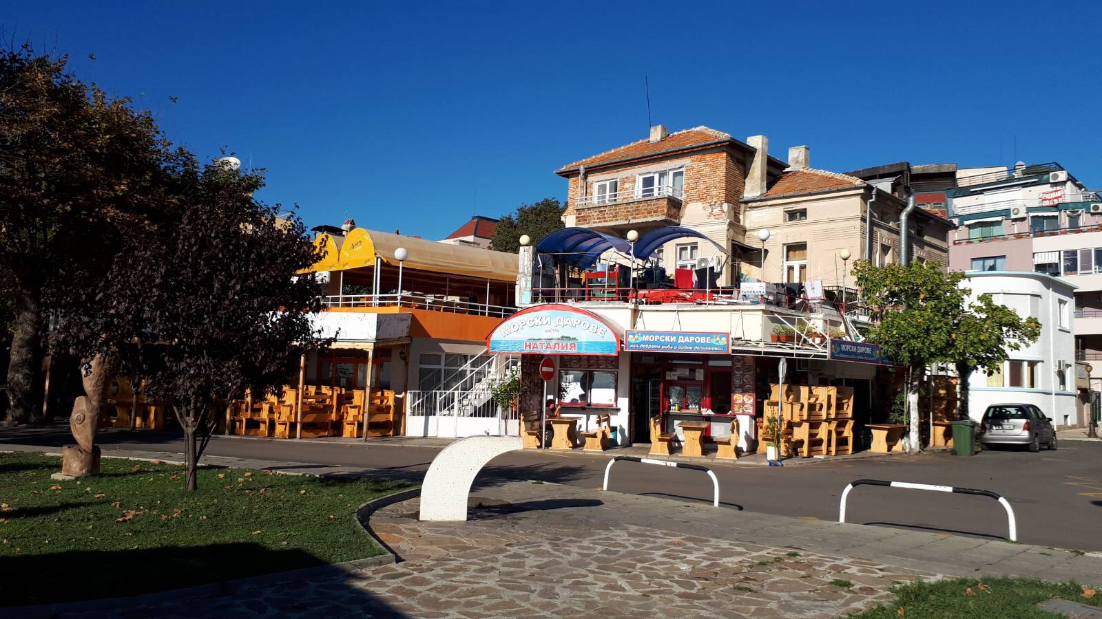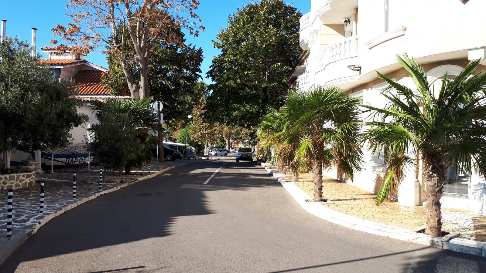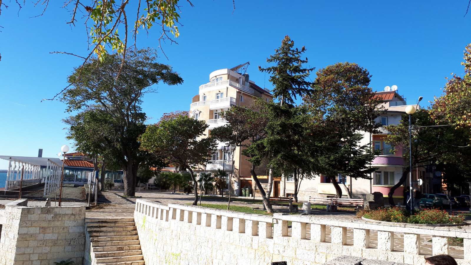 Набережная П. Яворов. Перел нами белая лестница к морю, справа впереди видно здание красивого небольшого отеля (названия не знаю), а слева напротив него ресторан Paros.