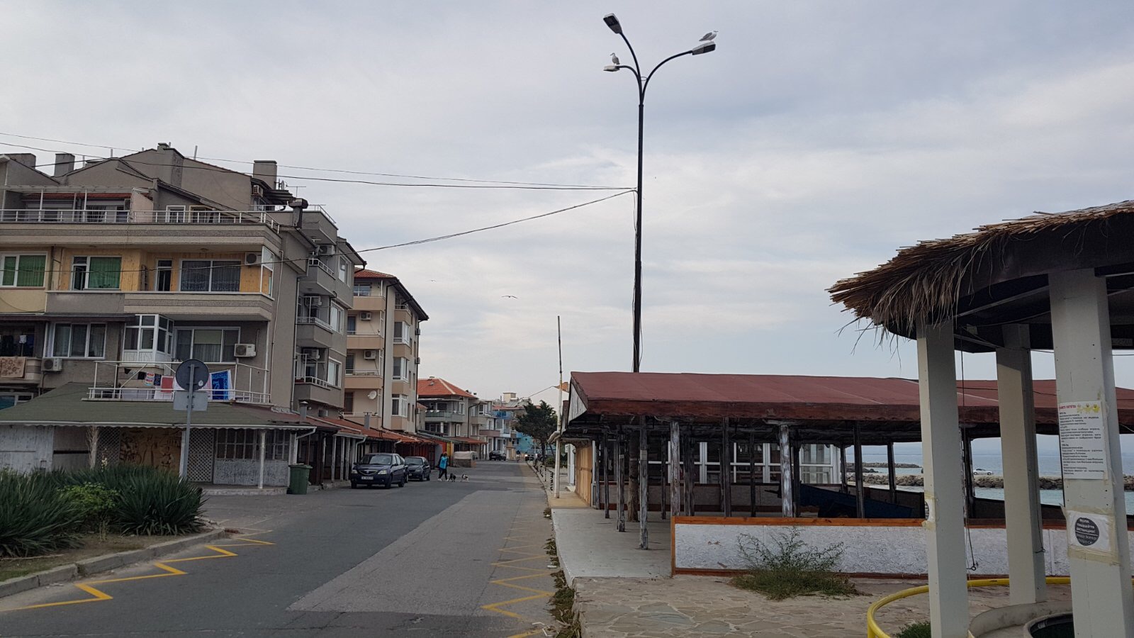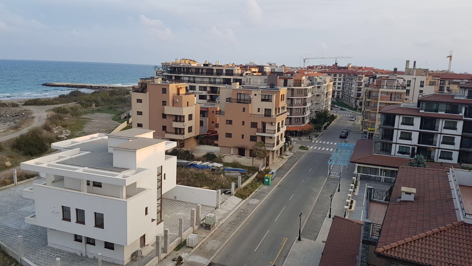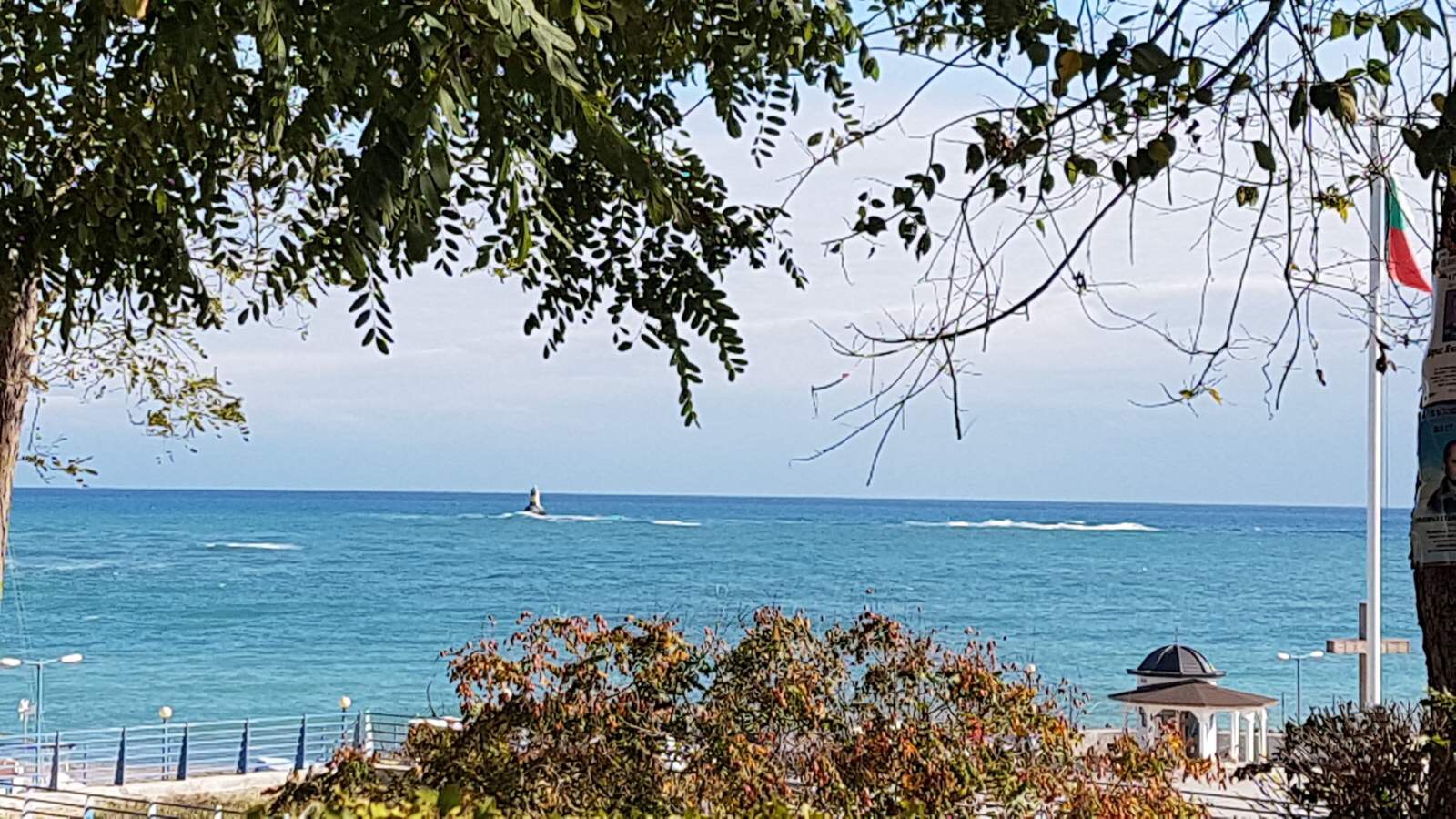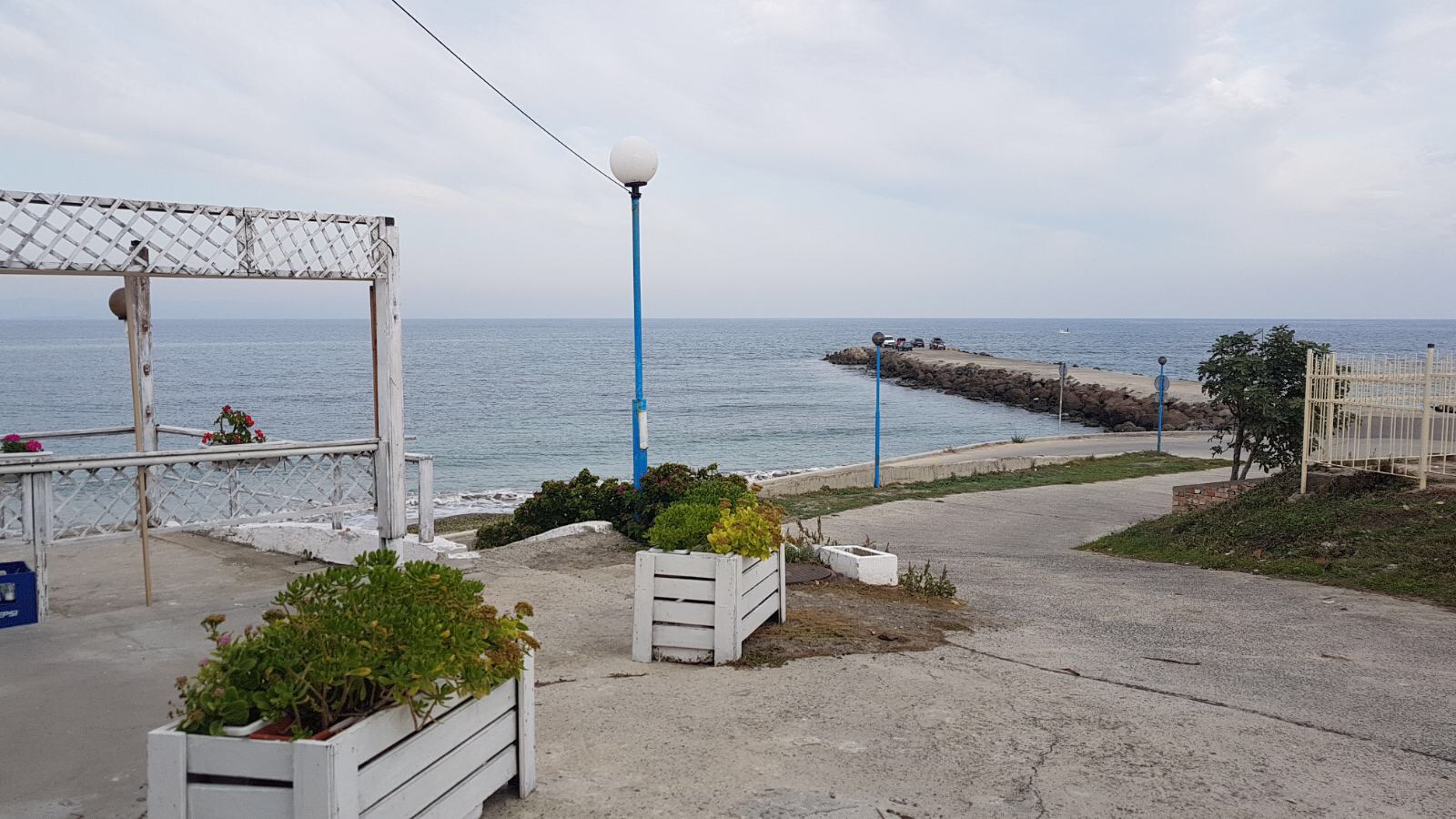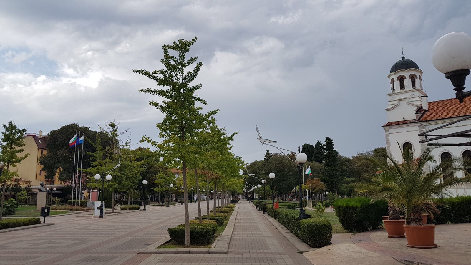 Набережная П. Яворов. Перел нами белая лестница к морю, справа впереди видно здание красивого небольшого отеля (названия не знаю), а слева напротив него ресторан Paros.