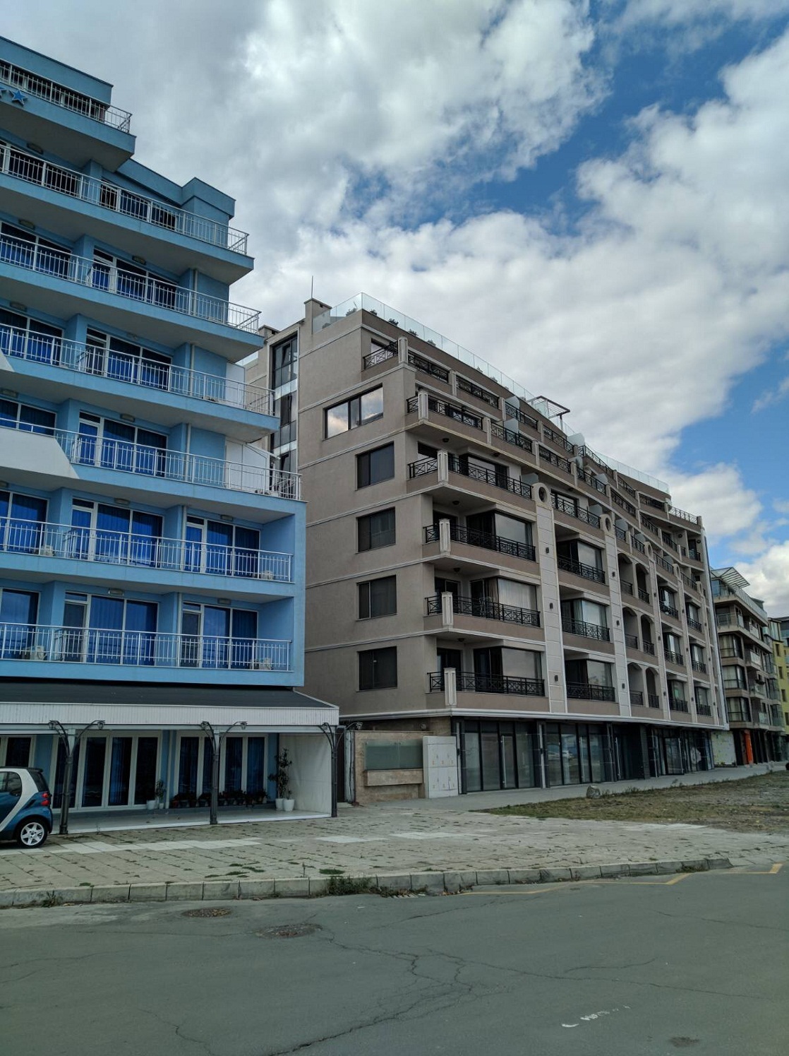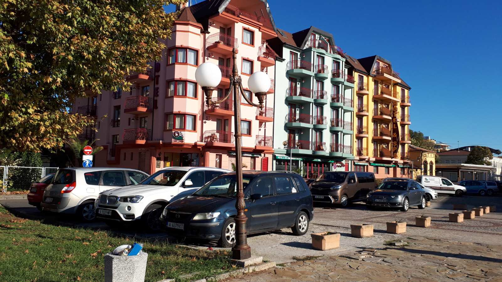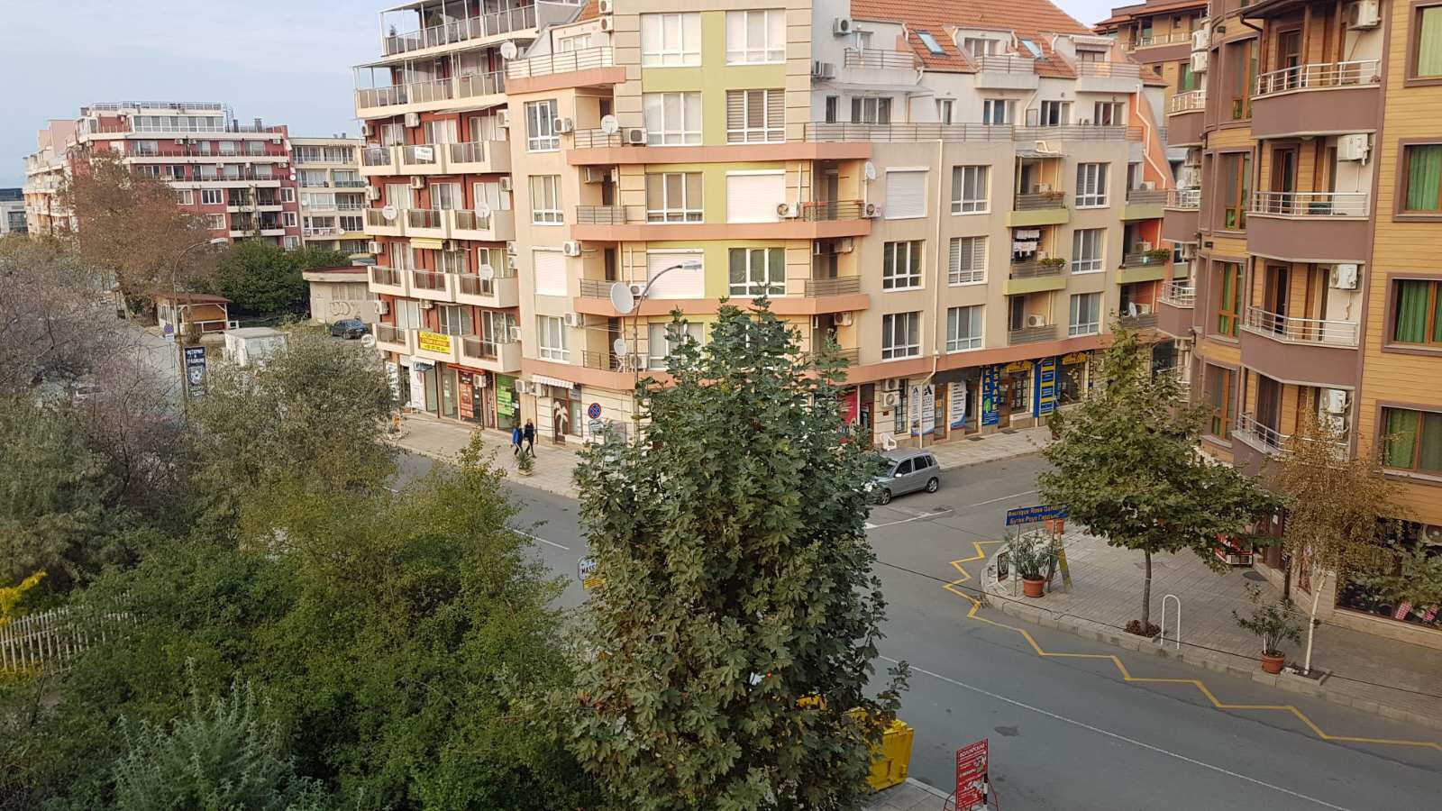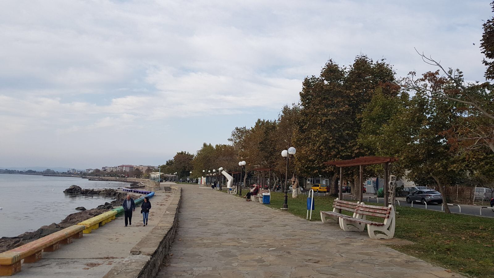 Набережная П. Яворов. Перел нами белая лестница к морю, справа впереди видно здание красивого небольшого отеля (названия не знаю), а слева напротив него ресторан Paros.