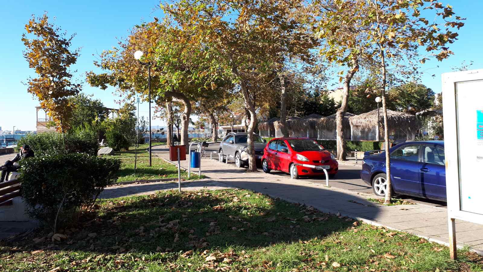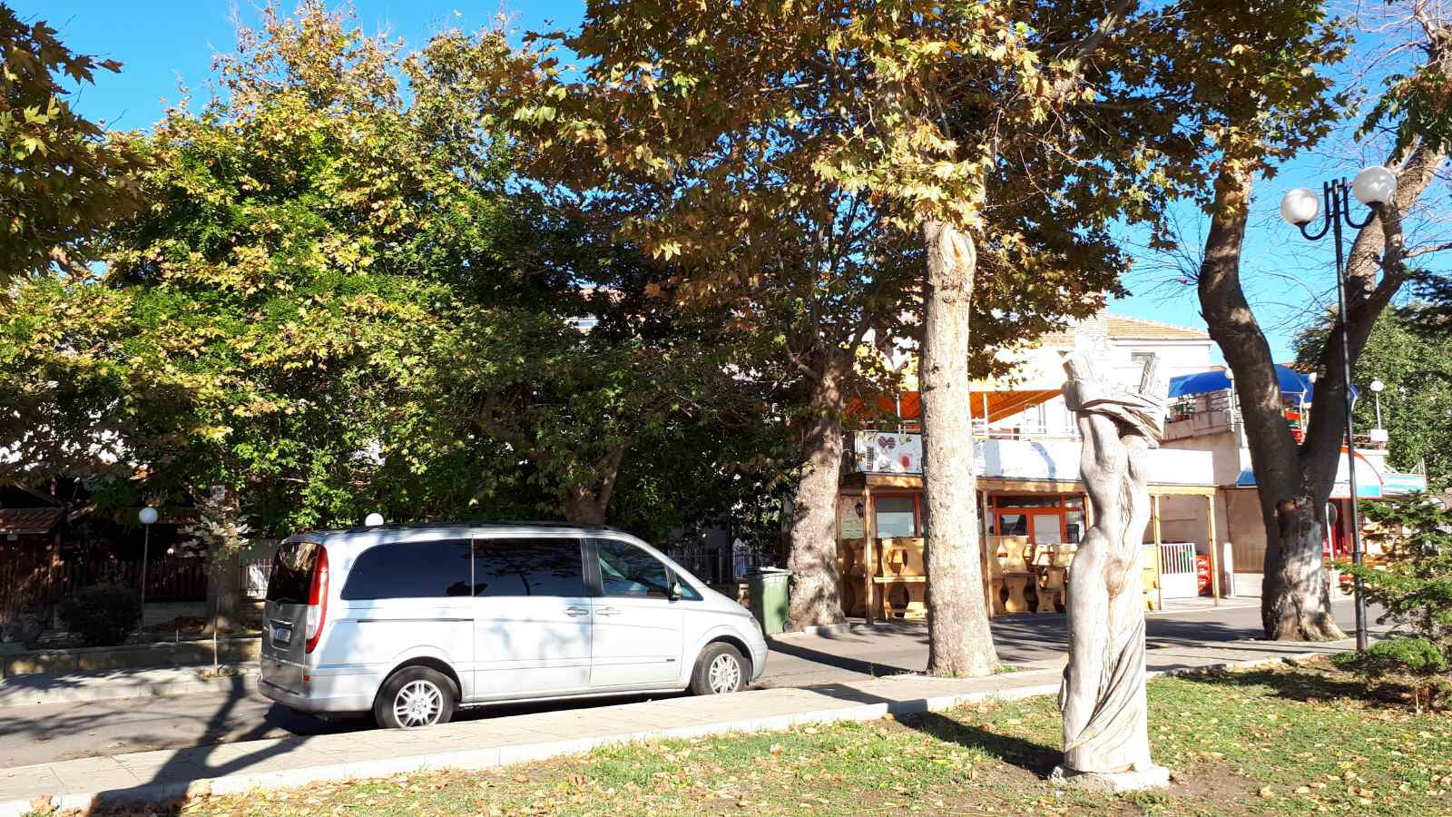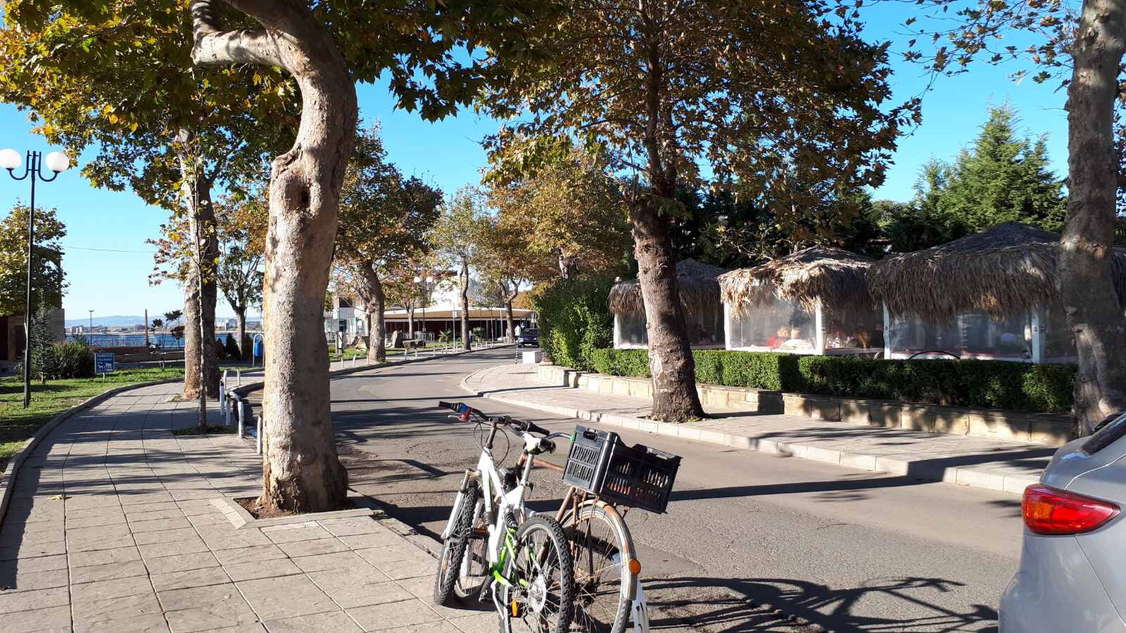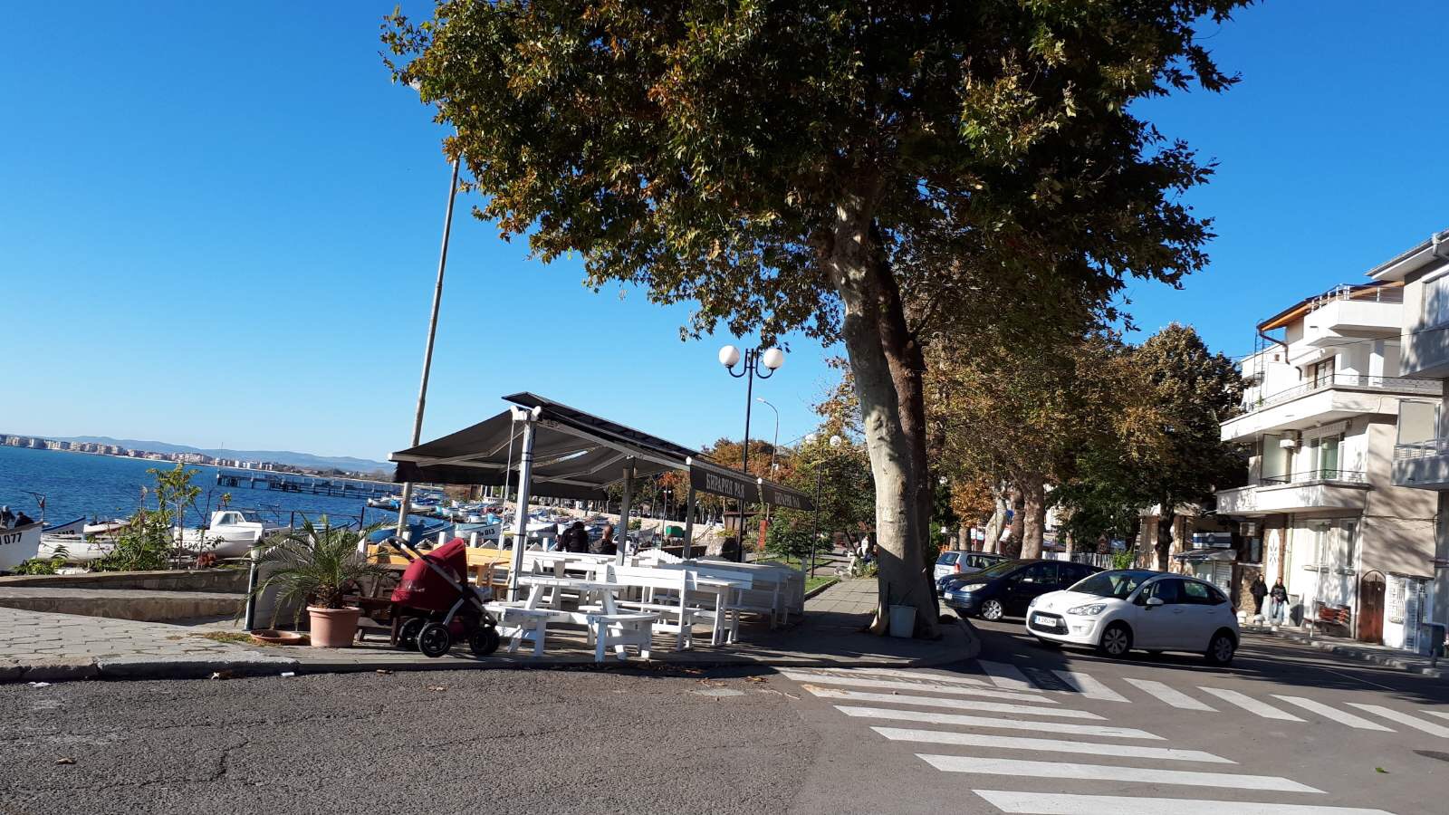 Идём по набережной дальше. Какое море синее, небо ярко голубое, лодки у берега, пустые белые столики кафешек и огромный платан на переднем плане.