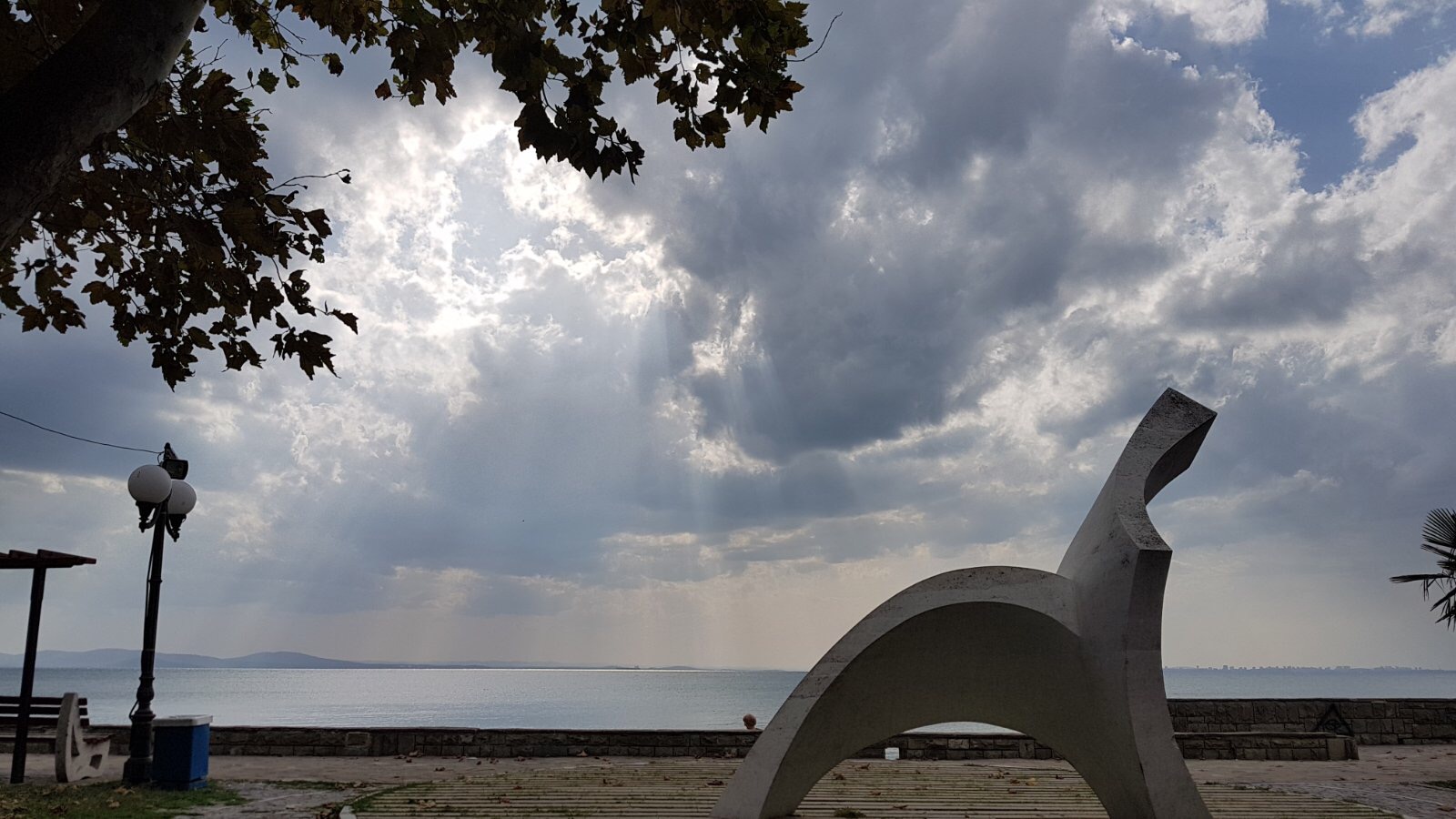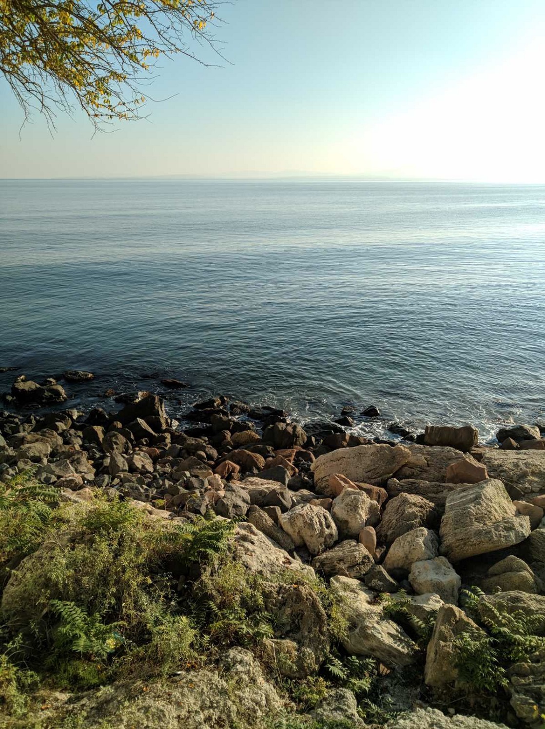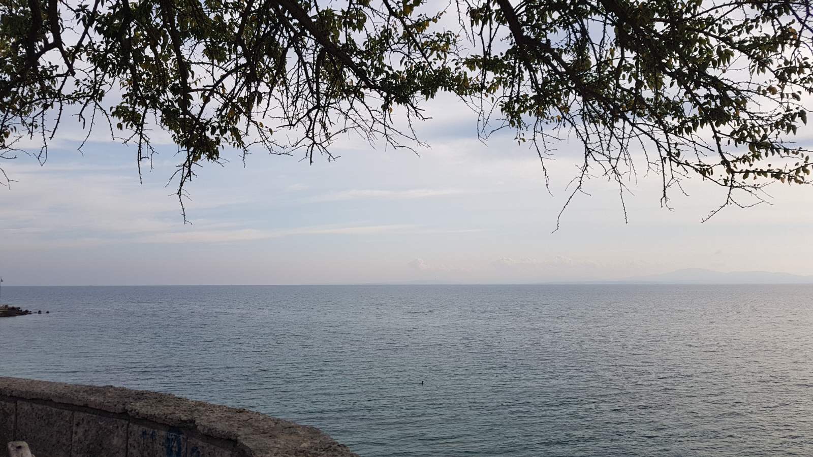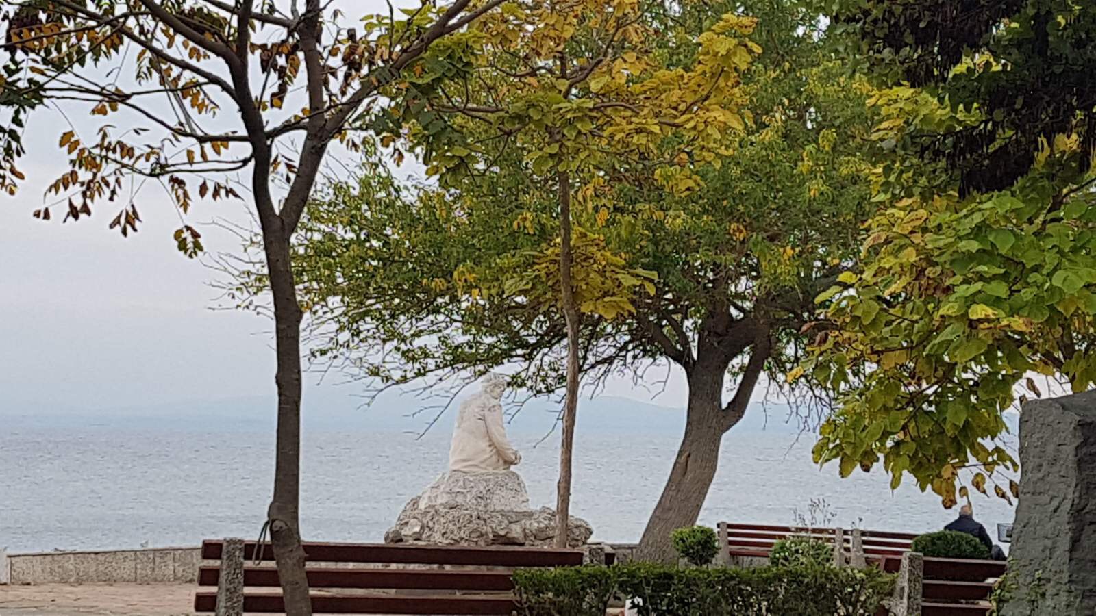 Идём по набережной дальше. Какое море синее, небо ярко голубое, лодки у берега, пустые белые столики кафешек и огромный платан на переднем плане.