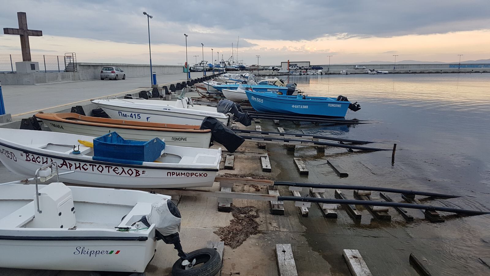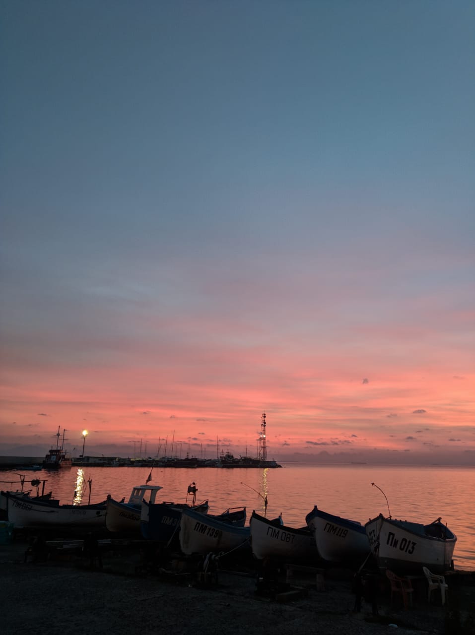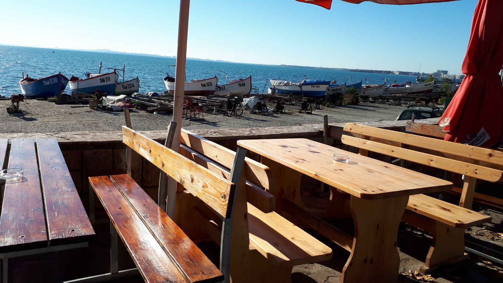 Море, Лодки и пустующие столики рыбного кафе.