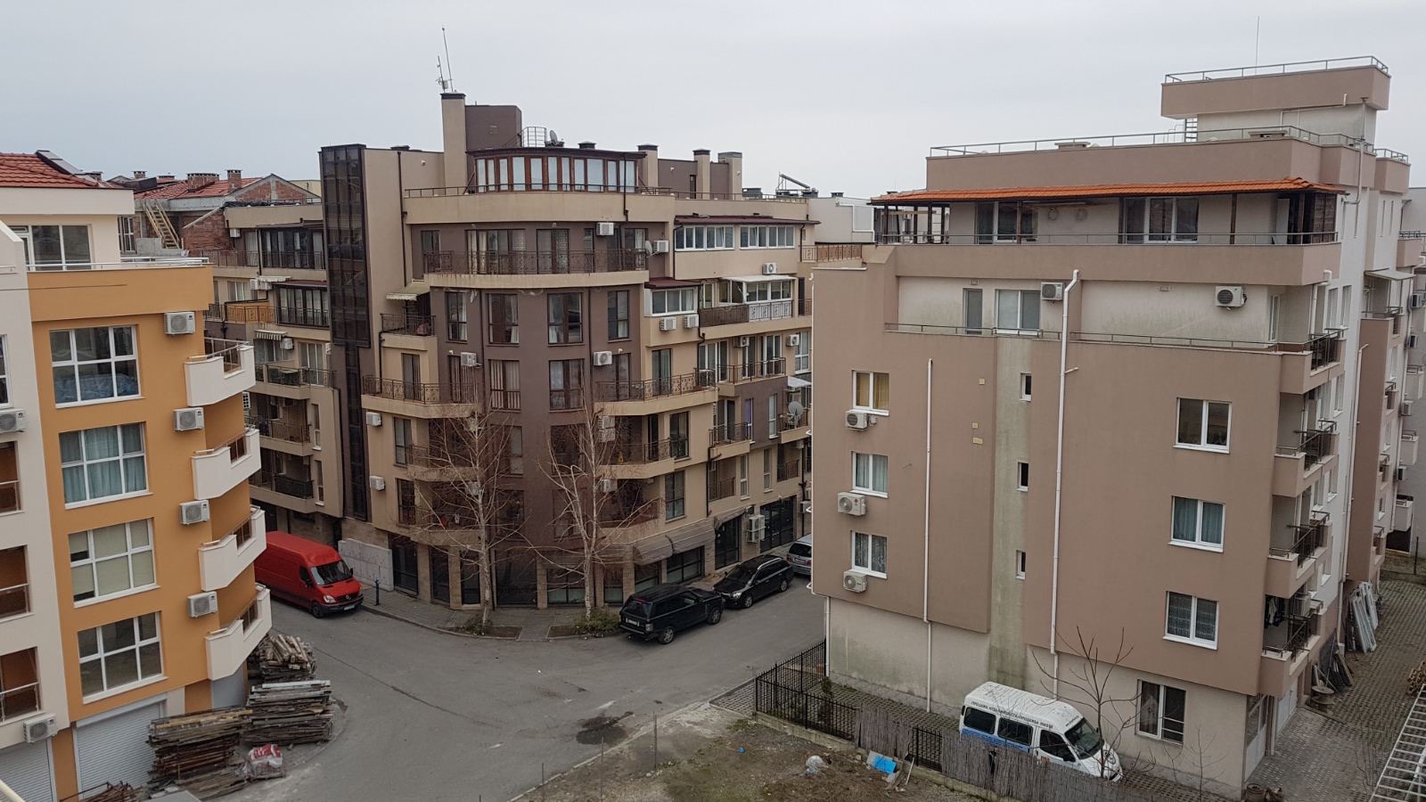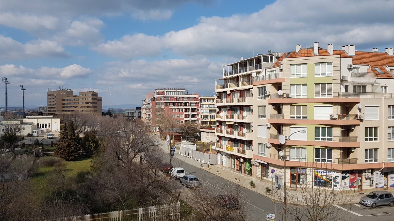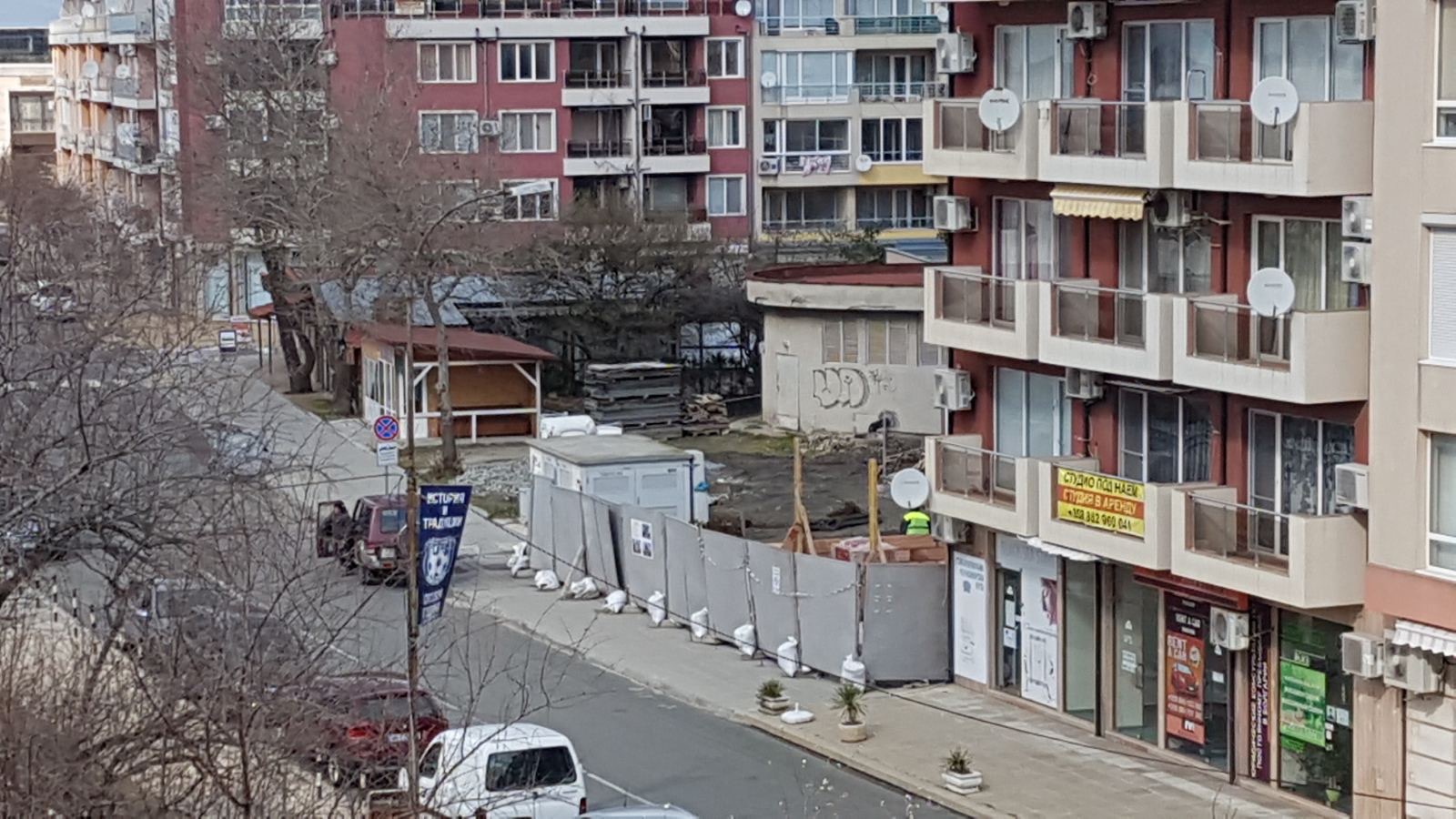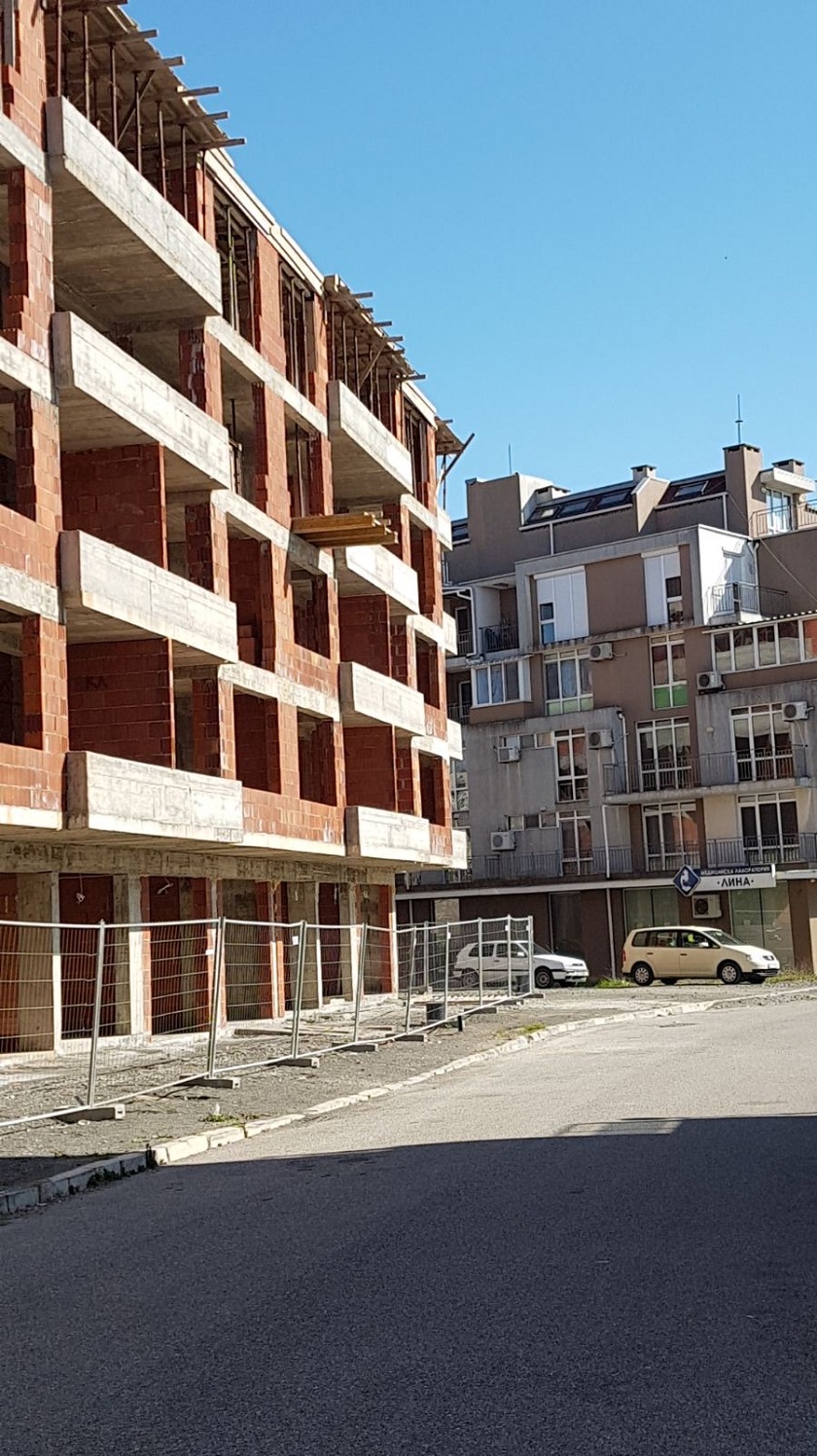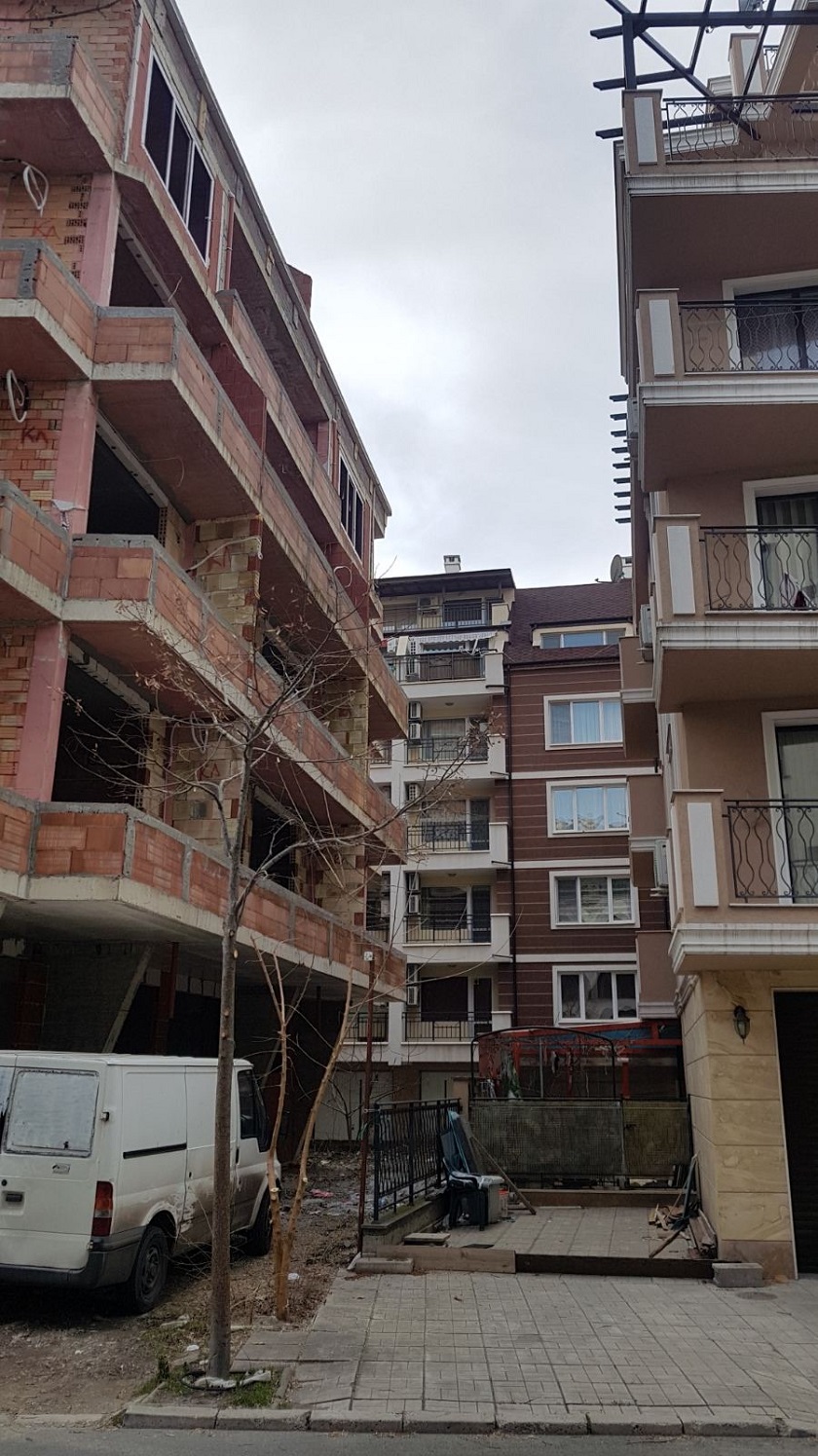 Вид в сторону ул. Цар Иван Александр. Желтый дом со светло-коричневыми балкончиками смотрится уже прямо готовым, хотя надо ещё многое доделать, помимо внешней отделки нижнего этажа.