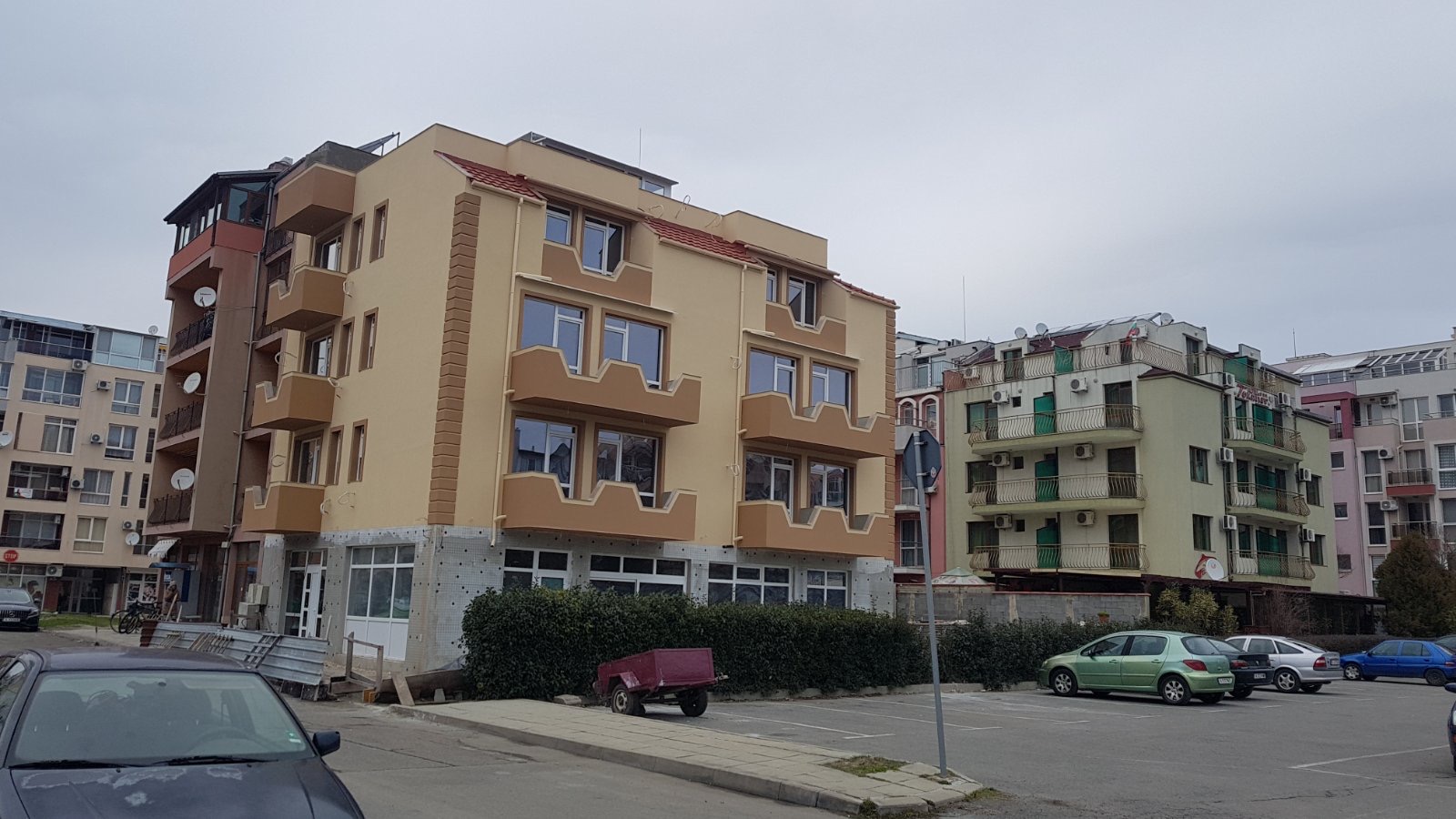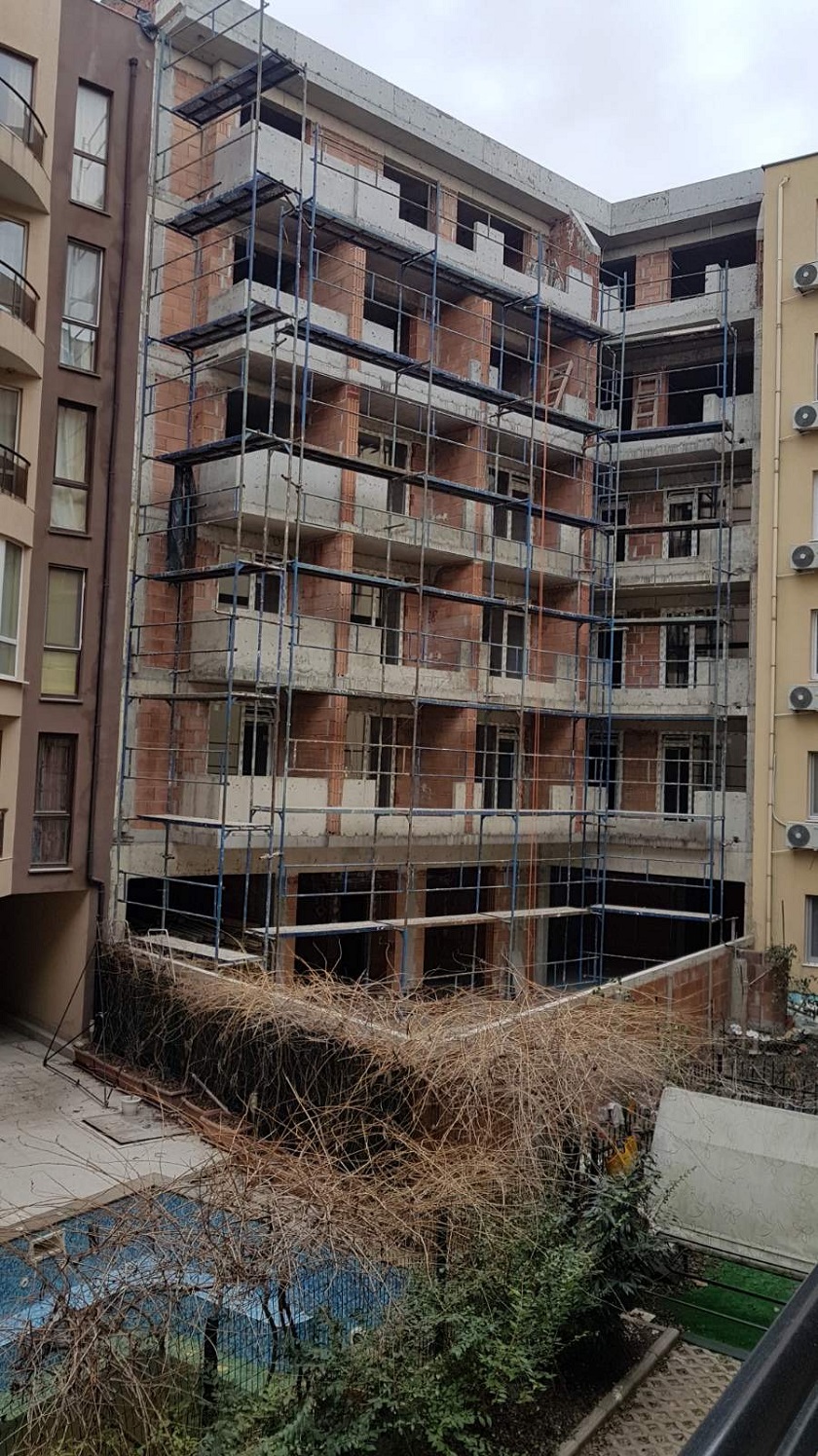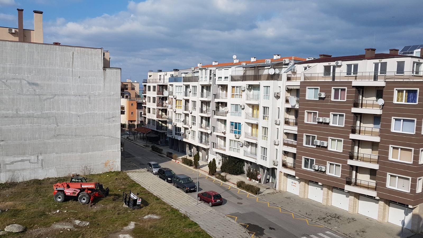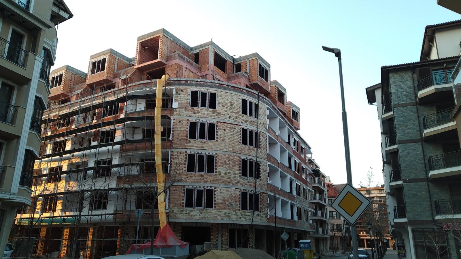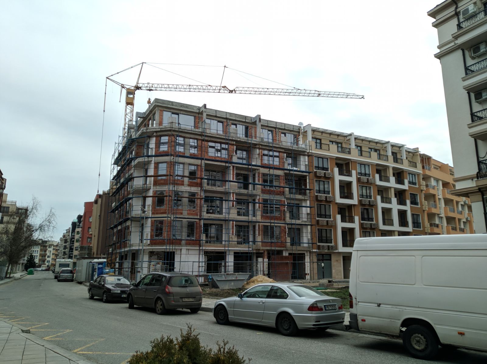 Вид в сторону ул. Цар Иван Александр. Желтый дом со светло-коричневыми балкончиками смотрится уже прямо готовым, хотя надо ещё многое доделать, помимо внешней отделки нижнего этажа.