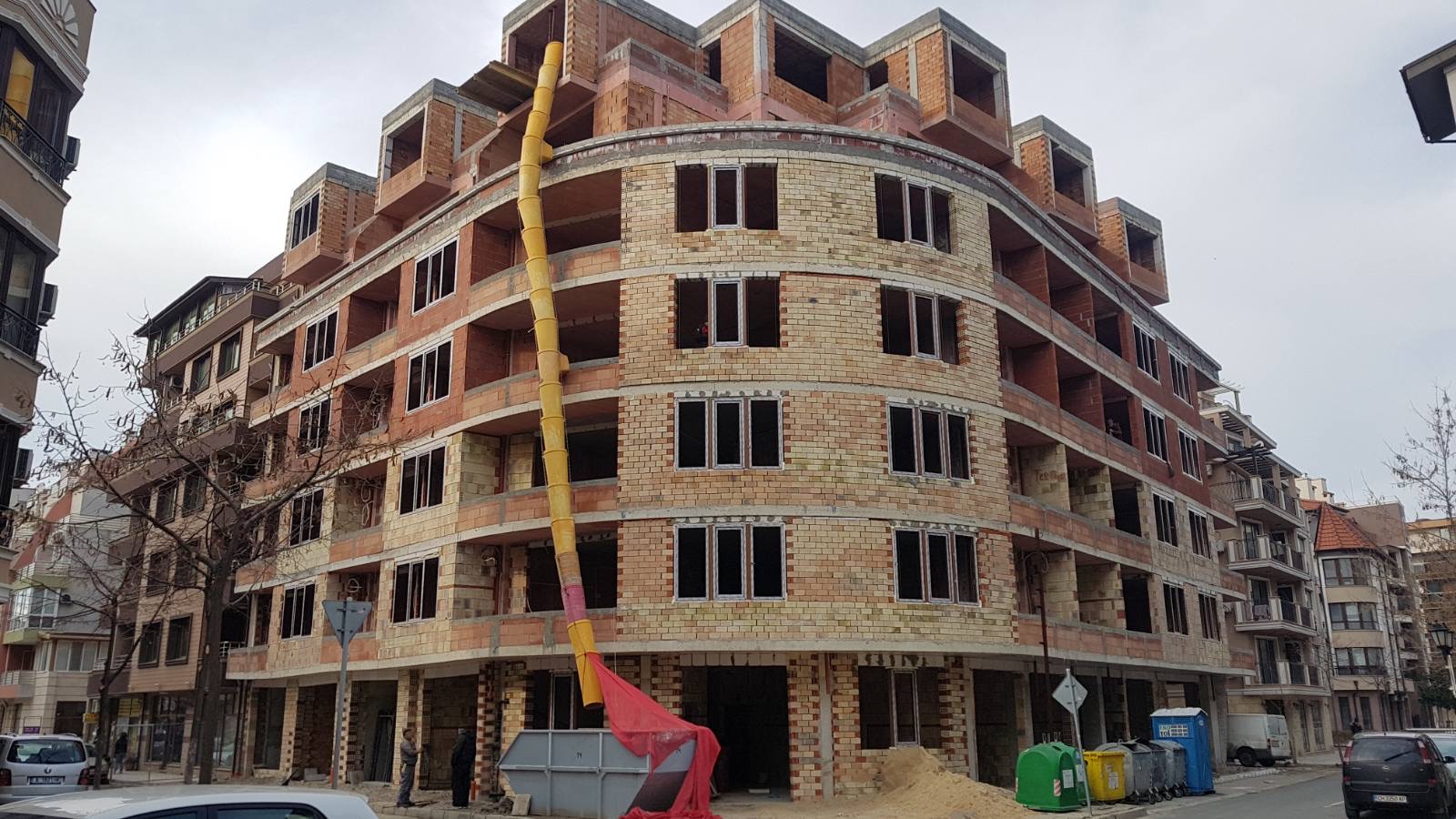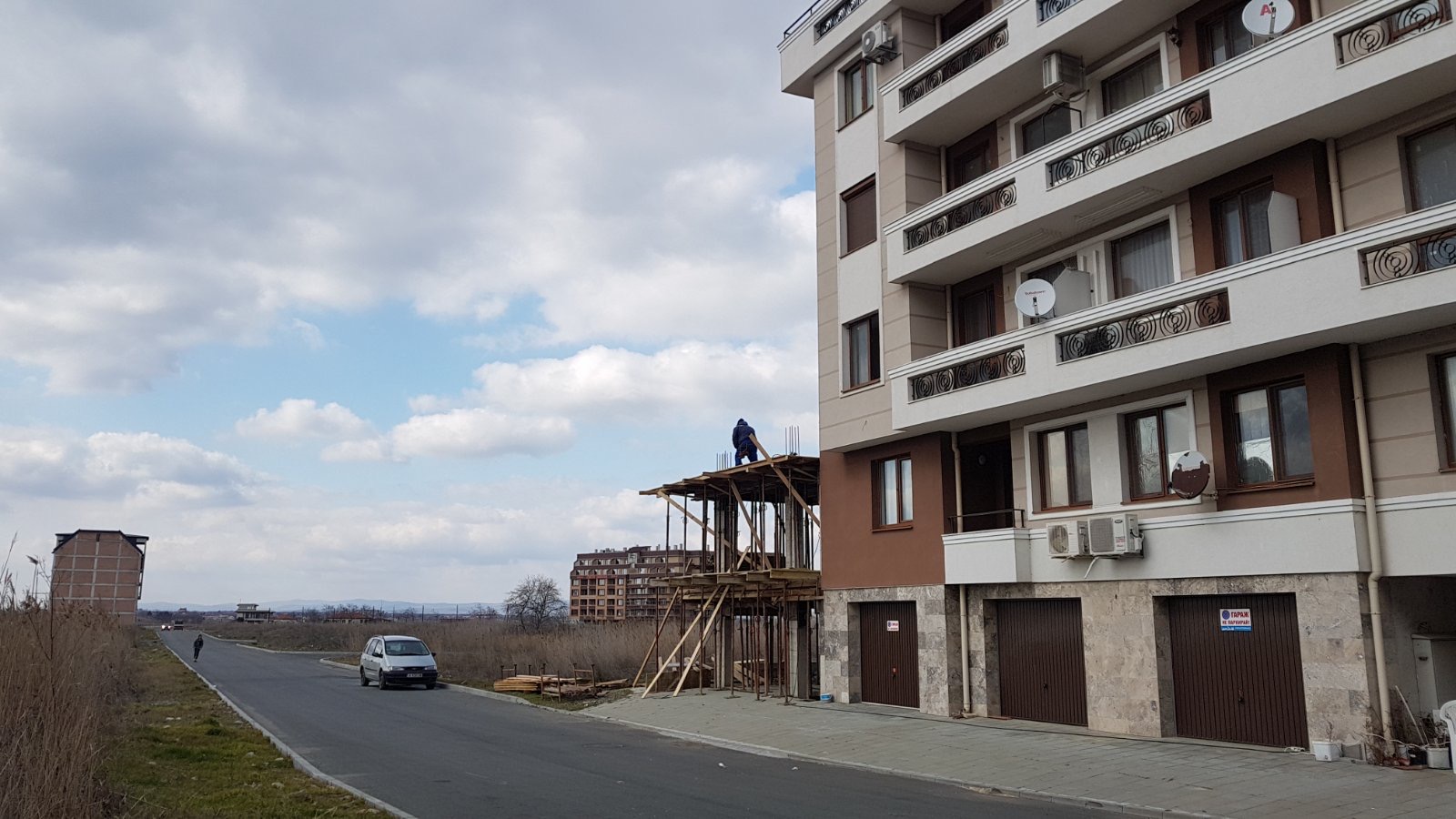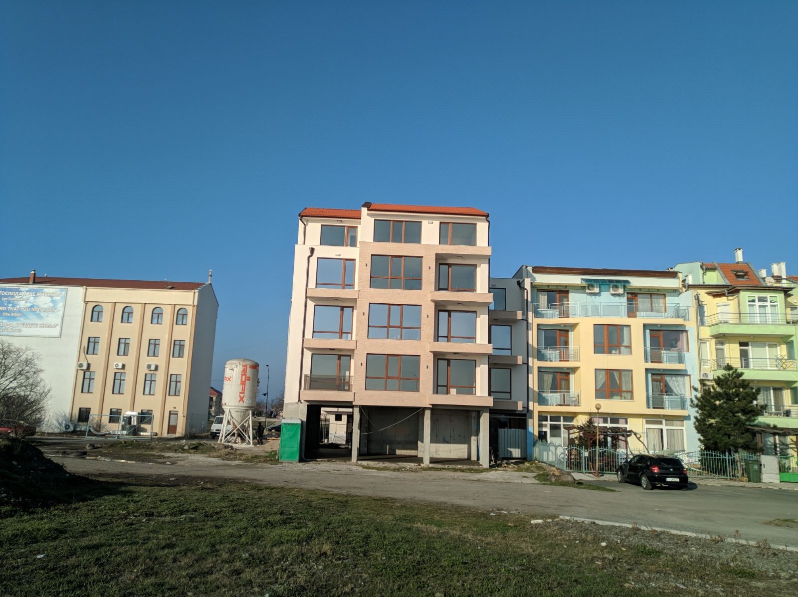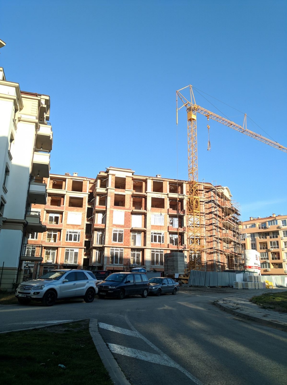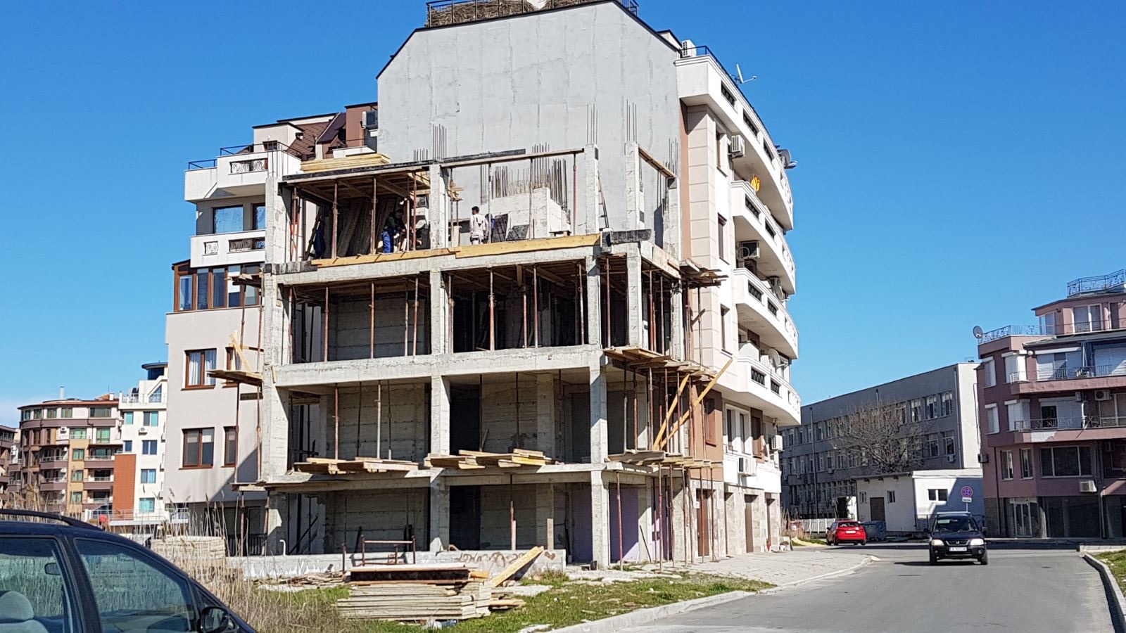 Вид в сторону ул. Цар Иван Александр. Желтый дом со светло-коричневыми балкончиками смотрится уже прямо готовым, хотя надо ещё многое доделать, помимо внешней отделки нижнего этажа.