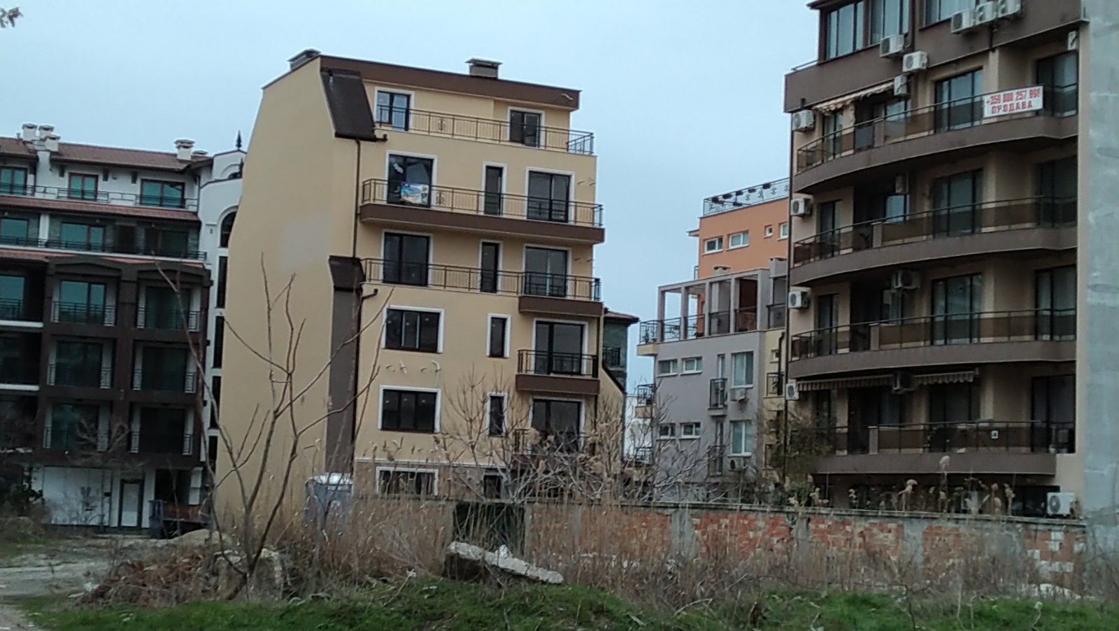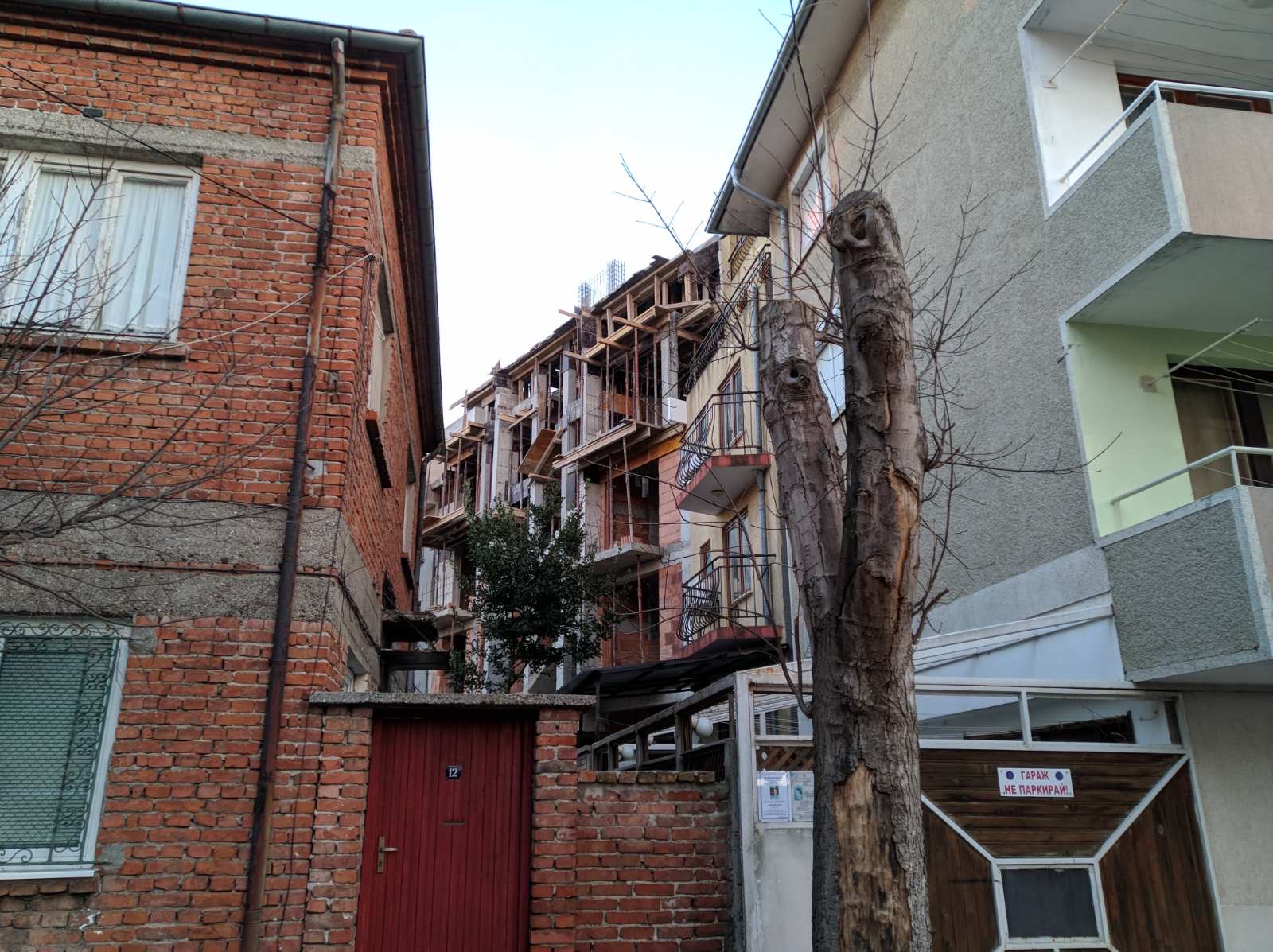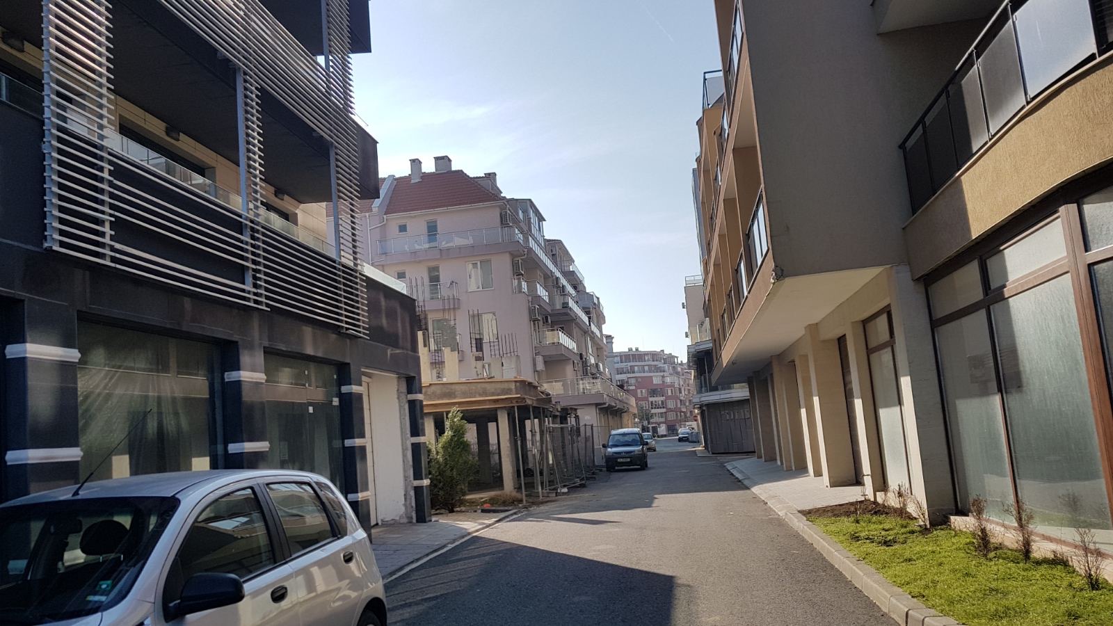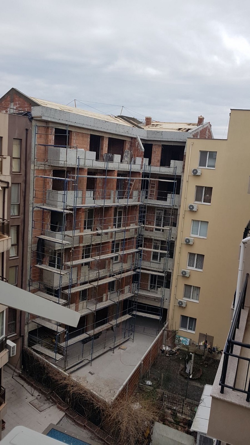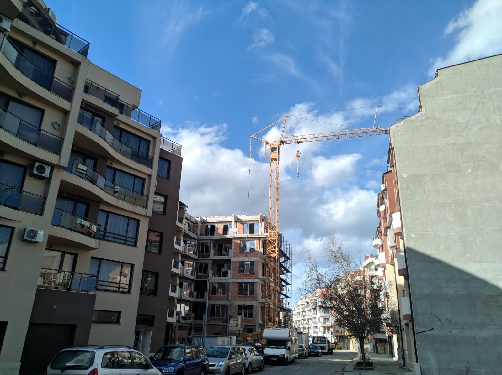 Вид в сторону ул. Цар Иван Александр. Желтый дом со светло-коричневыми балкончиками смотрится уже прямо готовым, хотя надо ещё многое доделать, помимо внешней отделки нижнего этажа.