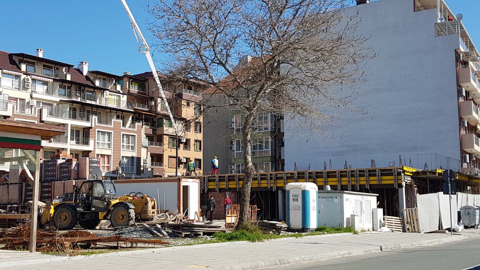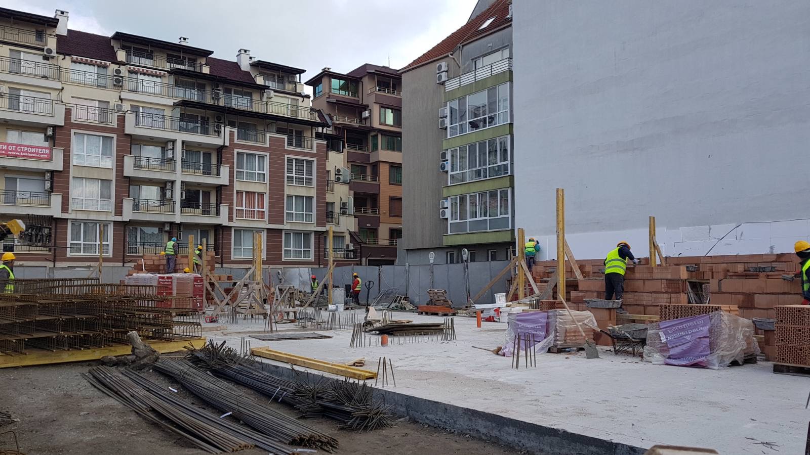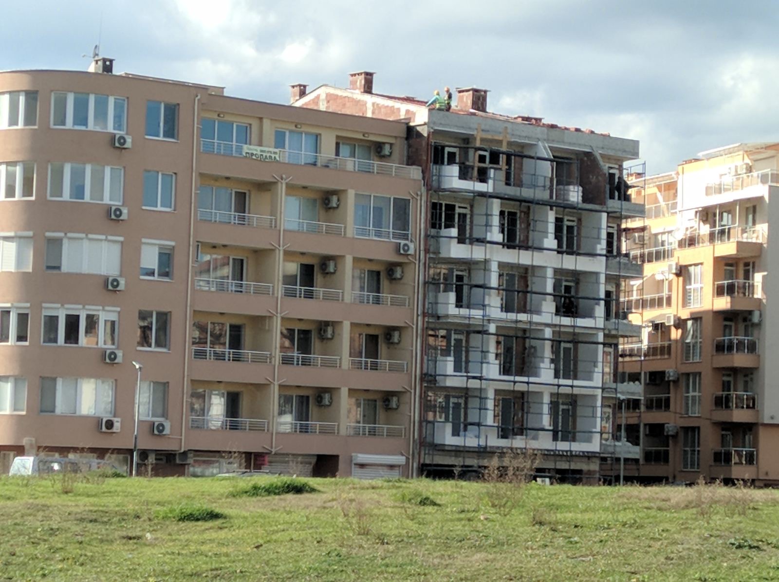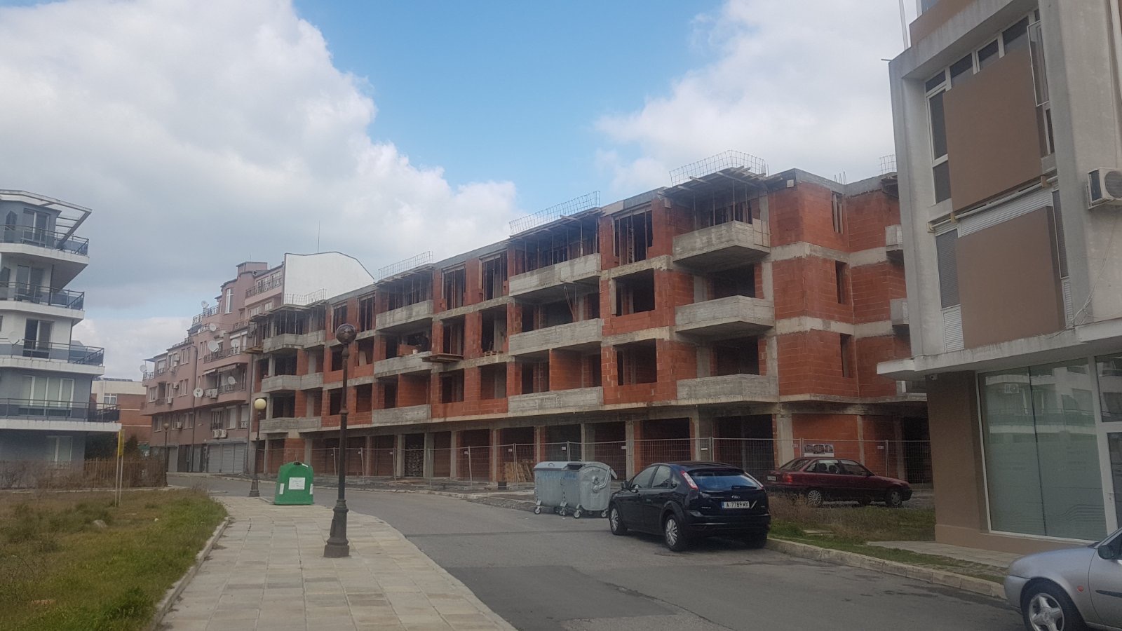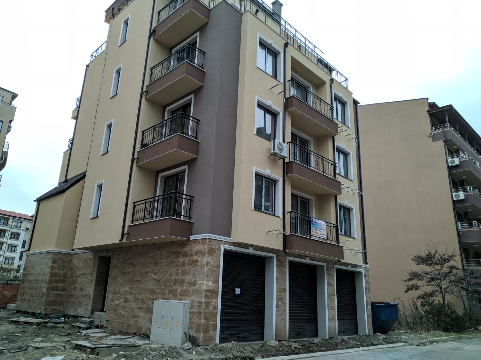 Вид в сторону ул. Цар Иван Александр. Желтый дом со светло-коричневыми балкончиками смотрится уже прямо готовым, хотя надо ещё многое доделать, помимо внешней отделки нижнего этажа.