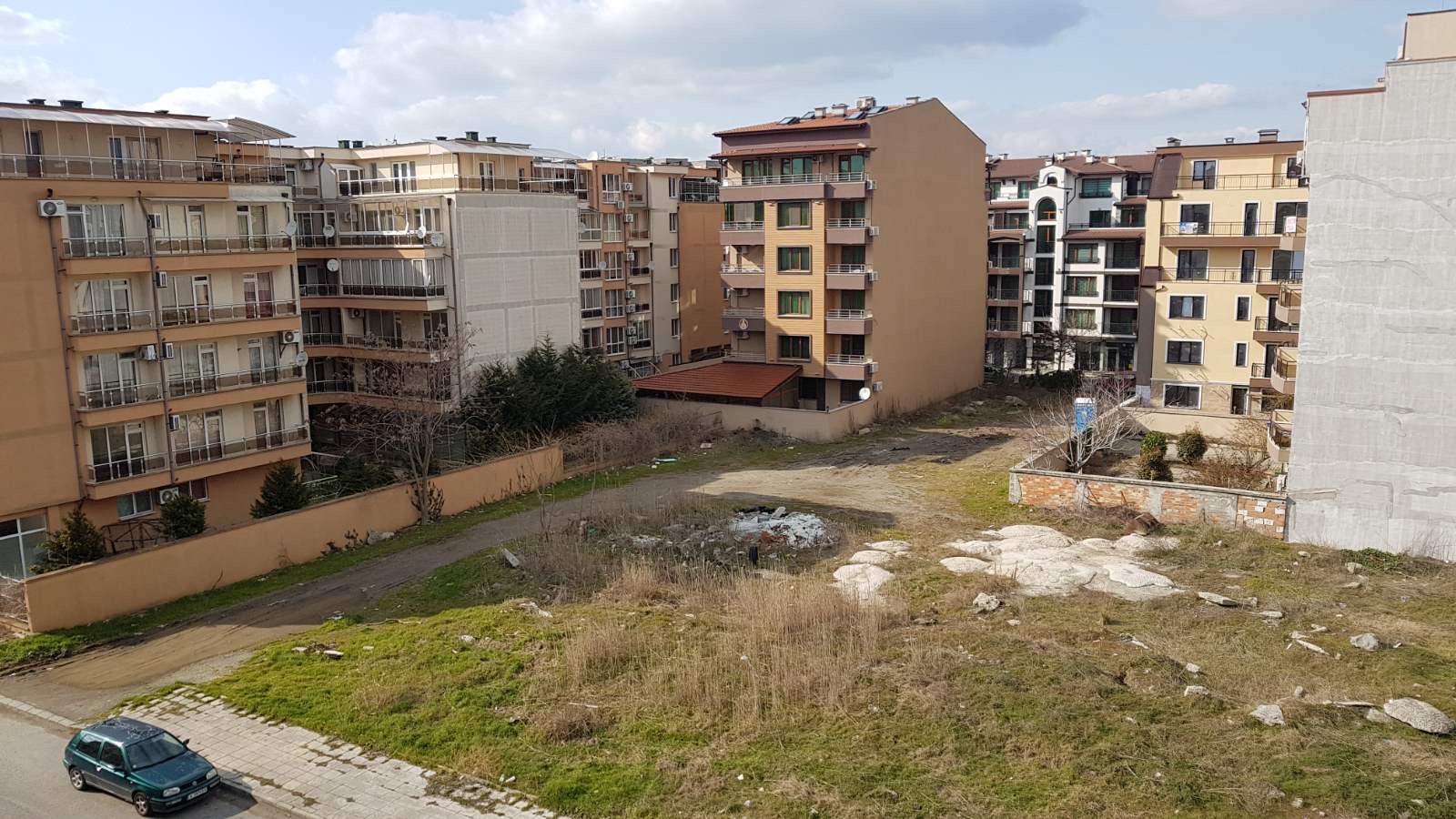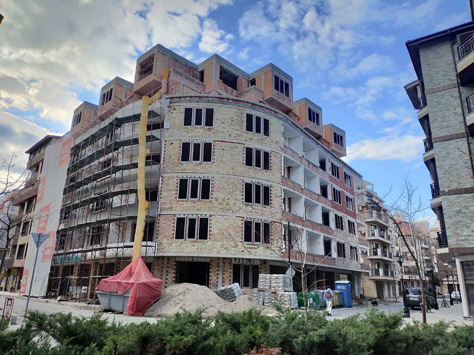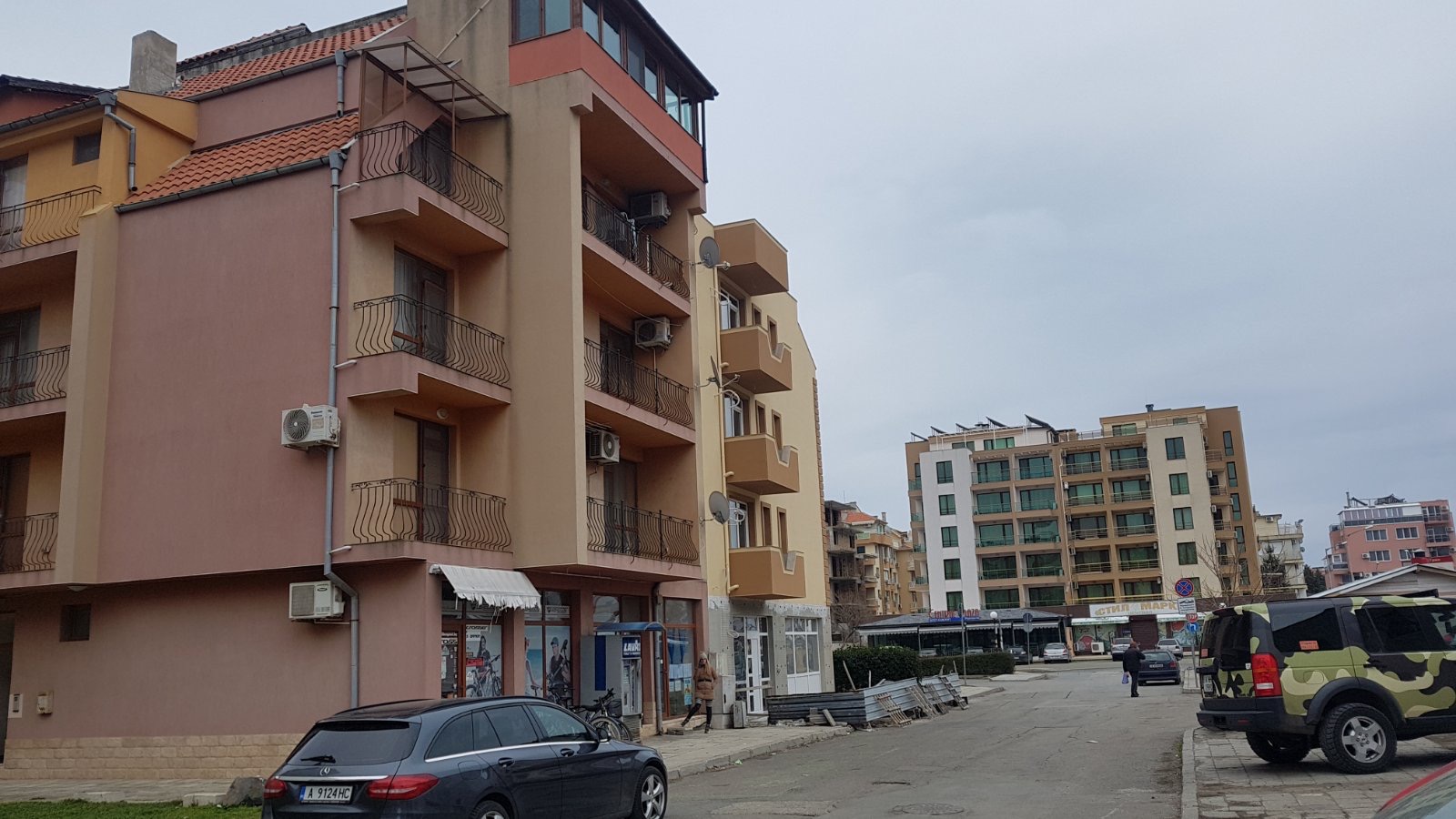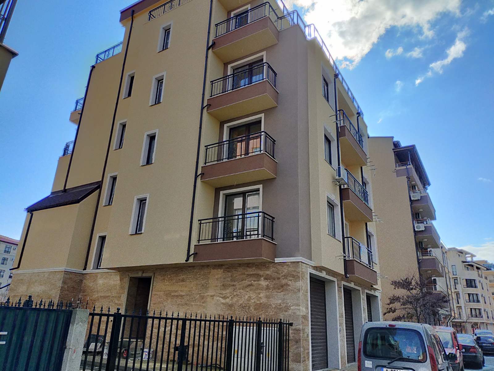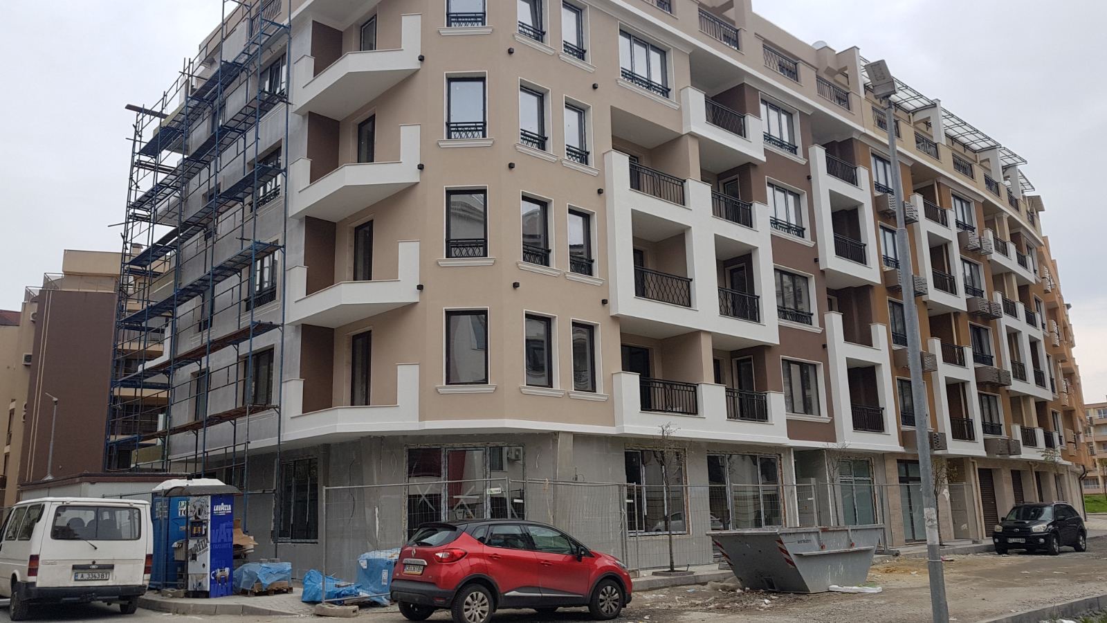 Вид в сторону ул. Цар Иван Александр. Желтый дом со светло-коричневыми балкончиками смотрится уже прямо готовым, хотя надо ещё многое доделать, помимо внешней отделки нижнего этажа.