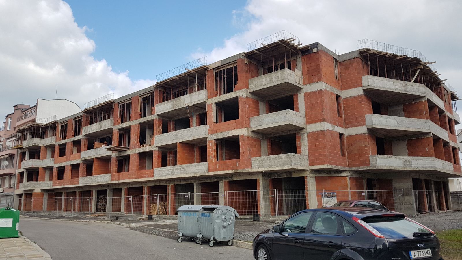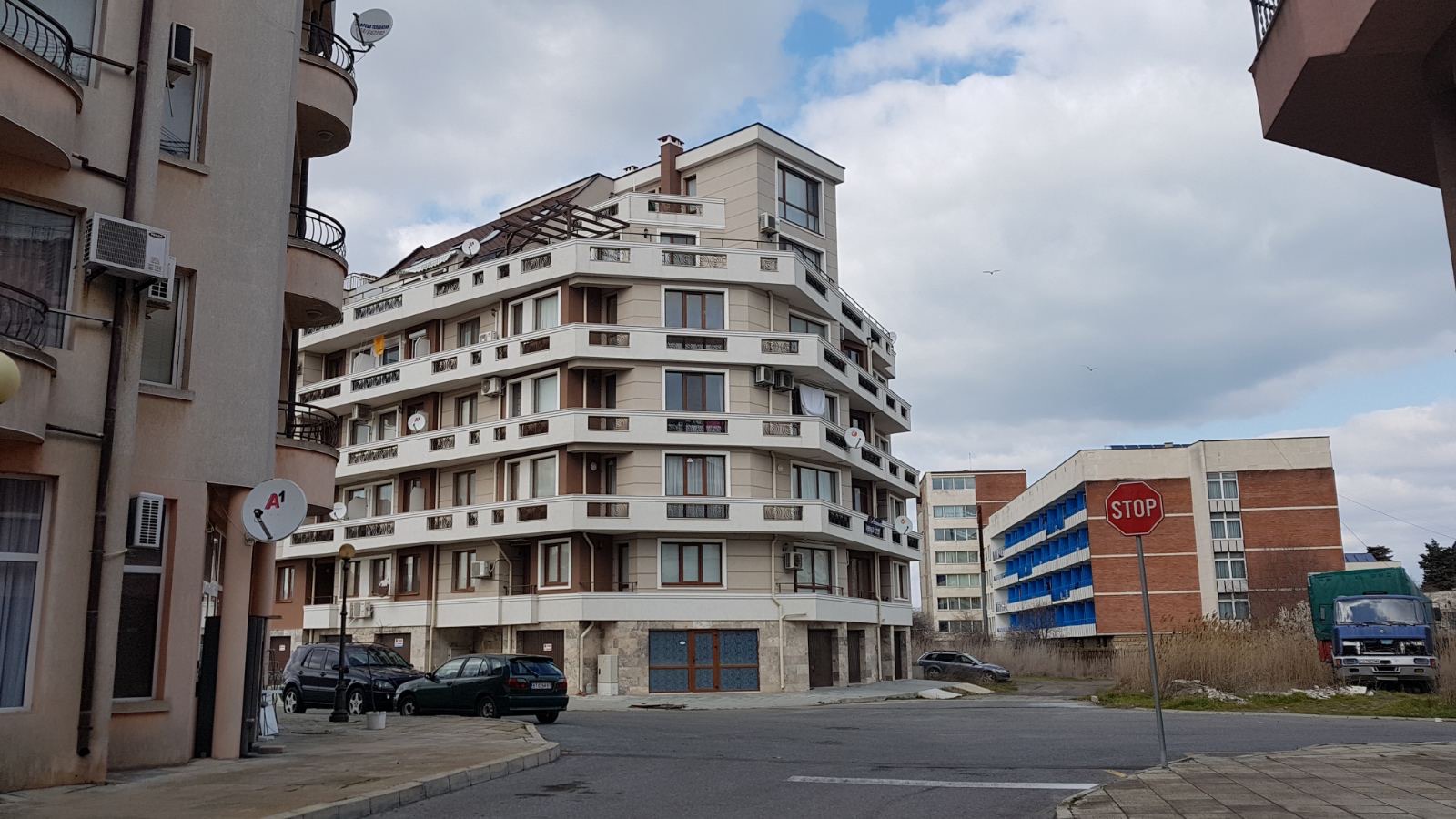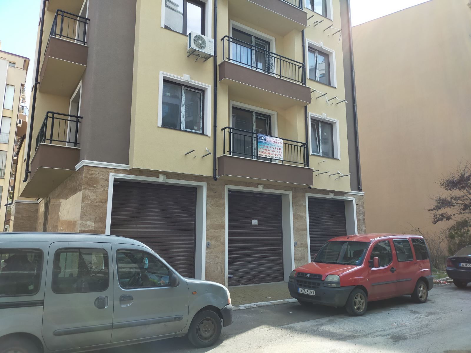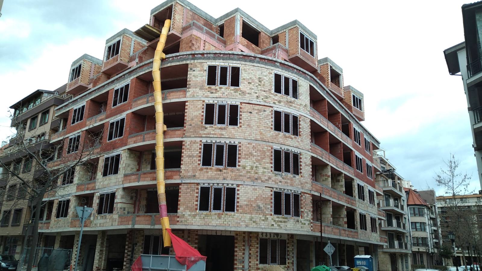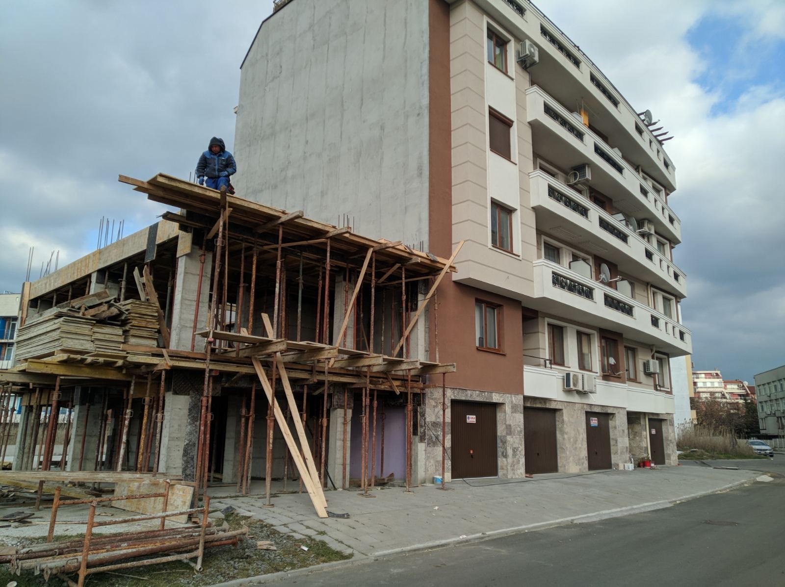 Вид в сторону ул. Цар Иван Александр. Желтый дом со светло-коричневыми балкончиками смотрится уже прямо готовым, хотя надо ещё многое доделать, помимо внешней отделки нижнего этажа.