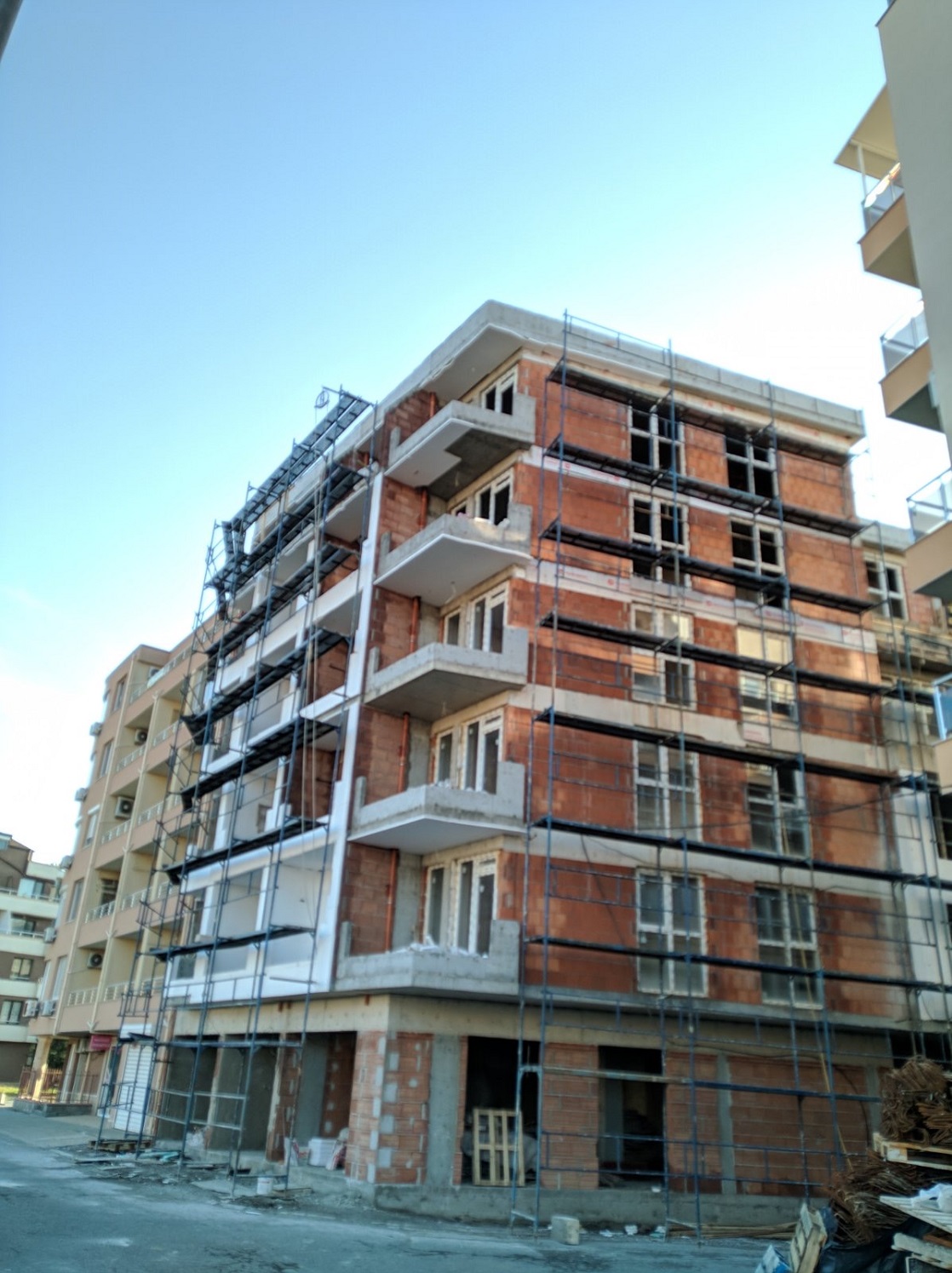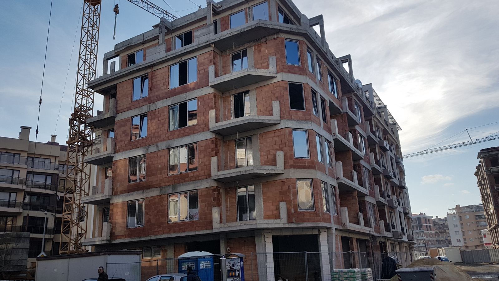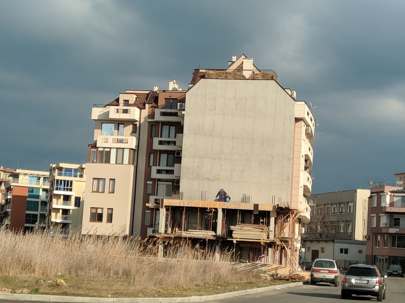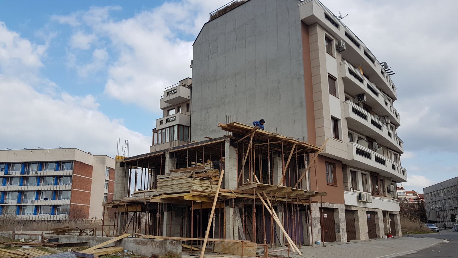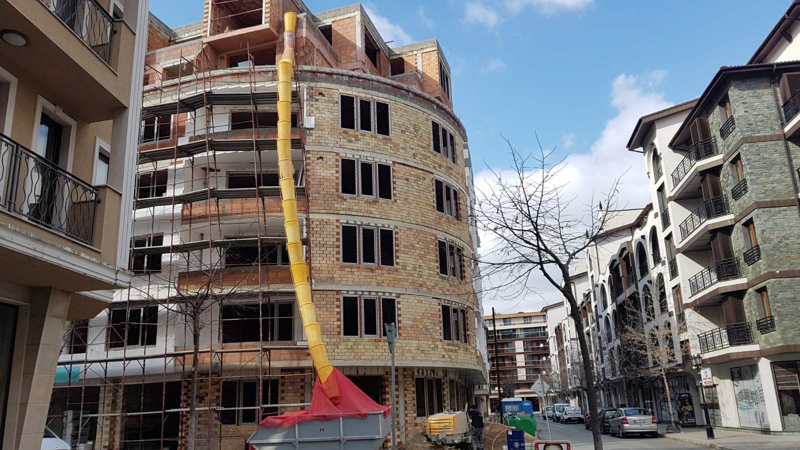 Вид в сторону ул. Цар Иван Александр. Желтый дом со светло-коричневыми балкончиками смотрится уже прямо готовым, хотя надо ещё многое доделать, помимо внешней отделки нижнего этажа.