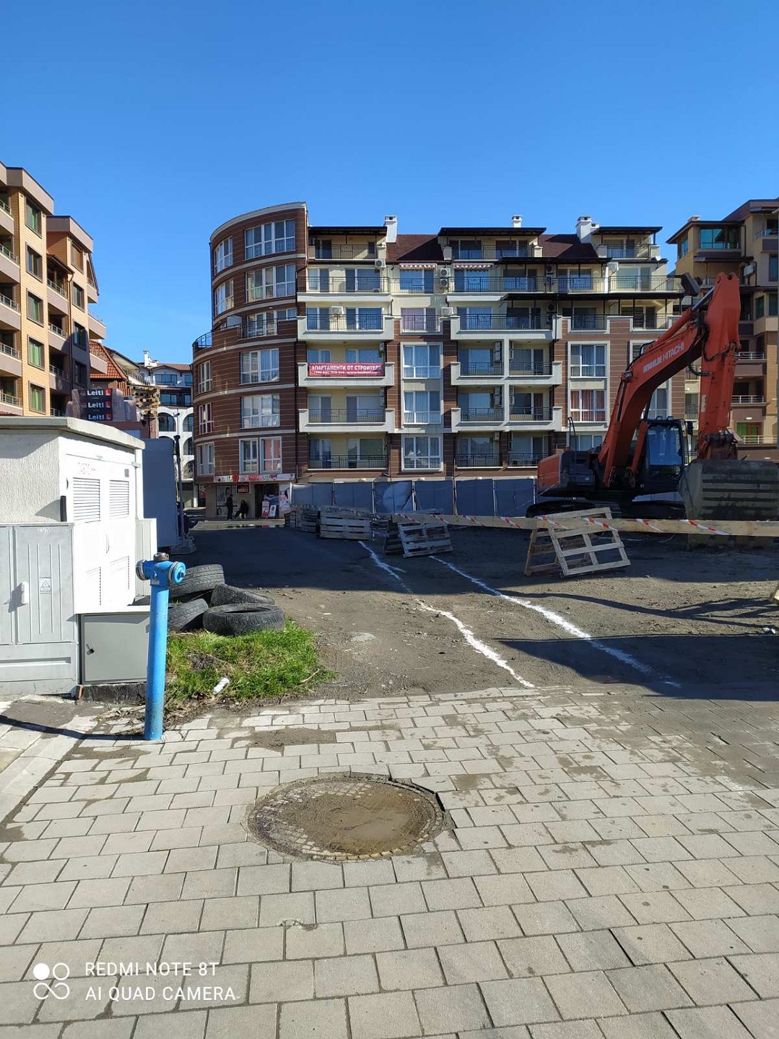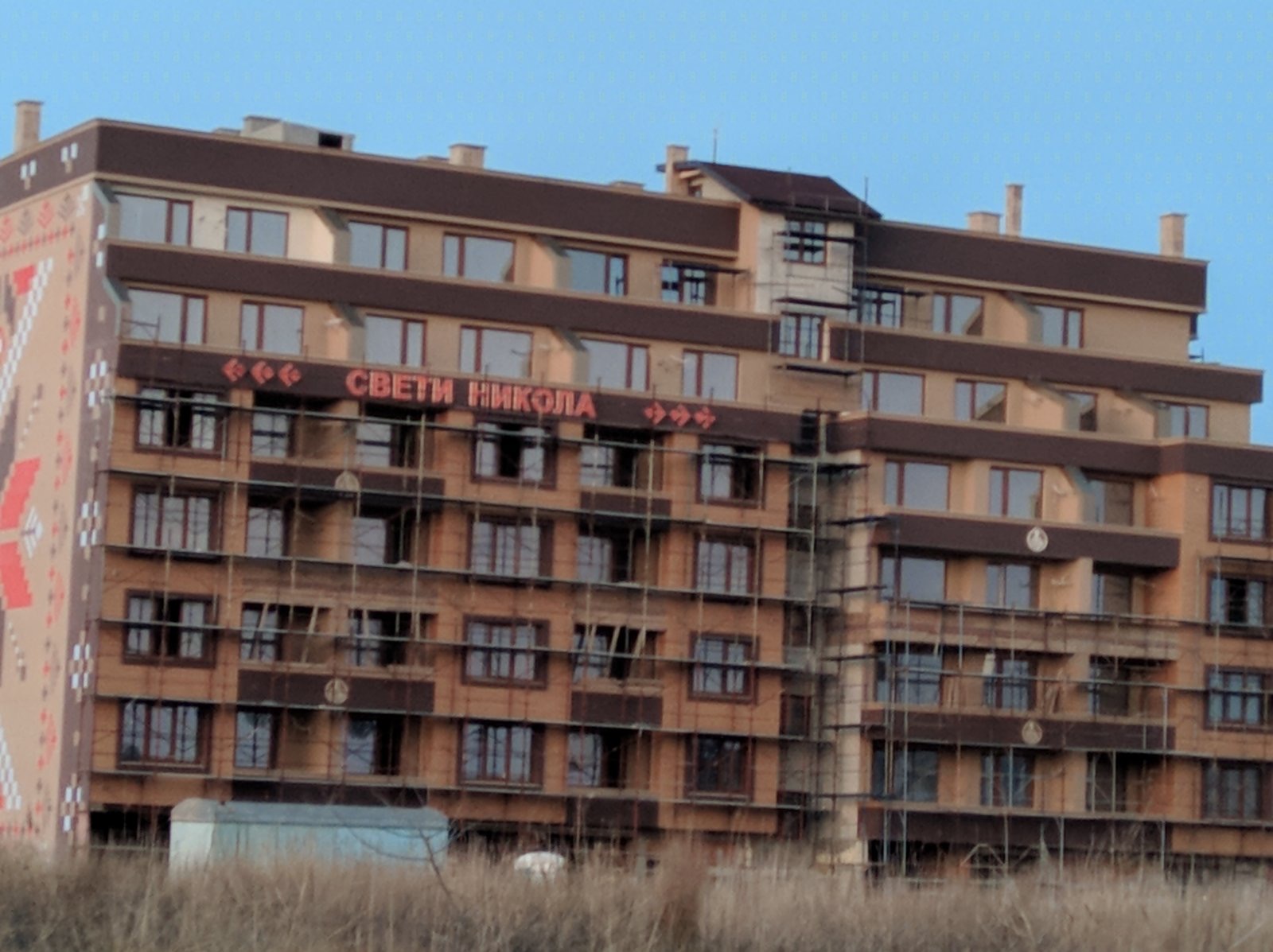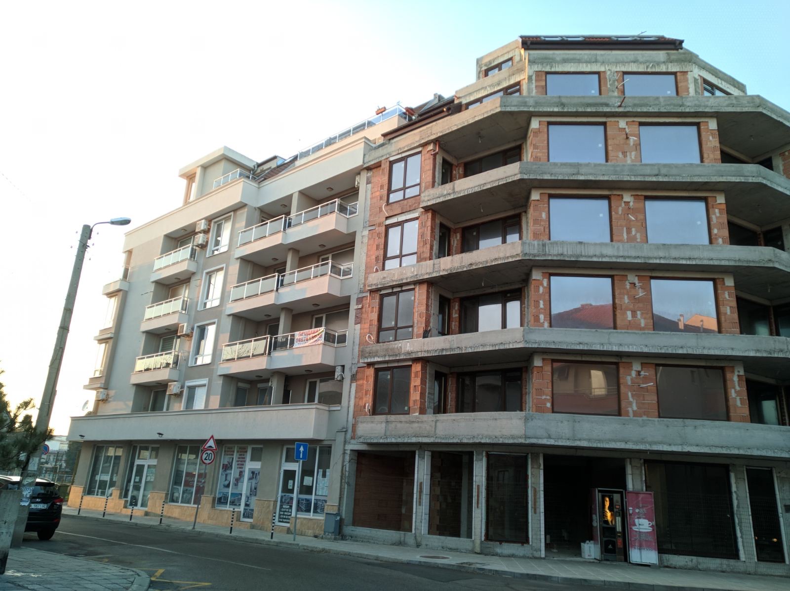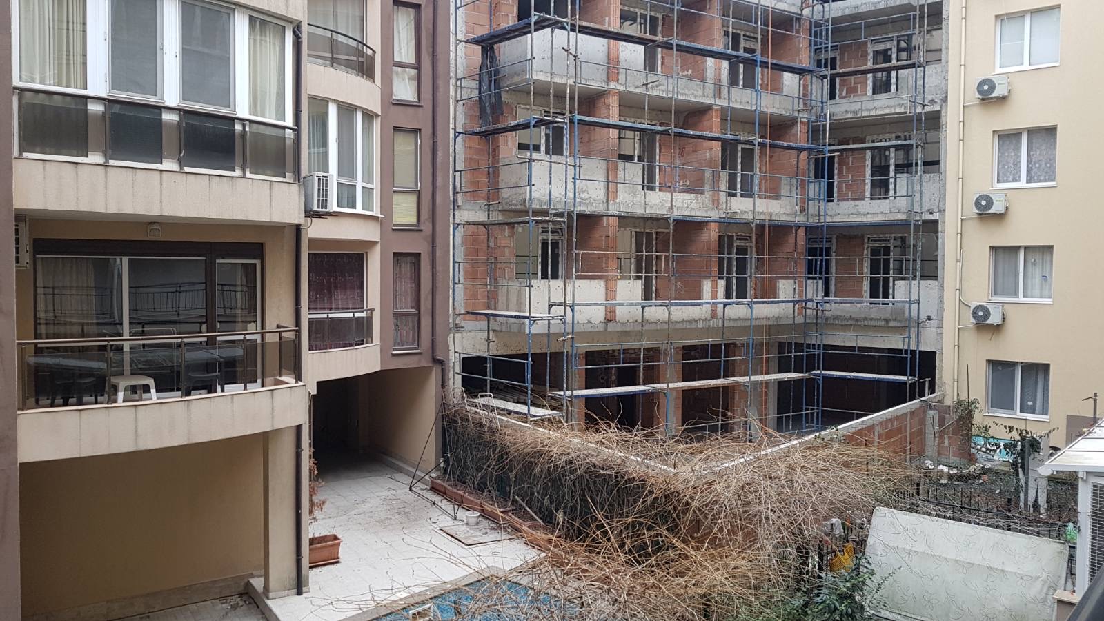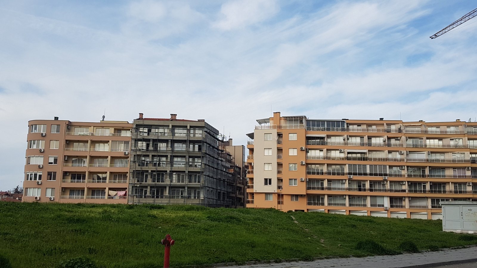 Вид в сторону ул. Цар Иван Александр. Желтый дом со светло-коричневыми балкончиками смотрится уже прямо готовым, хотя надо ещё многое доделать, помимо внешней отделки нижнего этажа.