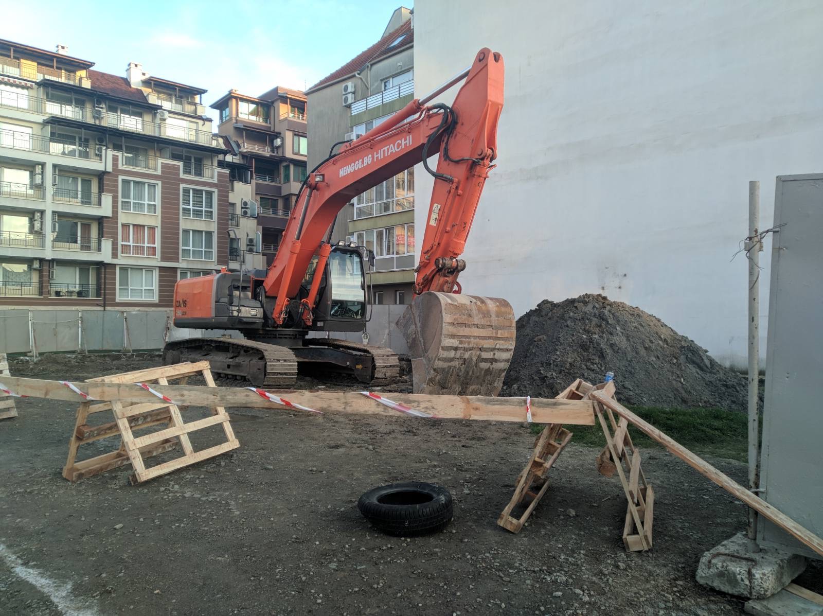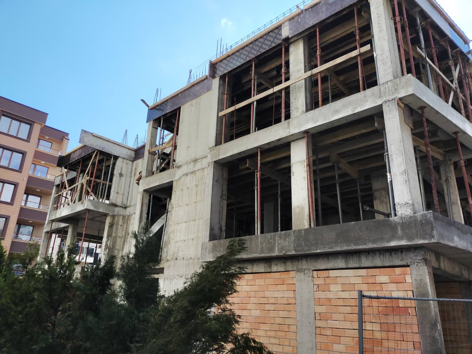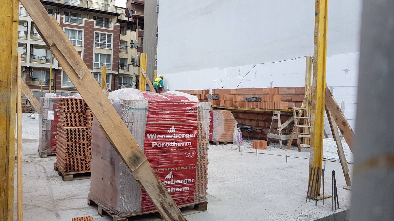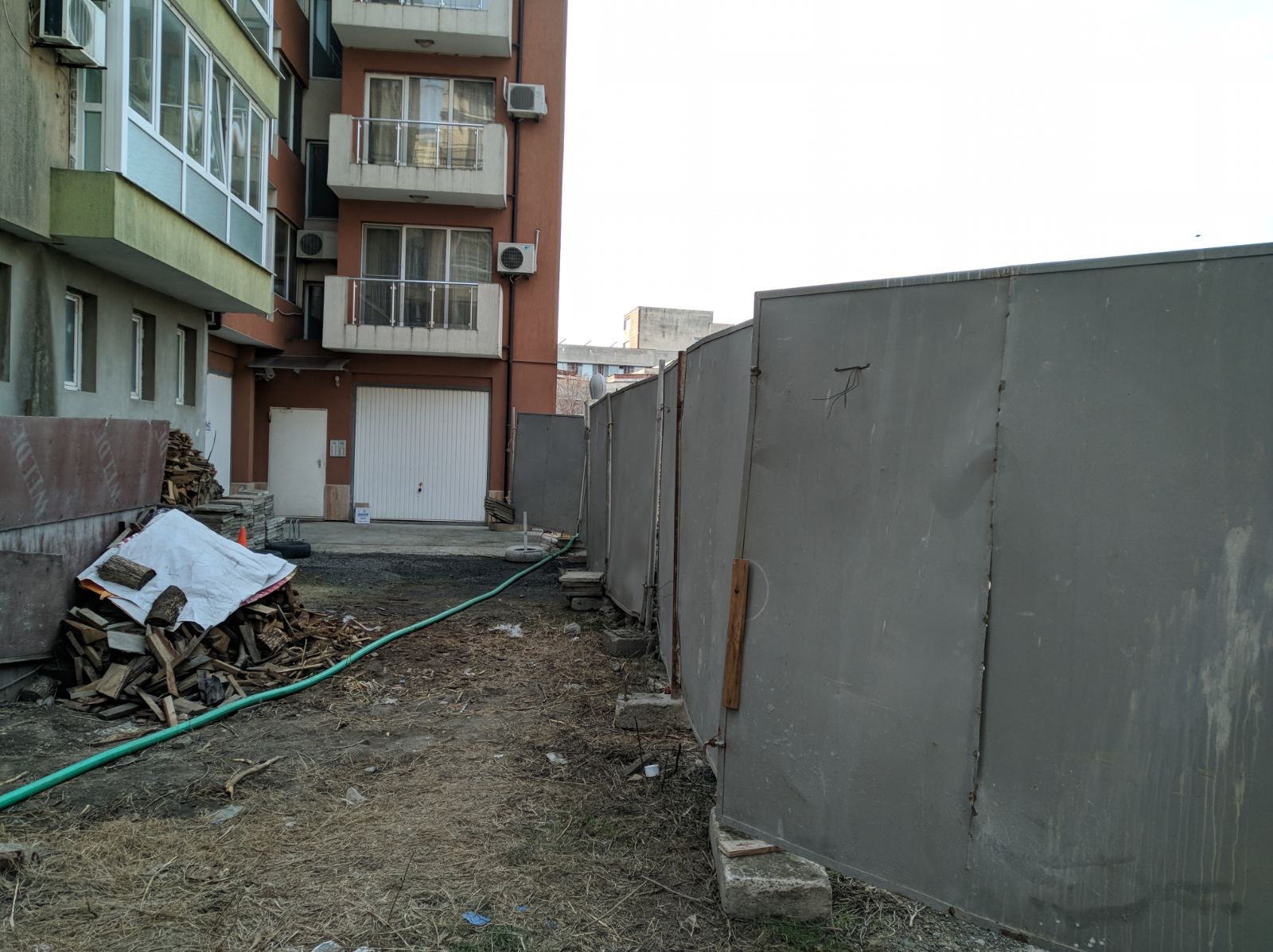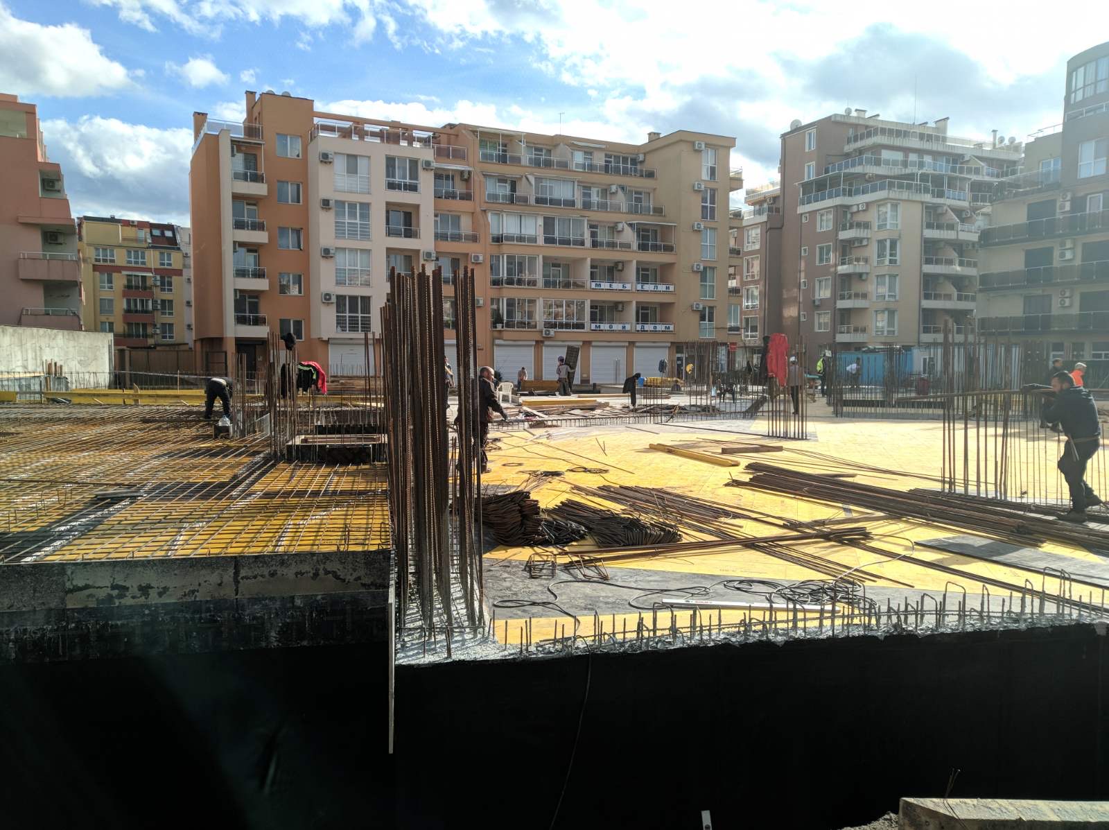 Вид в сторону ул. Цар Иван Александр. Желтый дом со светло-коричневыми балкончиками смотрится уже прямо готовым, хотя надо ещё многое доделать, помимо внешней отделки нижнего этажа.