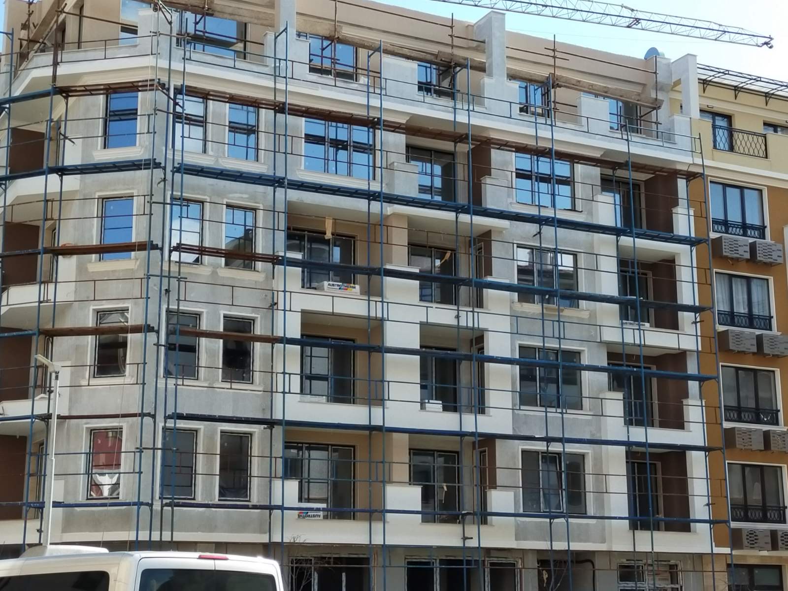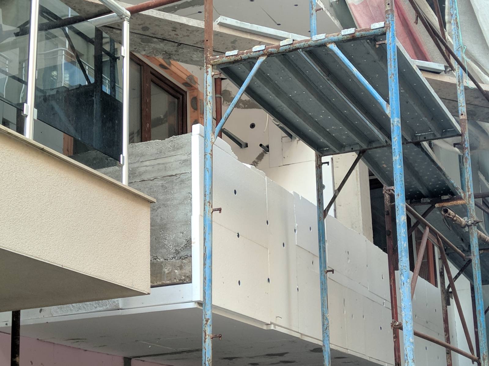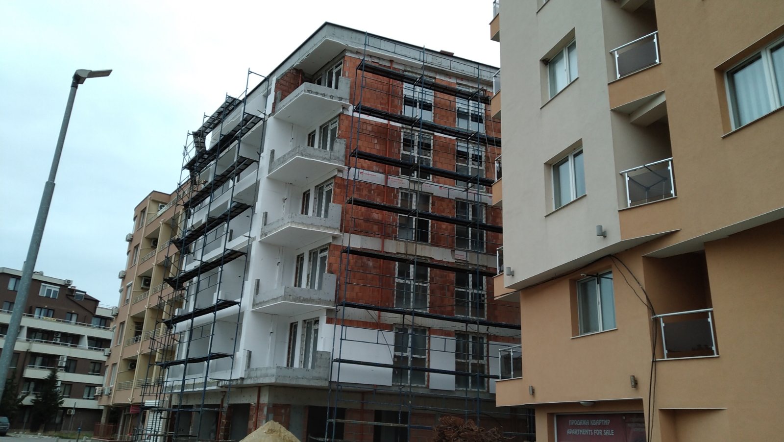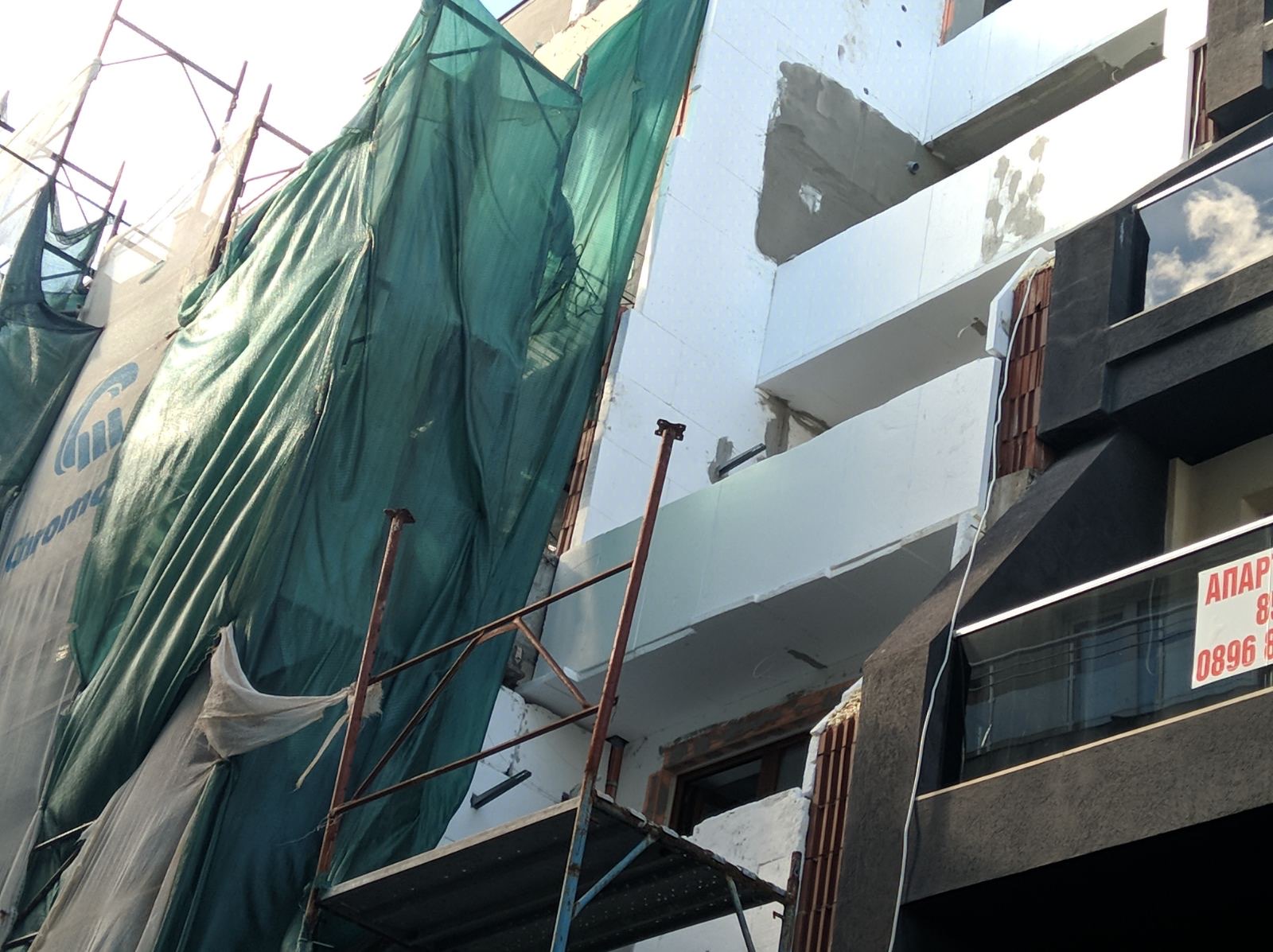 Фасад дома со стороны ул Болгария уже утеплен пенопластом, а со стороны ул. Св. Иван Рилски проложить пенопласт ещё не успели.