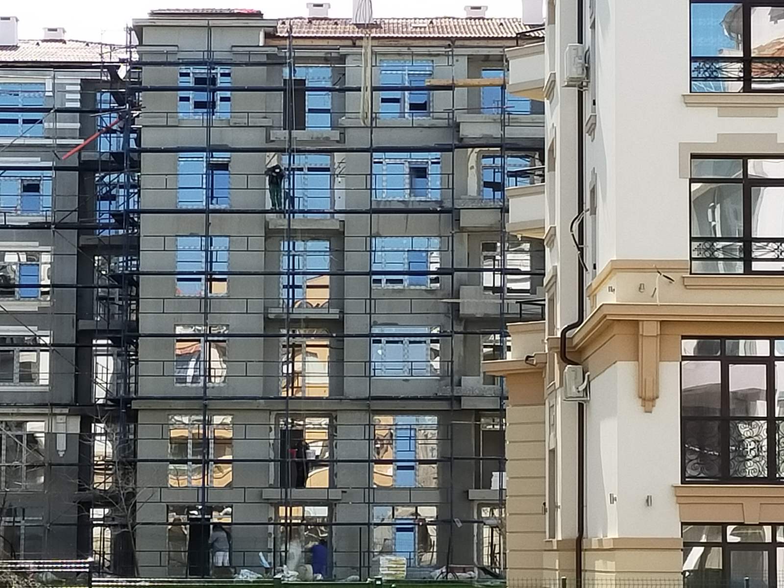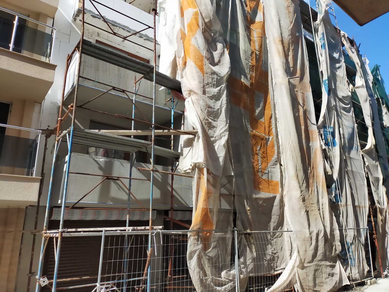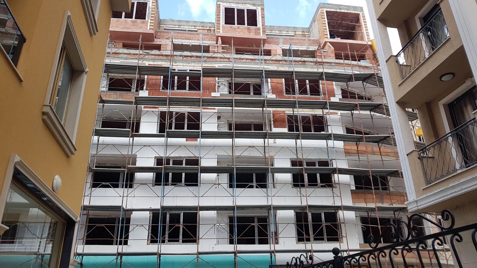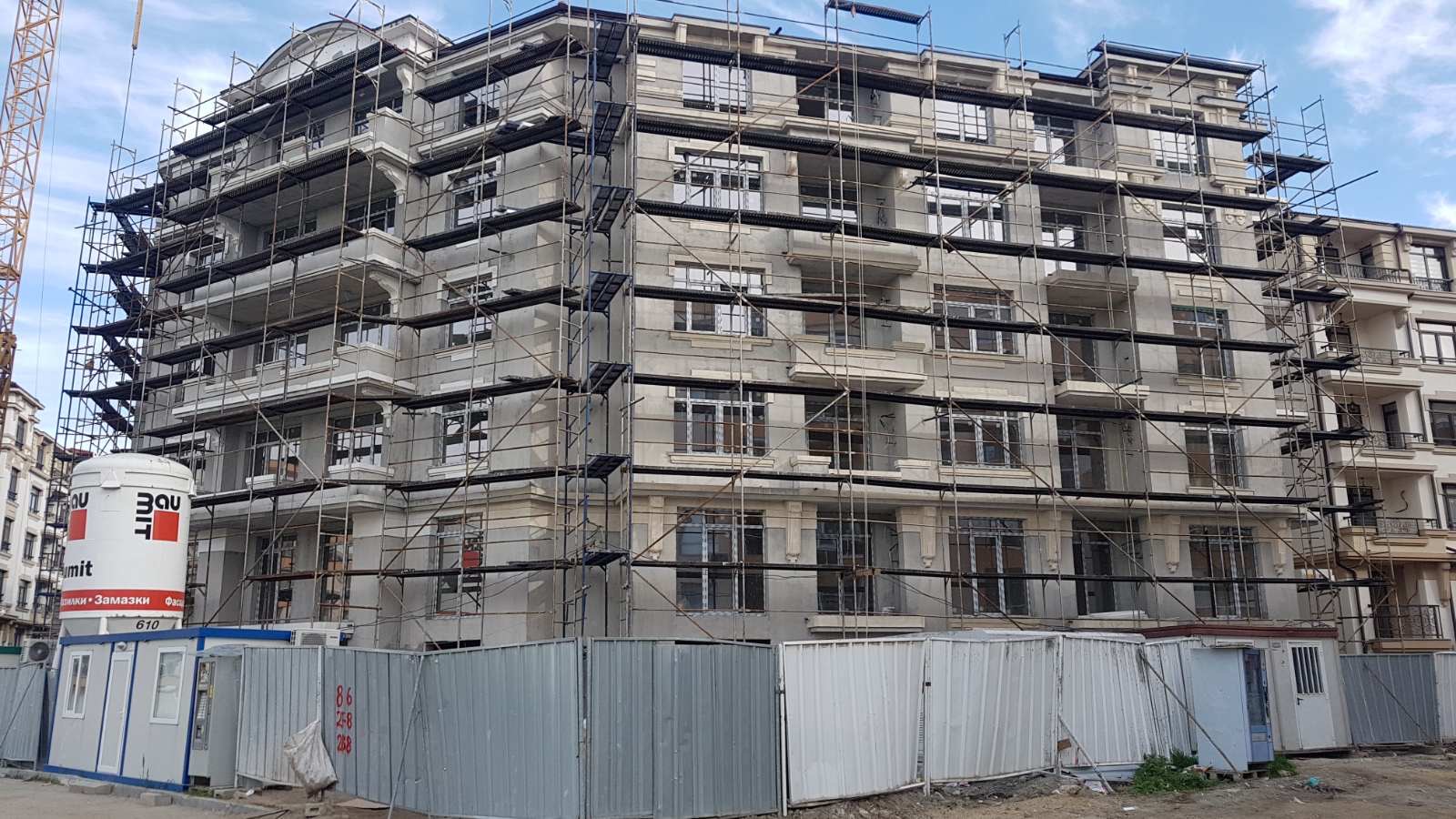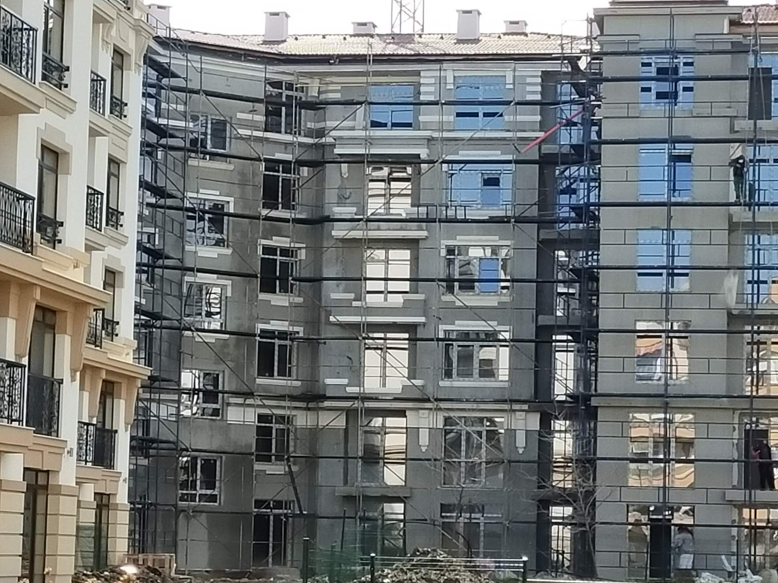 Дом Каплиопа со стороны внутреннего дворики. Уже весь фасад закрыли сеткой и производят внешнюю отделку дома.