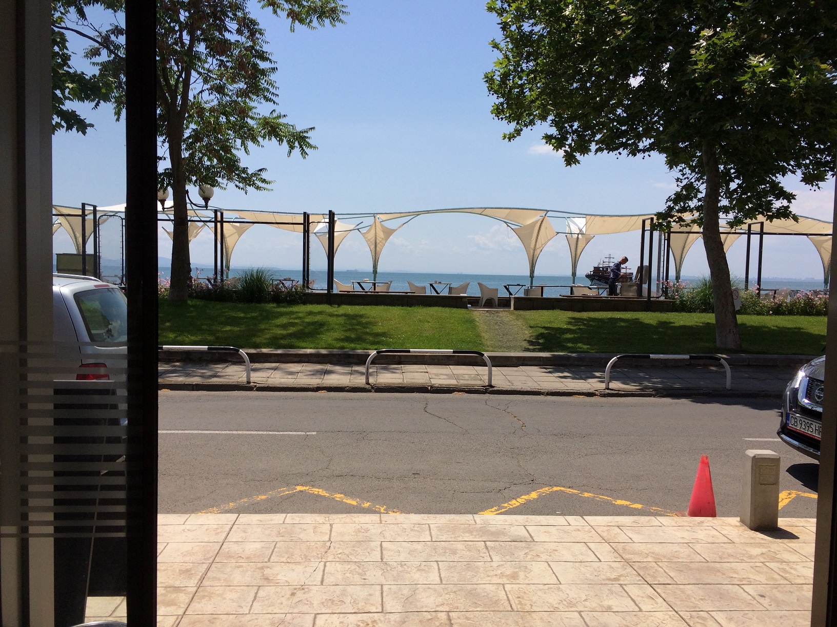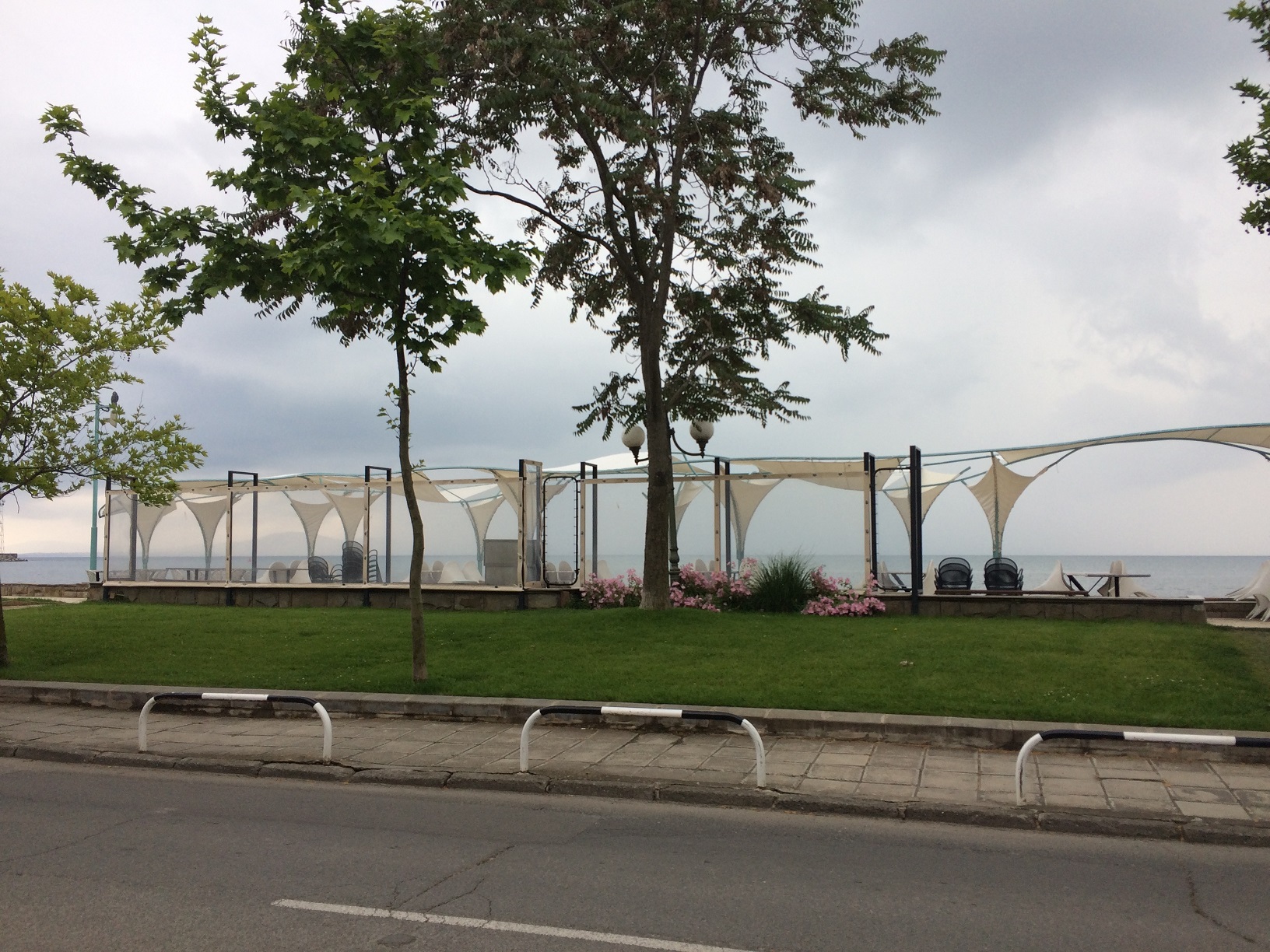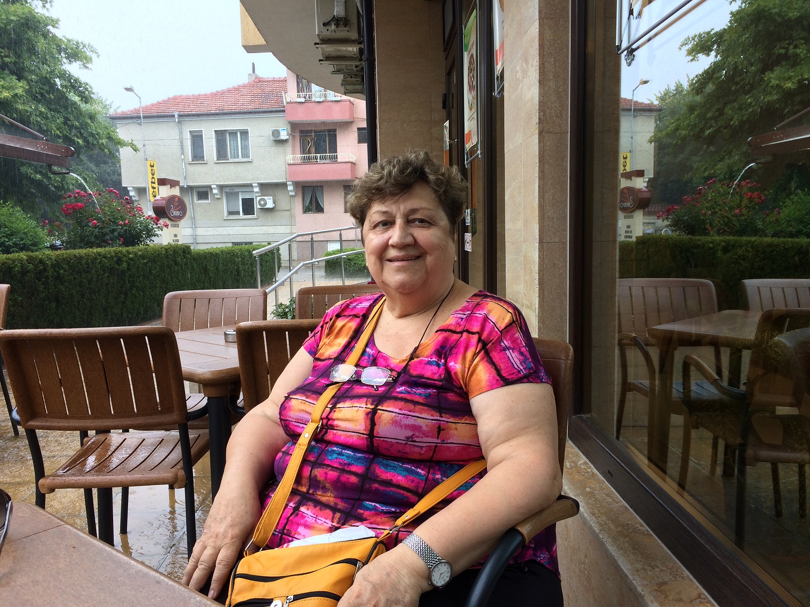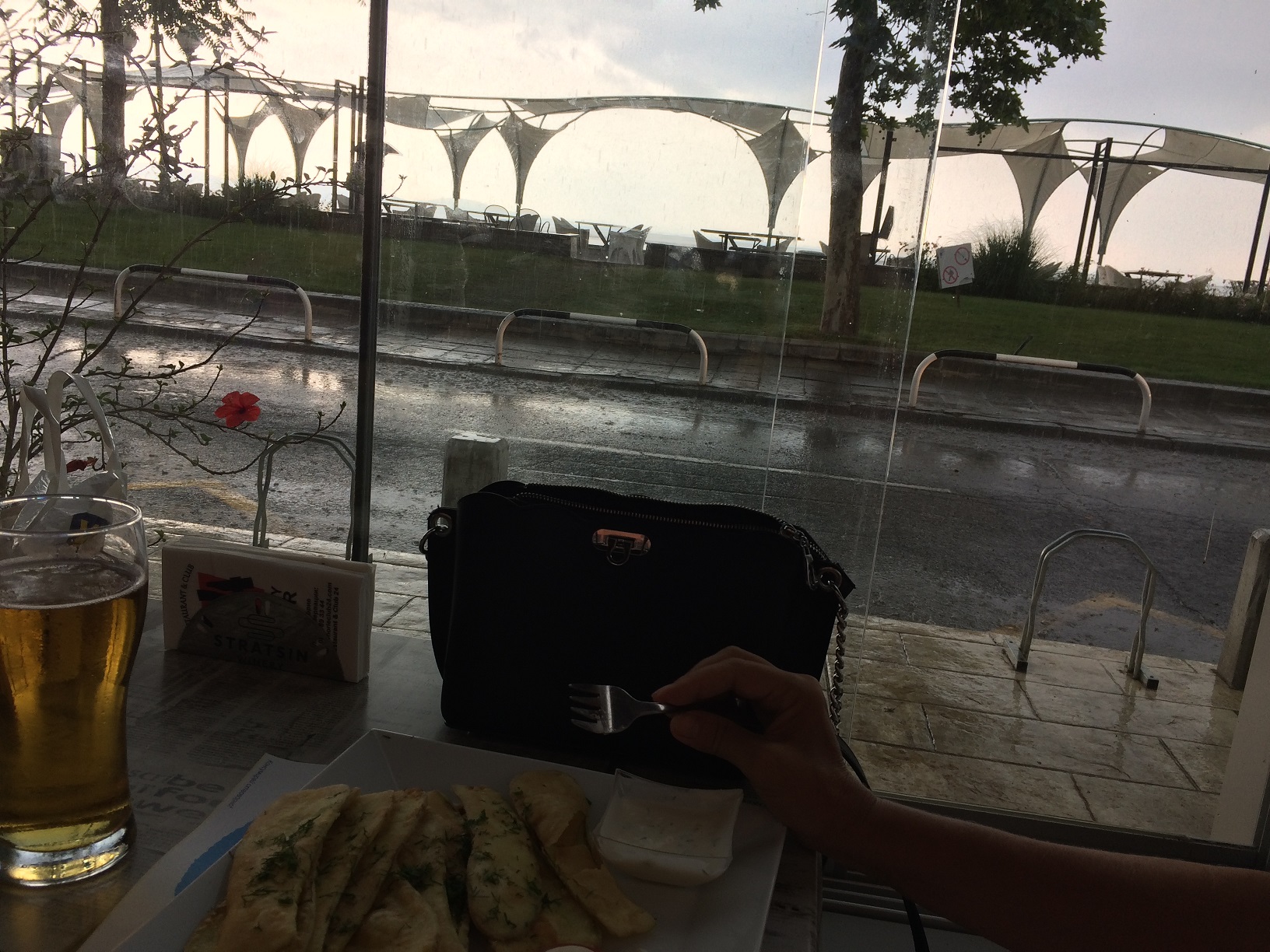 Мы с сестрой ходили по делам, поэтому, не возвращаясь домой, отправились в ресторан клуб 24 уже в половину второго. По дороге мы заметили, что небо стало темнеть, а потом и вообще быстро закрылось облаками. Стало ясно, что дождь точно пойдёт и похоже, что до дождя мы до ресторана 24 добраться не сумеем. Мы прибавили ходу, чтобы хоть до кафе Захаро добежать, чтобы там пересидеть непогоду. Так и случилось. Не успели мы войти под крышу кафе, как стали падать первые капли, а потом полил мощный ливень.