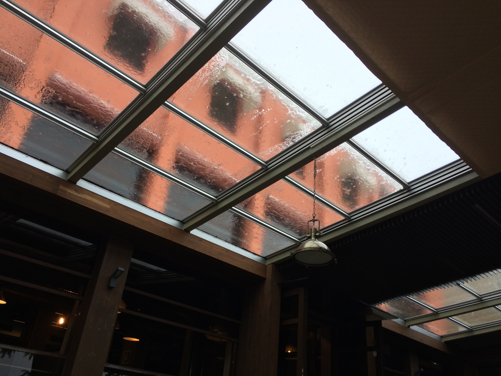 Вот дождь на стеклянной крыше террасы.