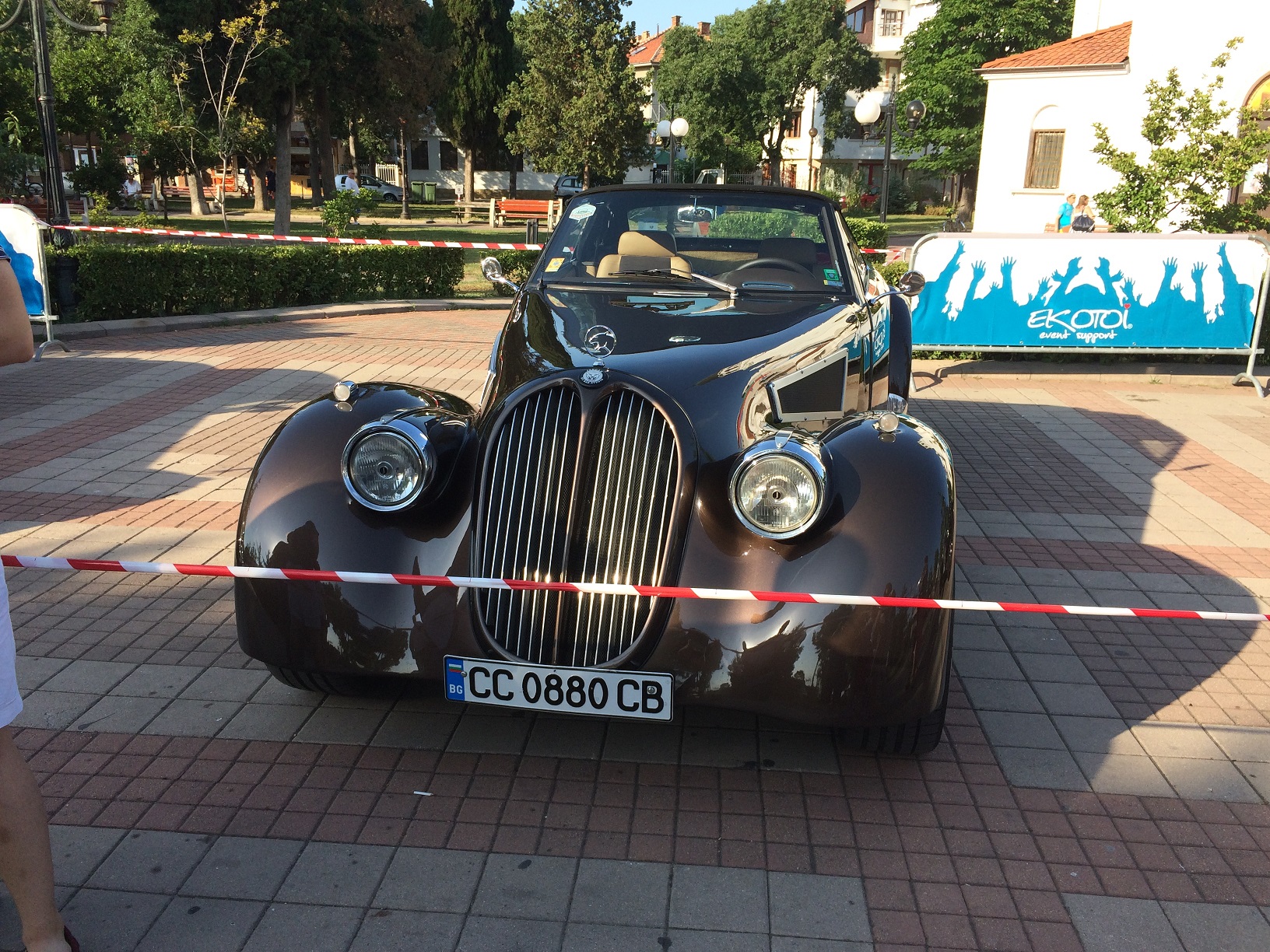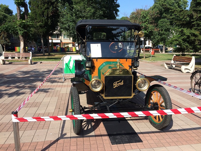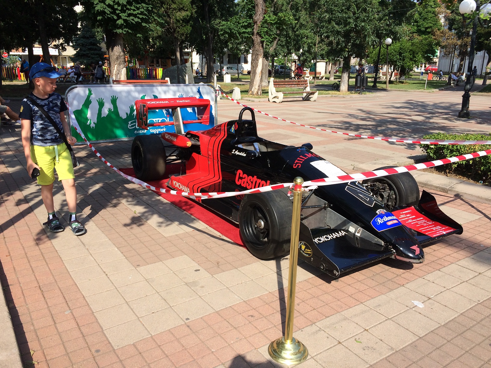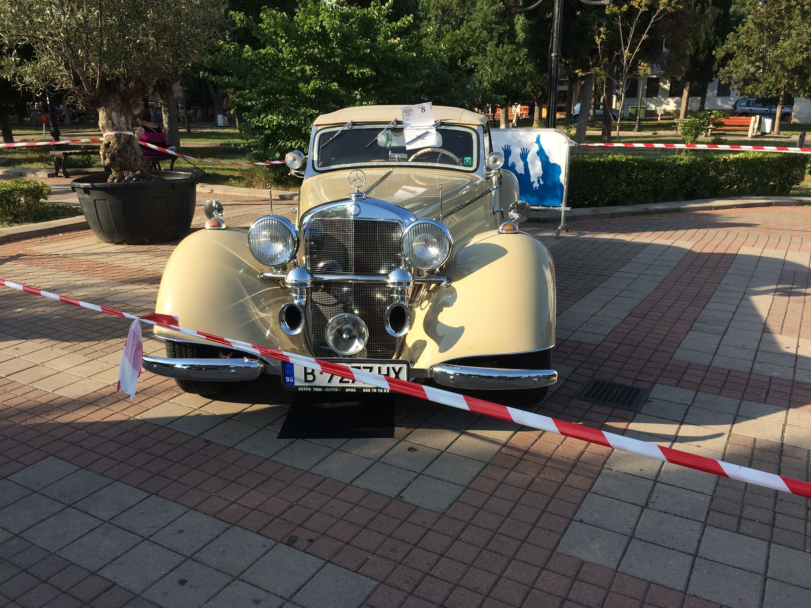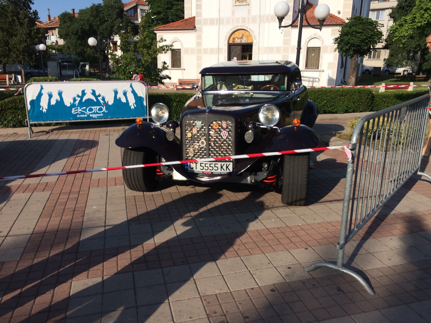 На крыльце читалища расположили кубки, видимо относящиеся к выставке ретромашин и девушки дефилировали.