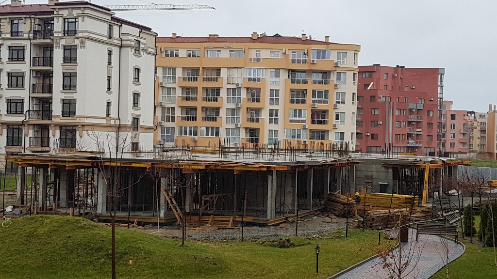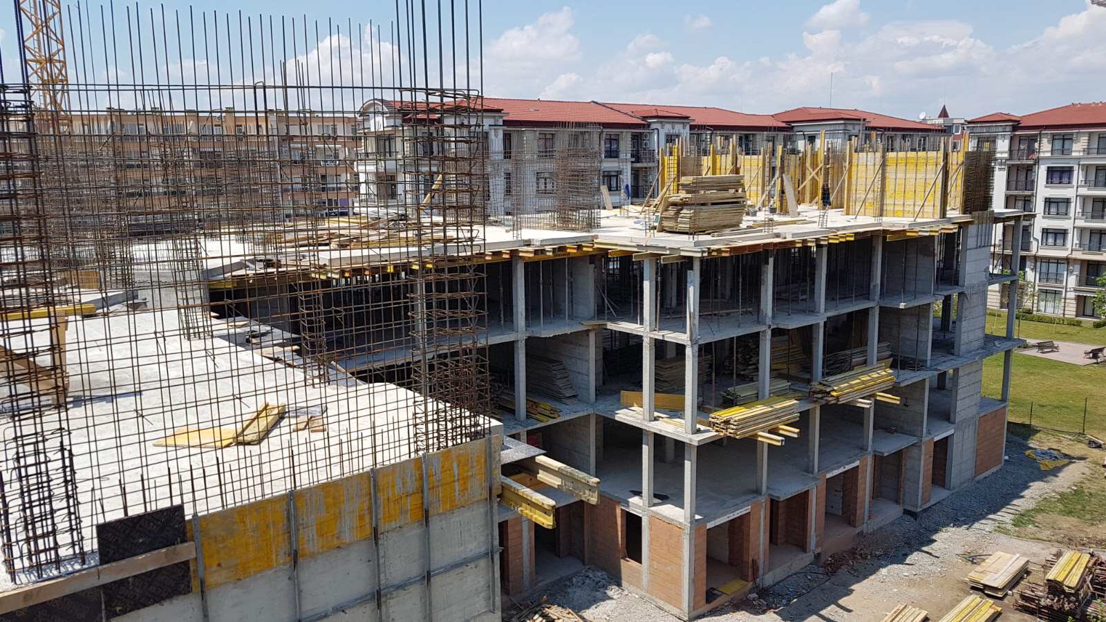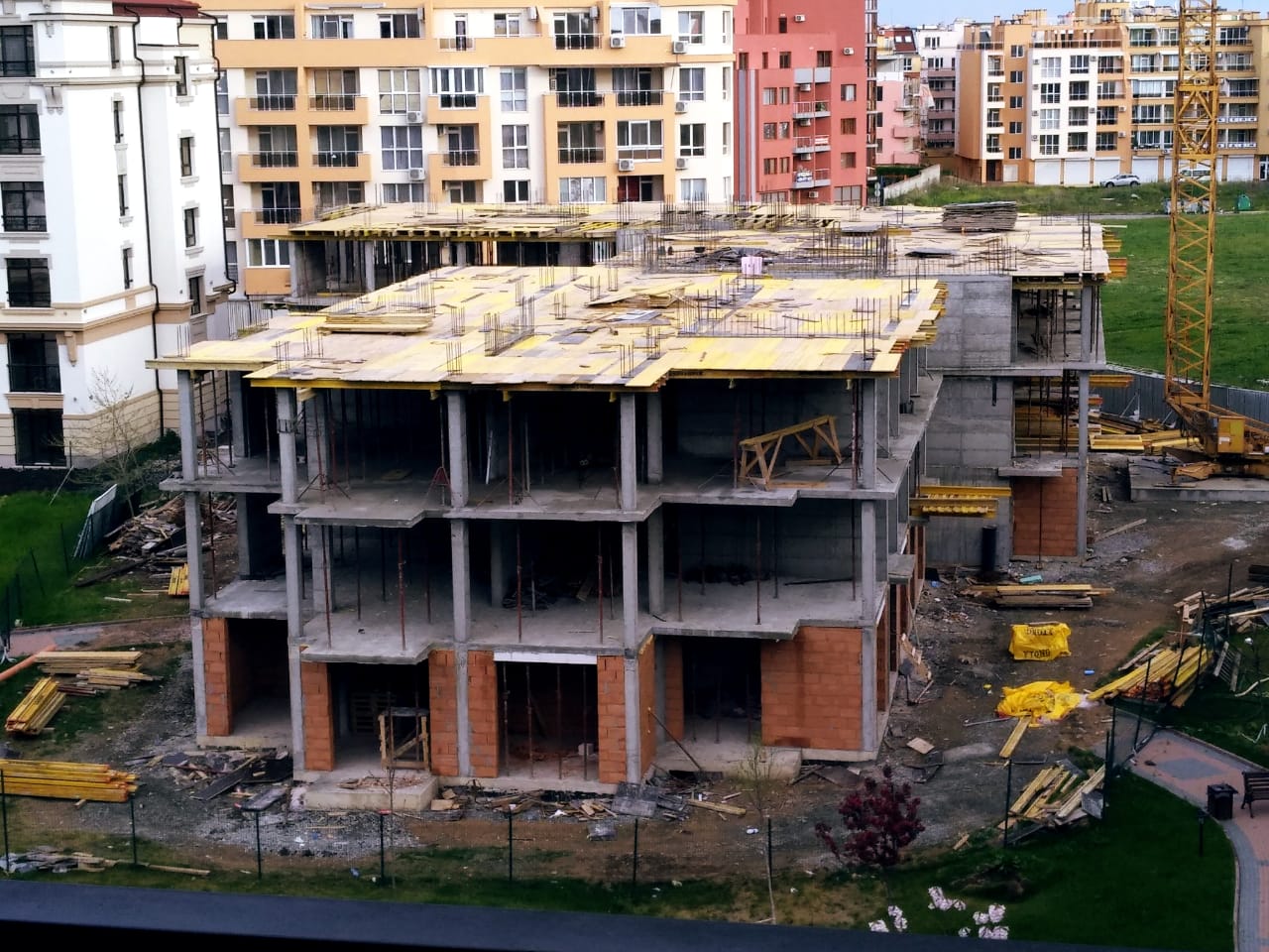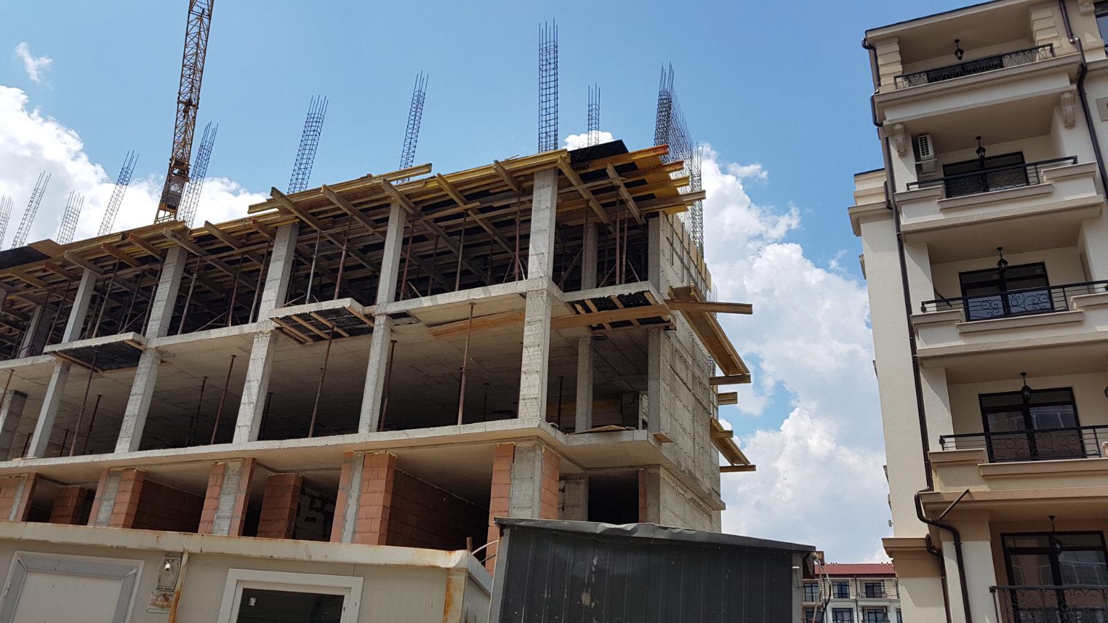 На этом фото корпуса Айвазвского парка поближе. Здесь уже заканчивают опалубку перекрытий между 4-м и 5-м этажами. И новая часть улицы Арда хорошо видна и красный дом компании Тонозлиеви.