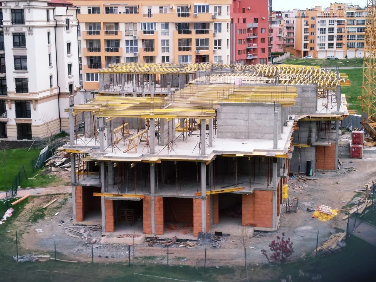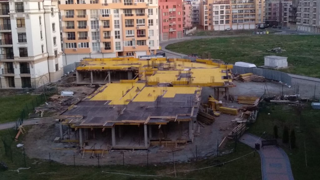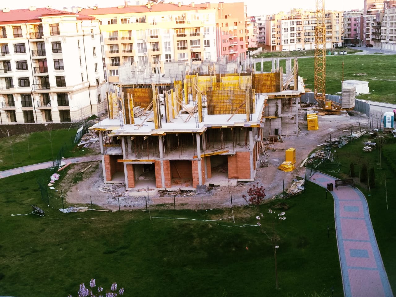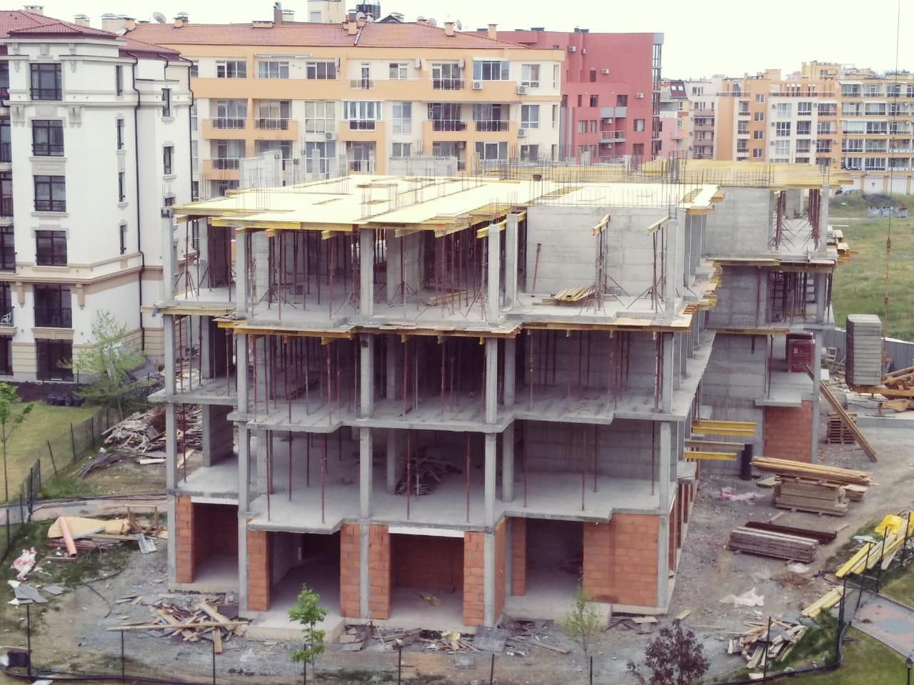 На этом фото корпуса Айвазвского парка поближе. Здесь уже заканчивают опалубку перекрытий между 4-м и 5-м этажами. И новая часть улицы Арда хорошо видна и красный дом компании Тонозлиеви.