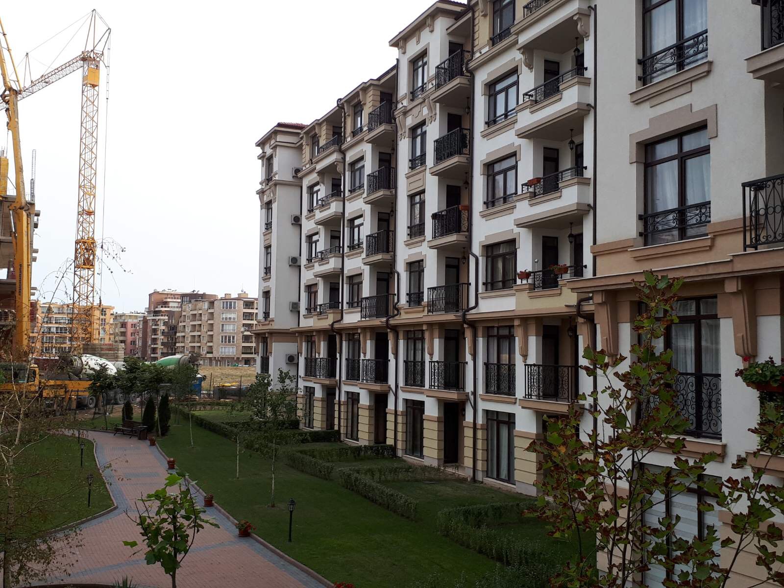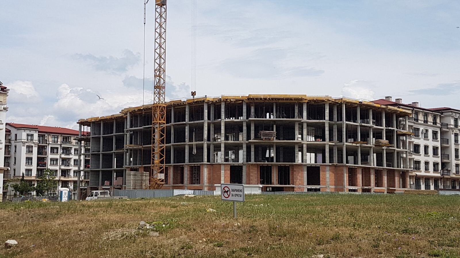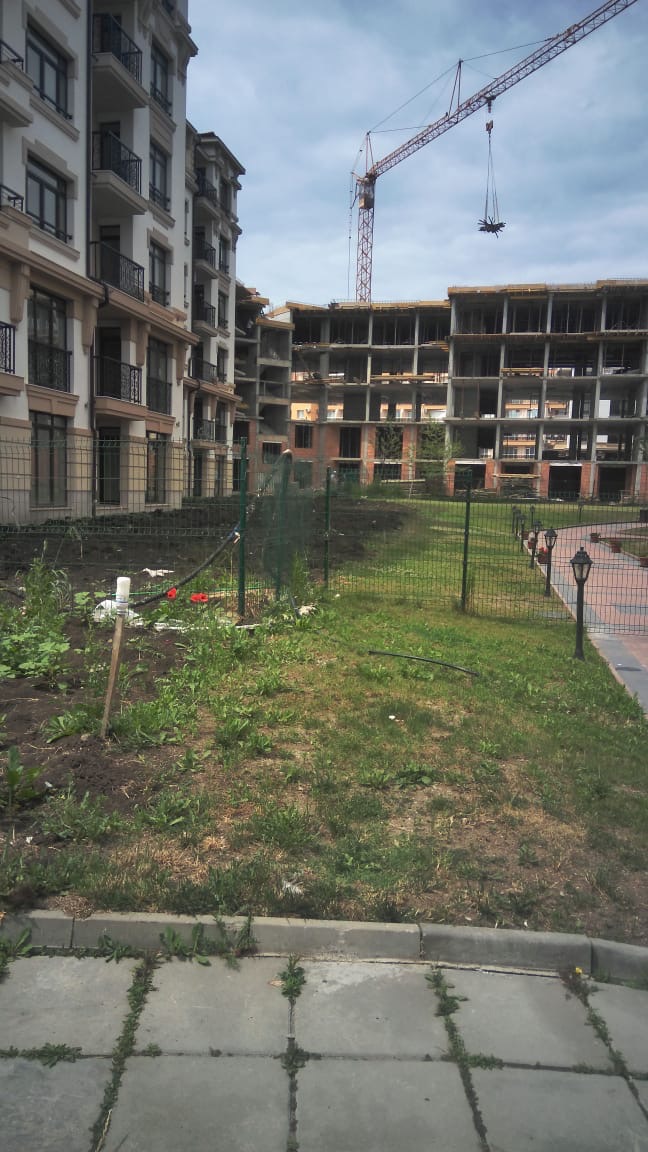 Этот снимок уже сделан практически снаружи комплекса Айвазовский парк с ул. Митрополит Климент, идушеё вокруг будущего парка. Слева виден угол корпуса А, дальше строящиеся корпуса M и L.