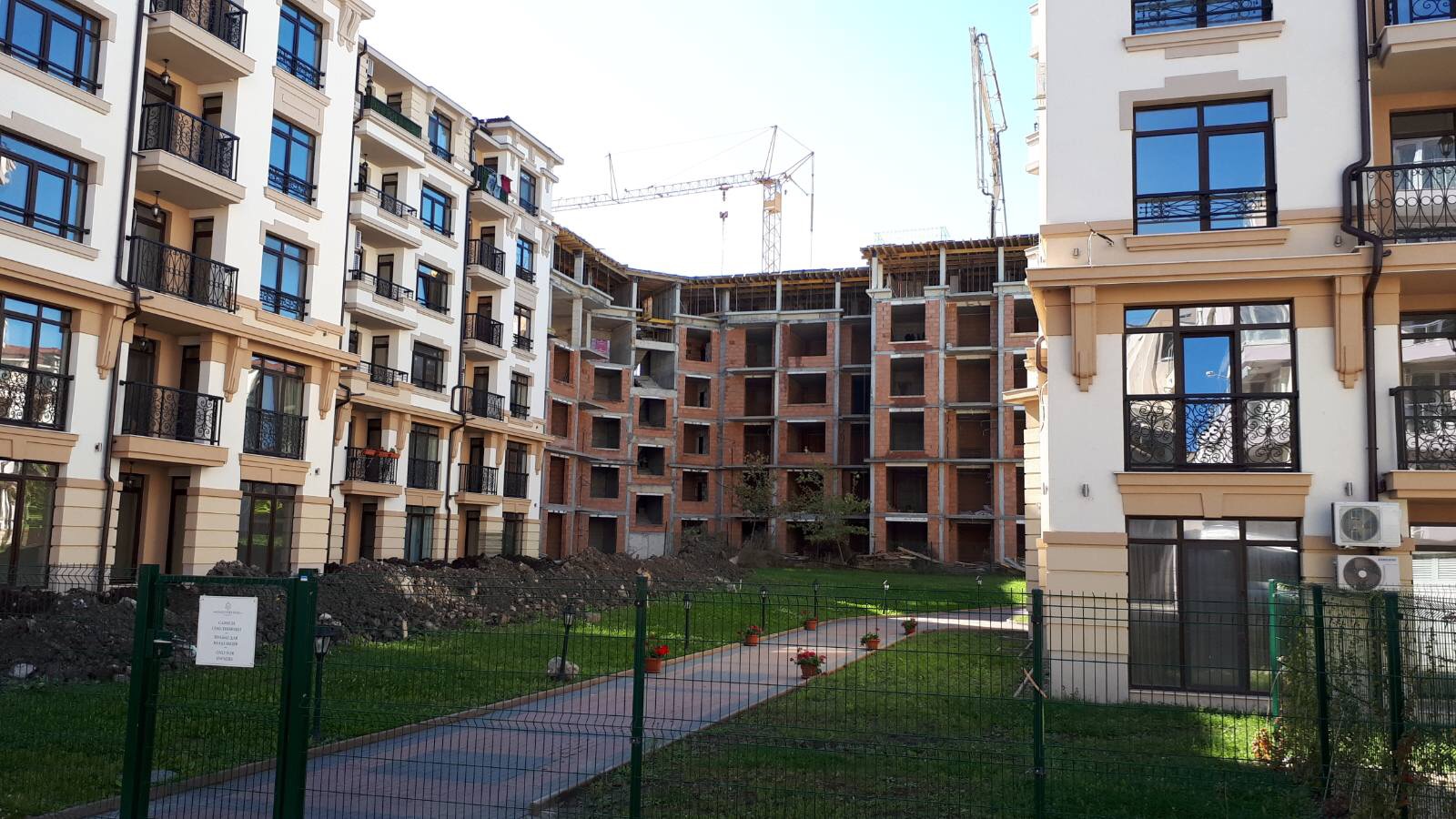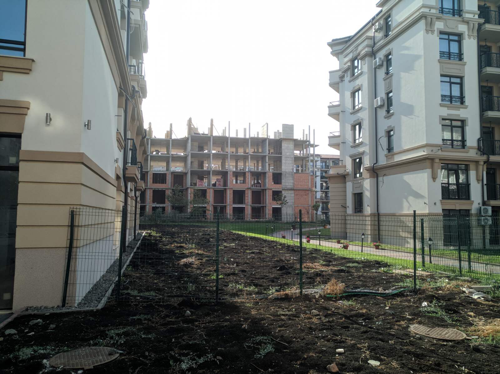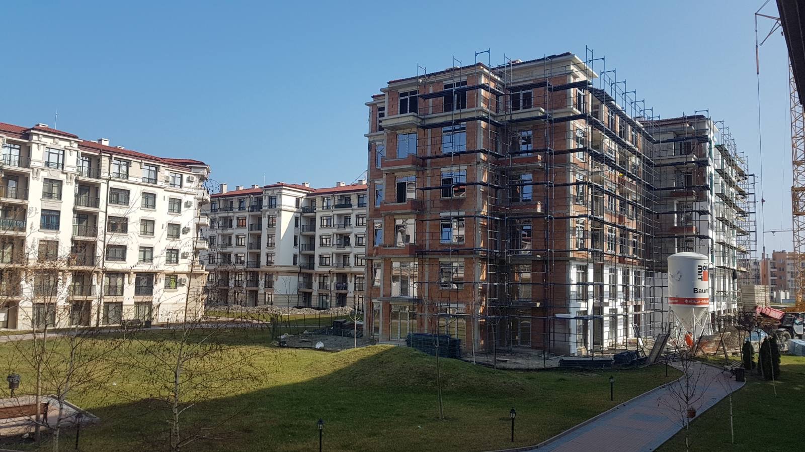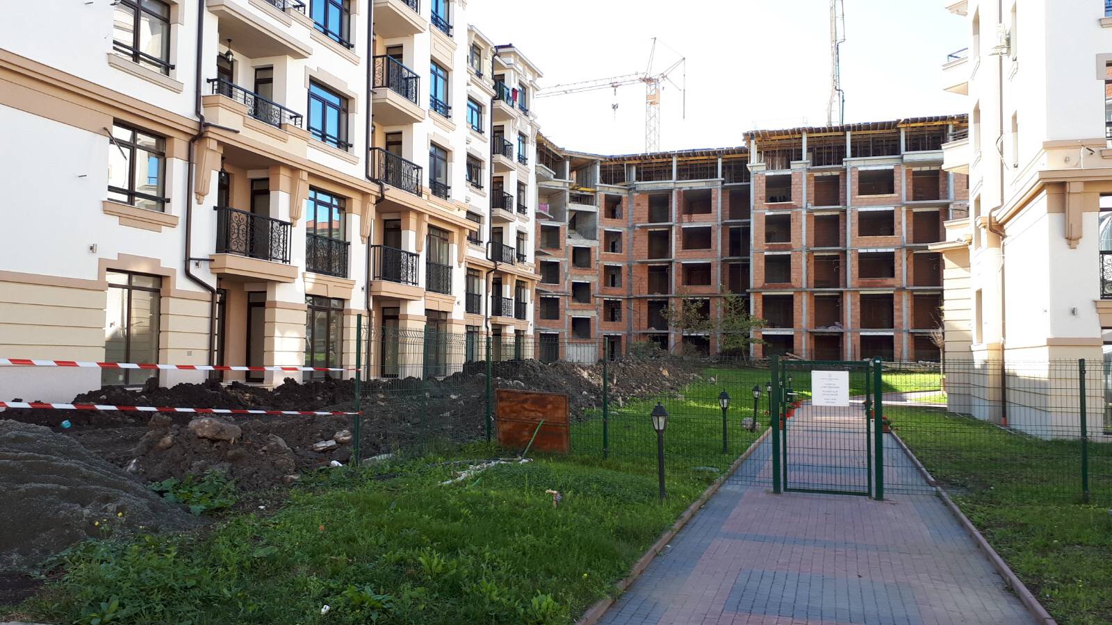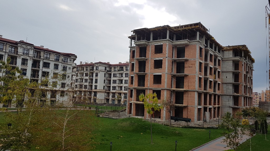 А это строящиеся корпуса (в основном корпус L) уже снаружи комплекса с ул. Митрополит Климент. Видно, что и на корпусе L идёт остеклены окна нижних двух этажей.