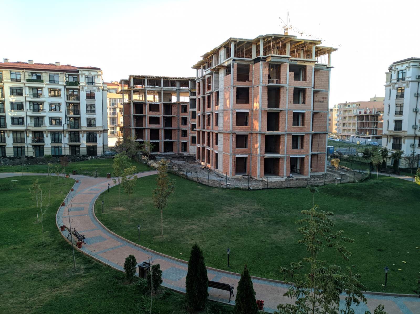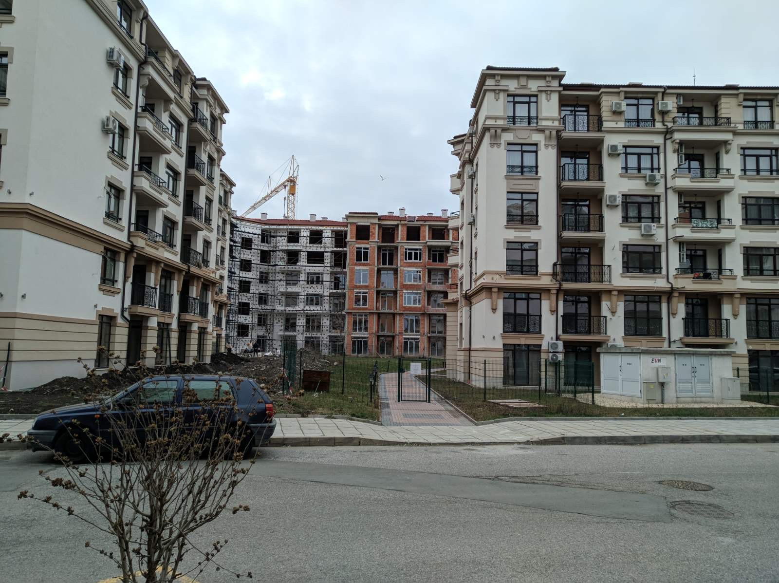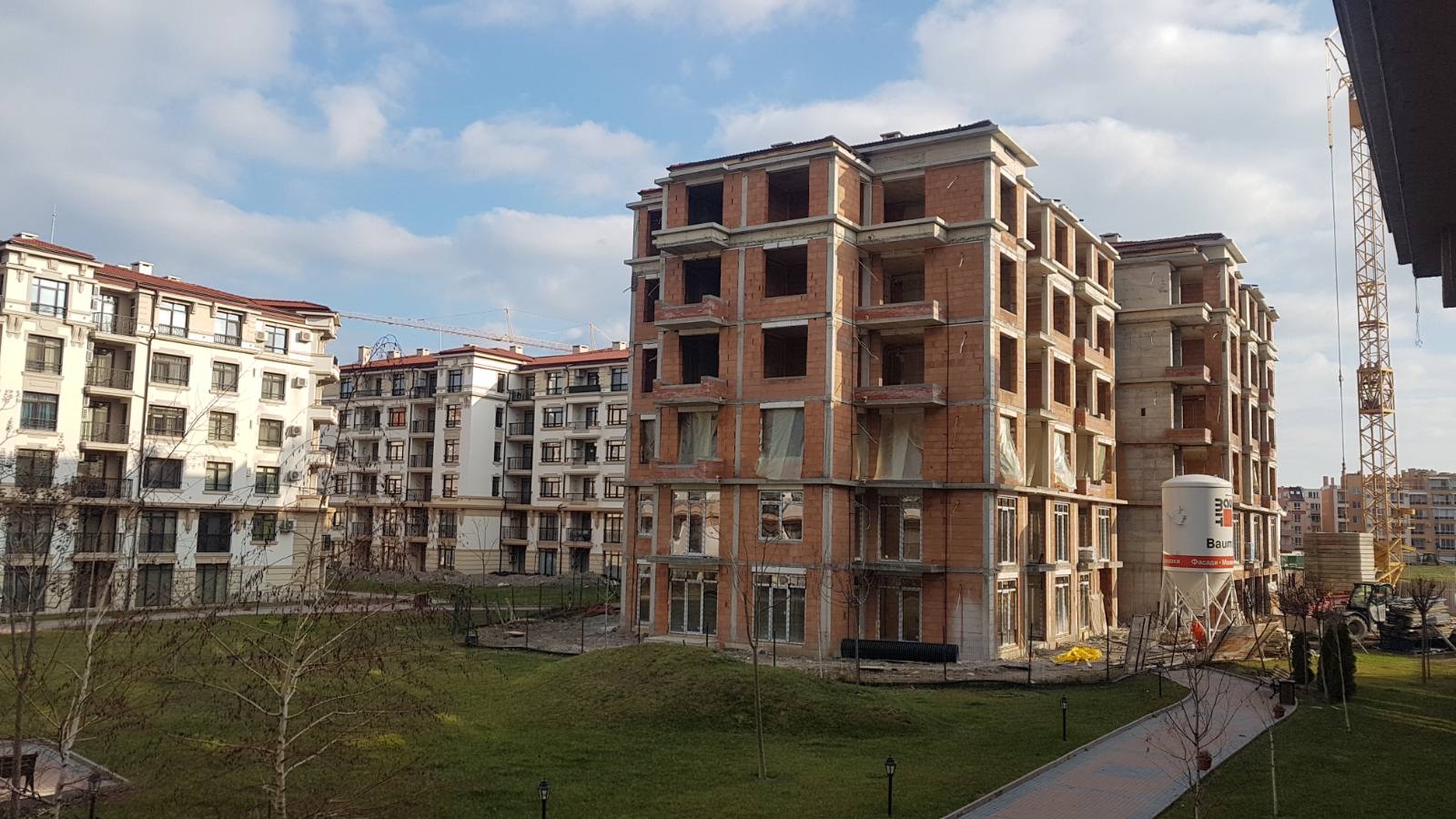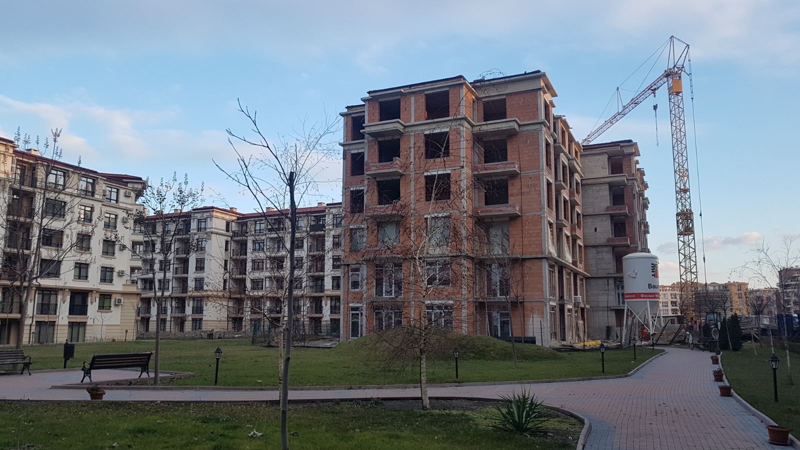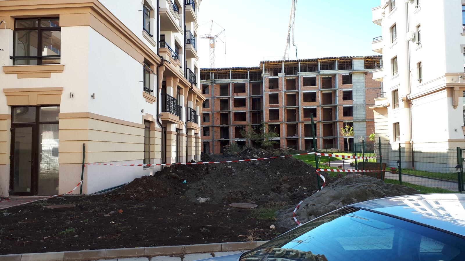 А это строящиеся корпуса (в основном корпус L) уже снаружи комплекса с ул. Митрополит Климент. Видно, что и на корпусе L идёт остеклены окна нижних двух этажей.