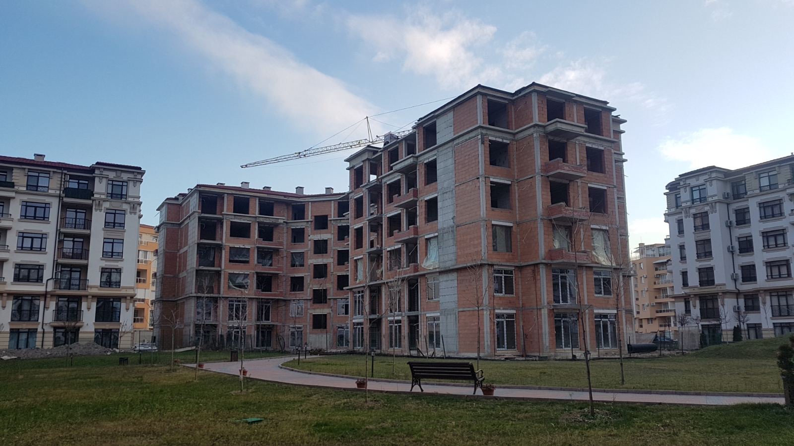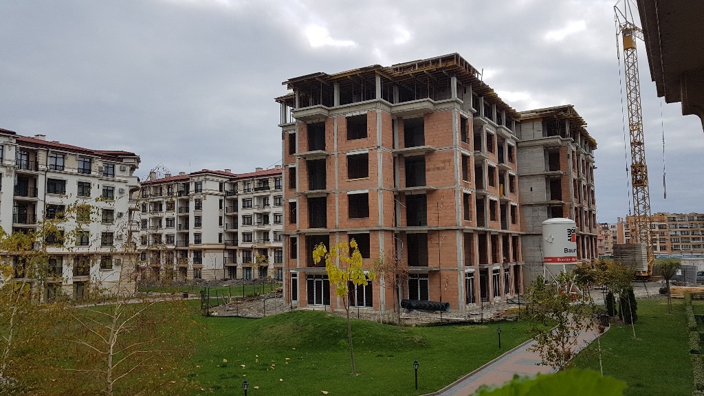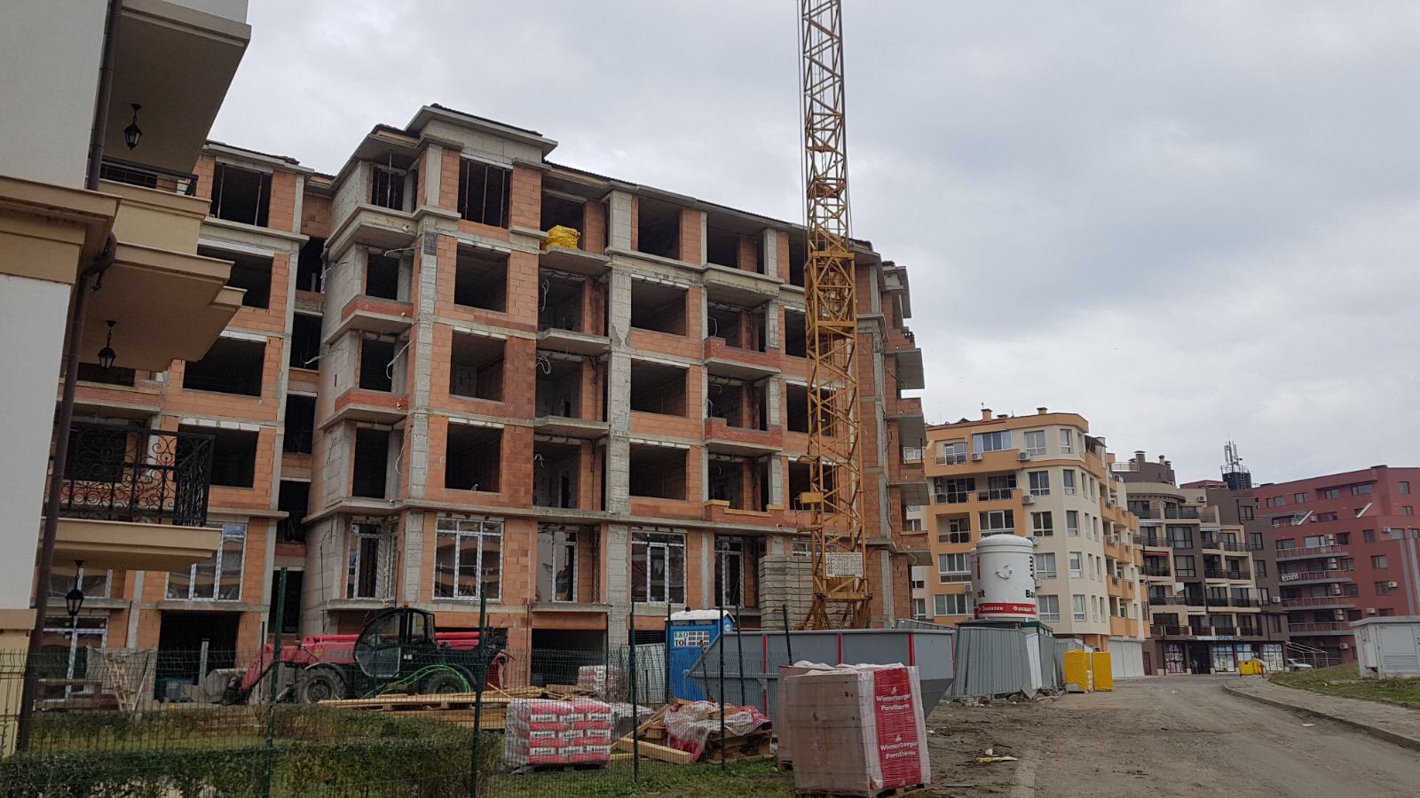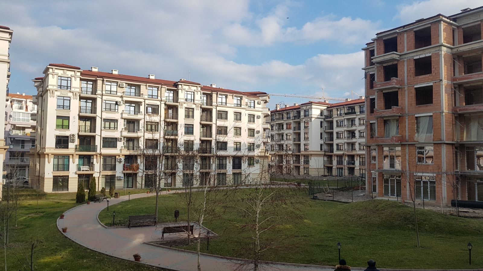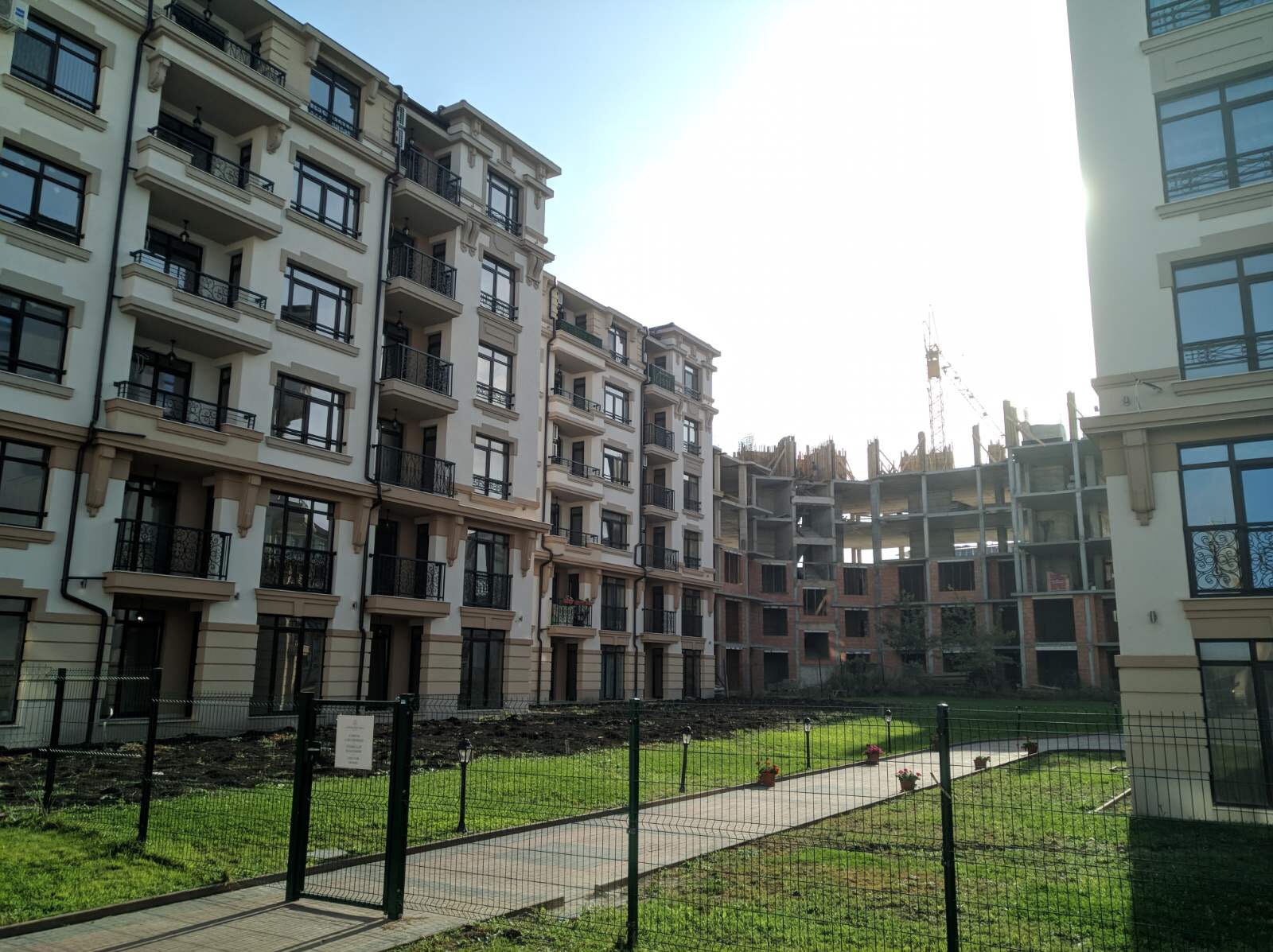 А это строящиеся корпуса (в основном корпус L) уже снаружи комплекса с ул. Митрополит Климент. Видно, что и на корпусе L идёт остеклены окна нижних двух этажей.
