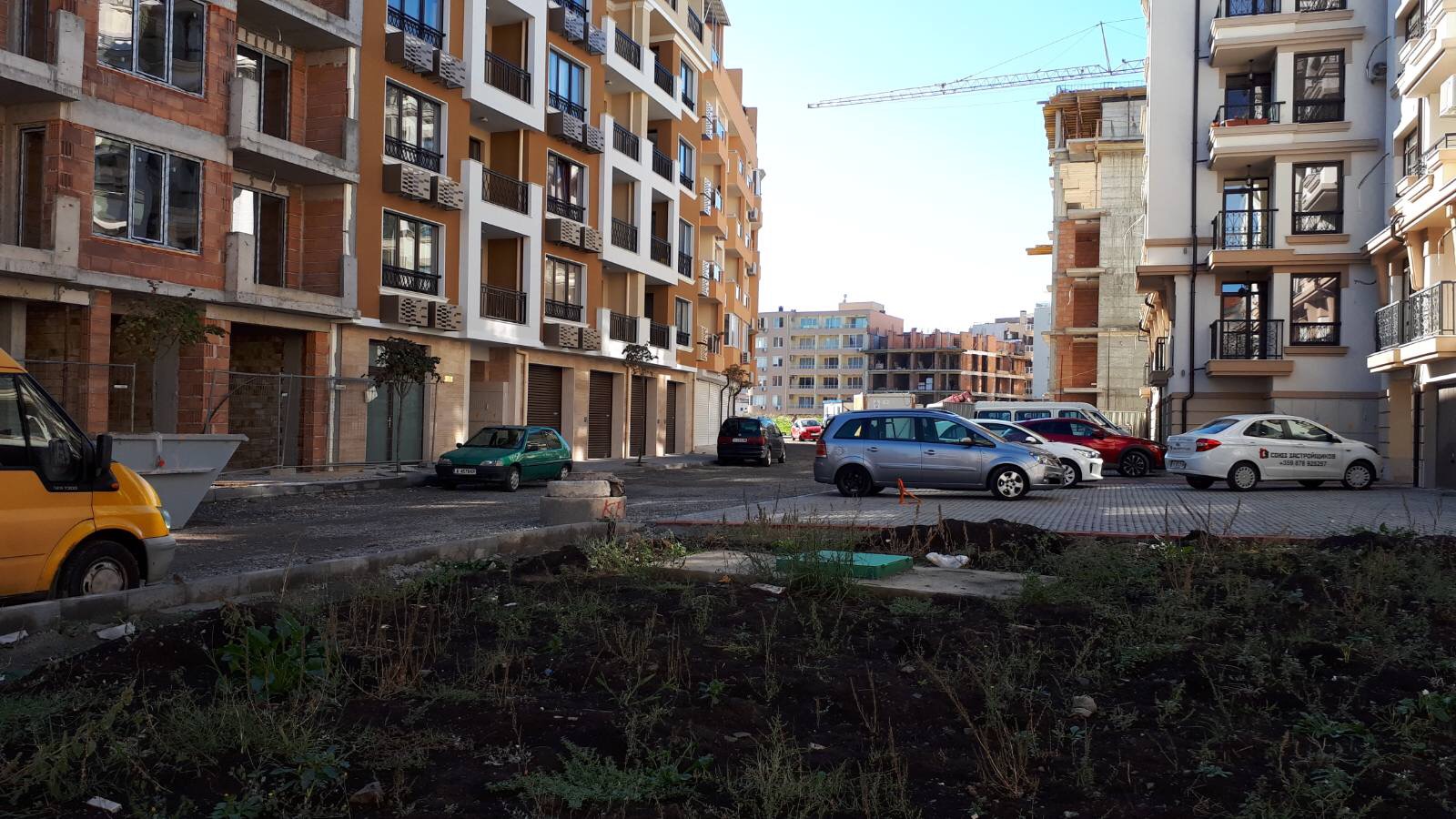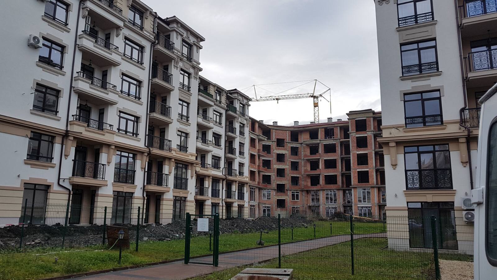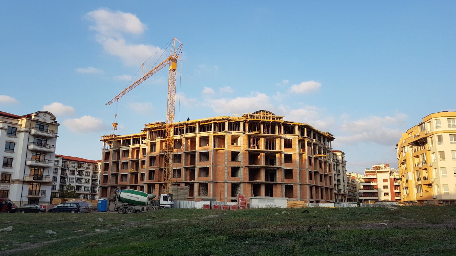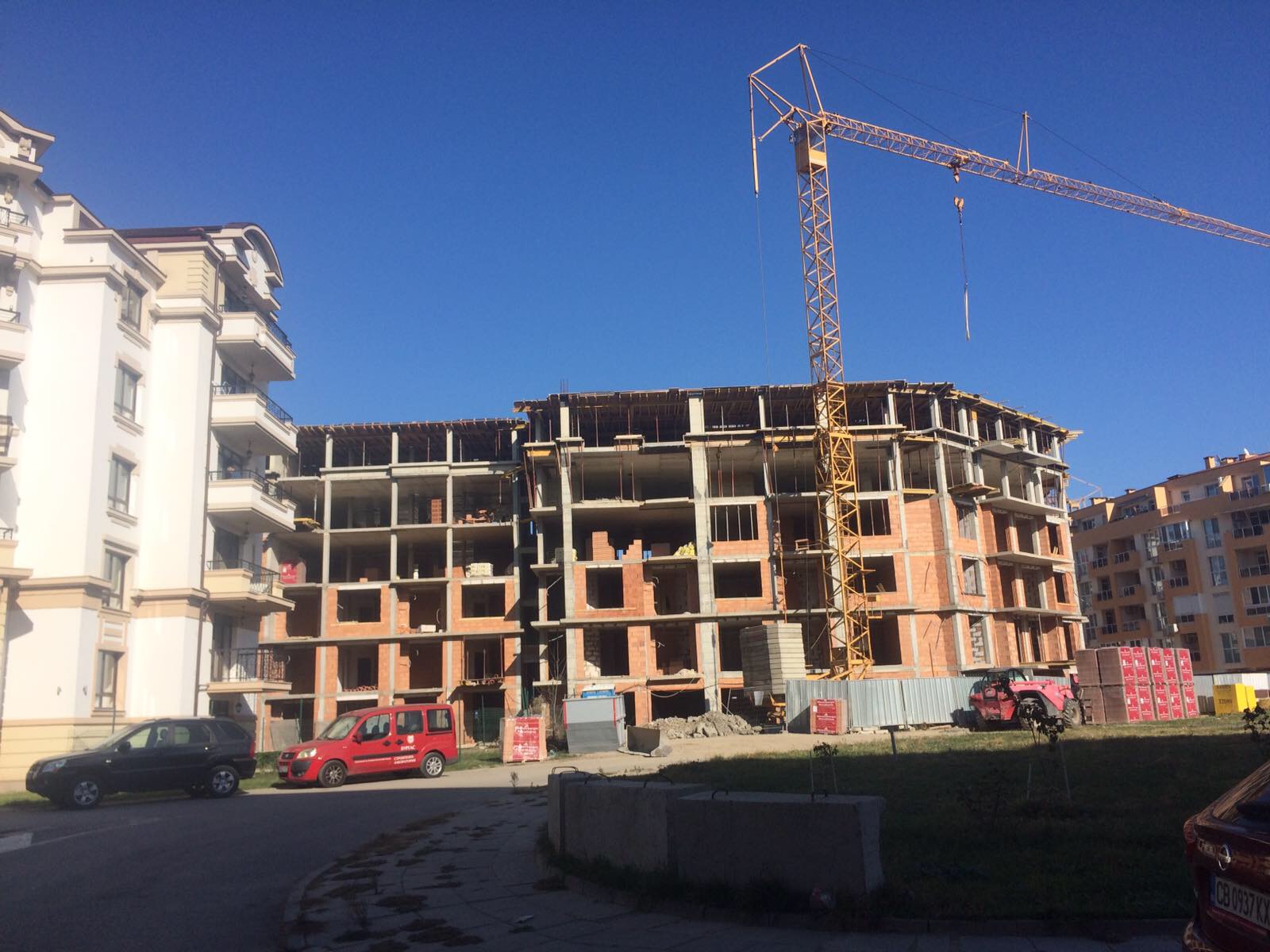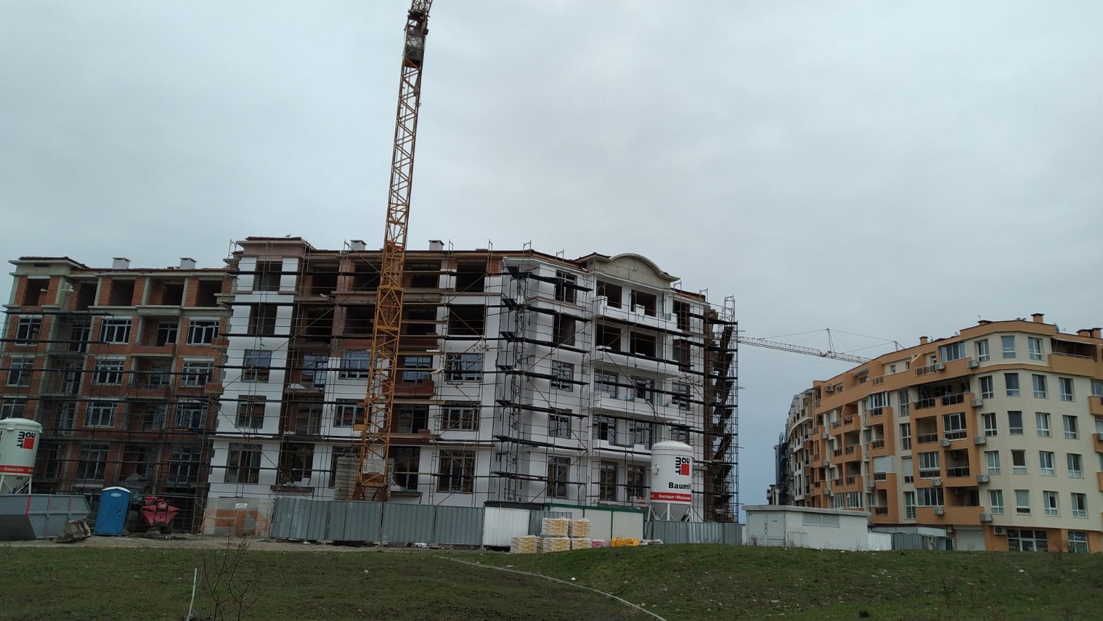 А это строящиеся корпуса (в основном корпус L) уже снаружи комплекса с ул. Митрополит Климент. Видно, что и на корпусе L идёт остеклены окна нижних двух этажей.