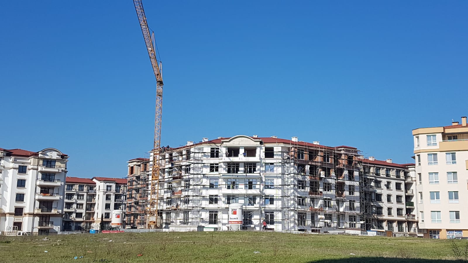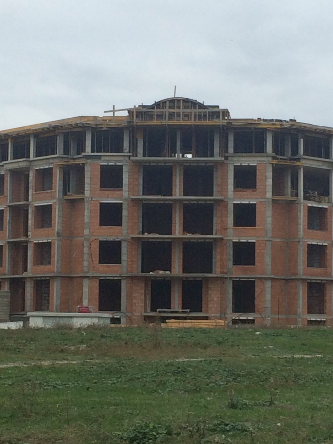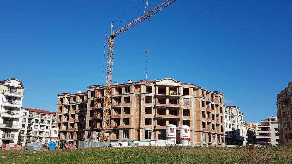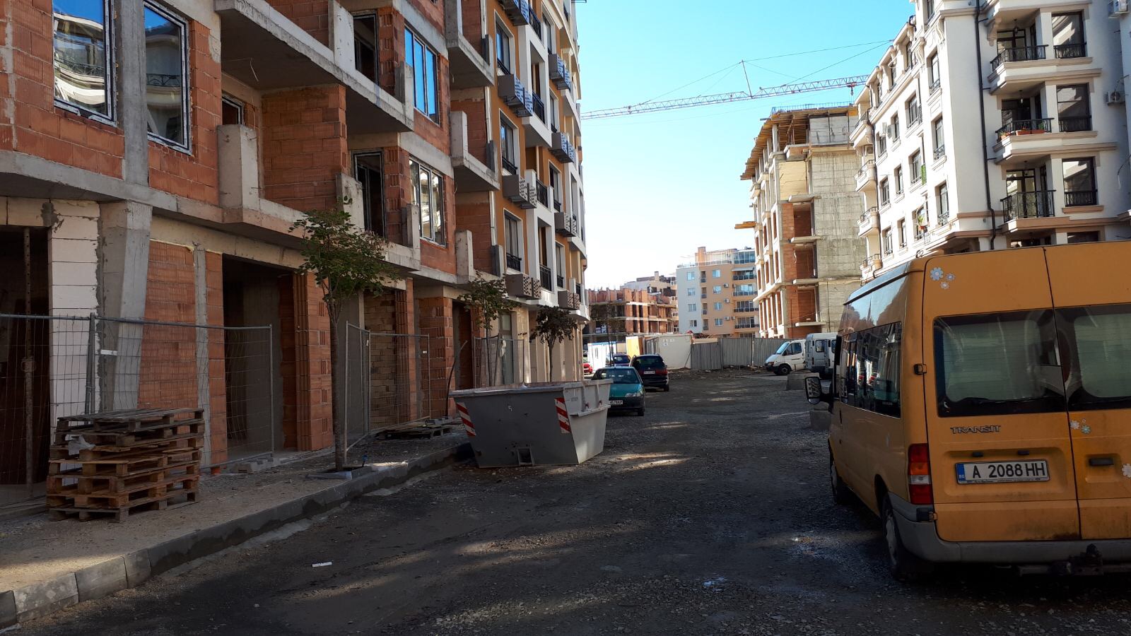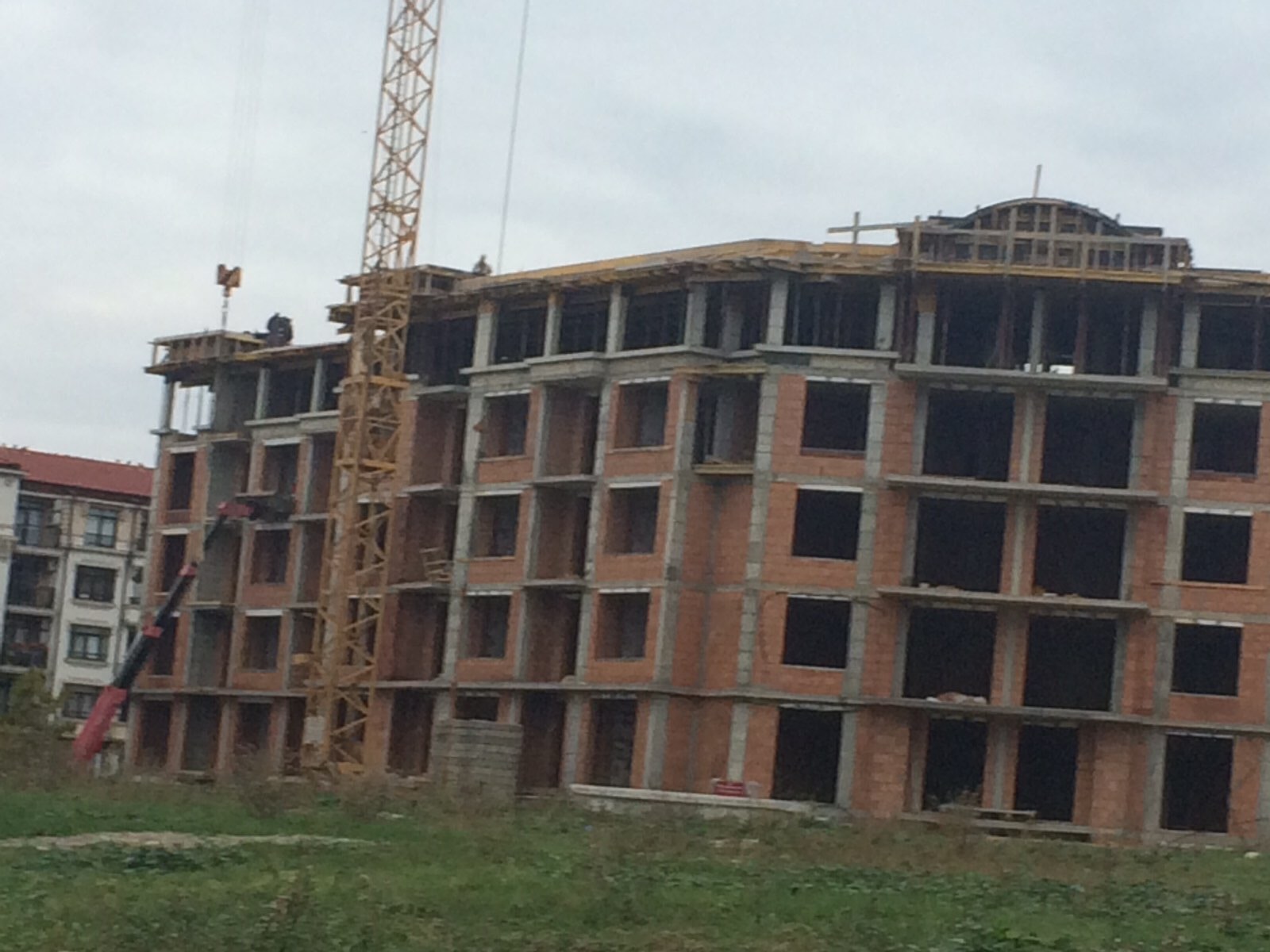 А это строящиеся корпуса (в основном корпус L) уже снаружи комплекса с ул. Митрополит Климент. Видно, что и на корпусе L идёт остеклены окна нижних двух этажей.