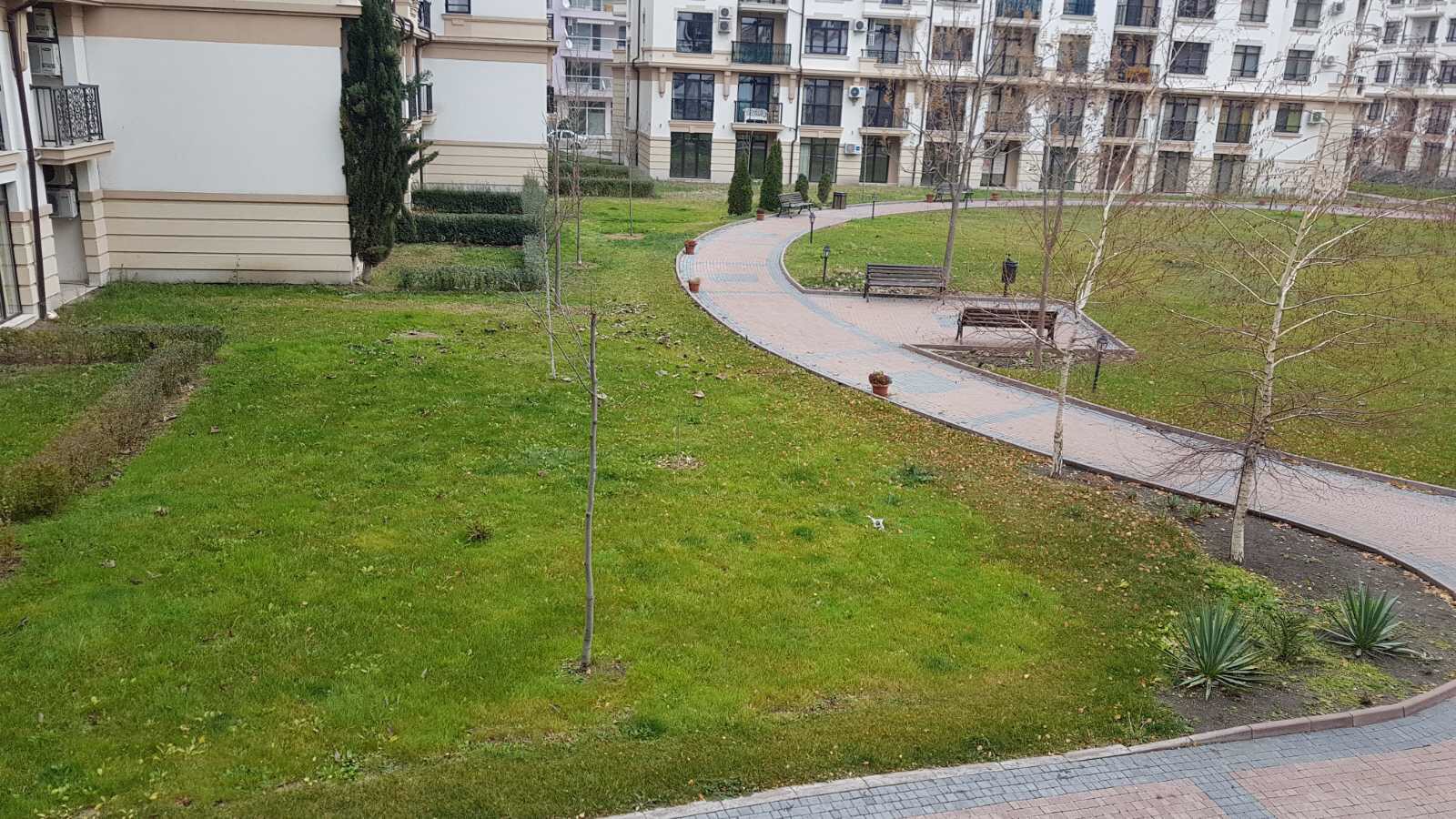 Внутренний дворик Айвазовского парка с зелёным, почти летним газончиком и пустующими лавочками.