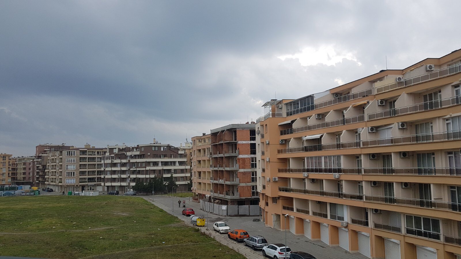 А это вид на бывший пустырь уже из самого корпуса, тоже скорее всего А. Справа за жёлтыми домами виден красноватый дом-новостройка Калиопа тоже с застеклёнными по 3-й этаж окнами. Стройки идут! А небо всё таки зимнее - посмотрите какие свинцовые тучи! Рождество уже прошло всё таки!