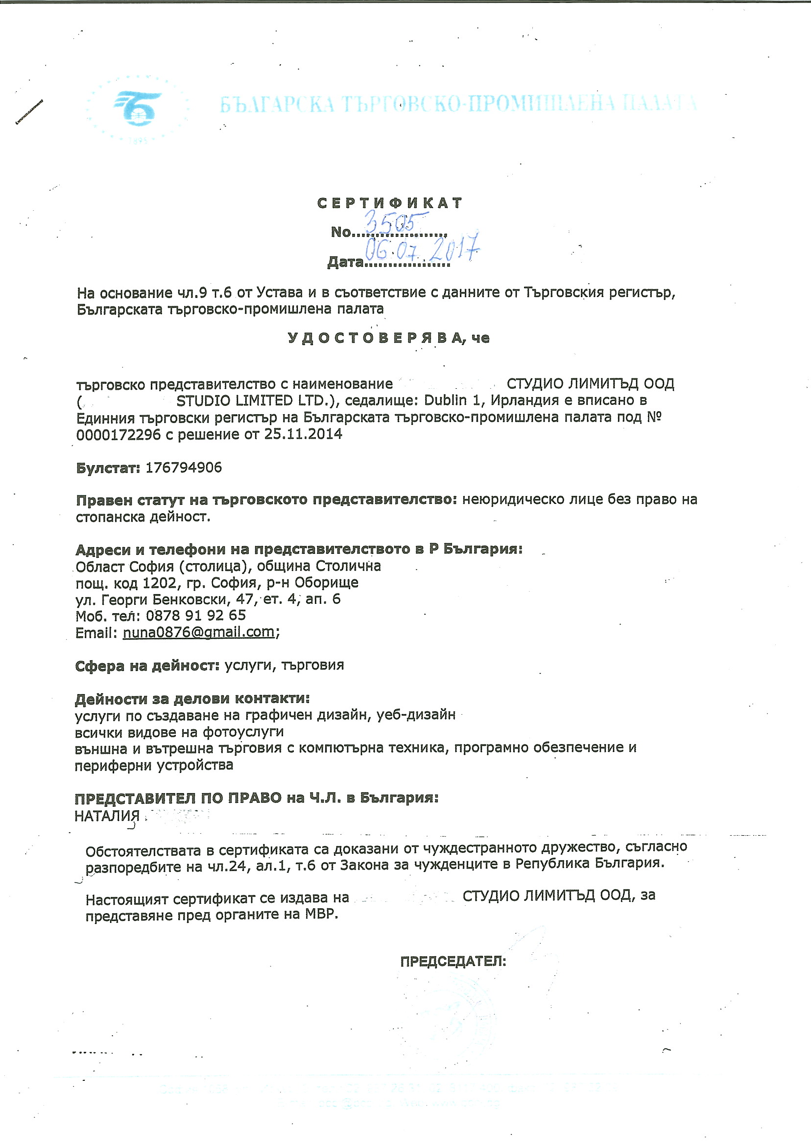 - б) годовые программмы (за текущий и за следующий календарный годы) по исполнению поставленных целей и возложенной деятельностью торгового представительства в Р Болгарии, с нотариально заверенной подписью законного/ых представителя/ей иностранного лица, в котором обосновывается и необходимость за исполнение программы заявленным числом лиц, вписанных как торговые представители, придружена переводом на болгарский язык (декларация);