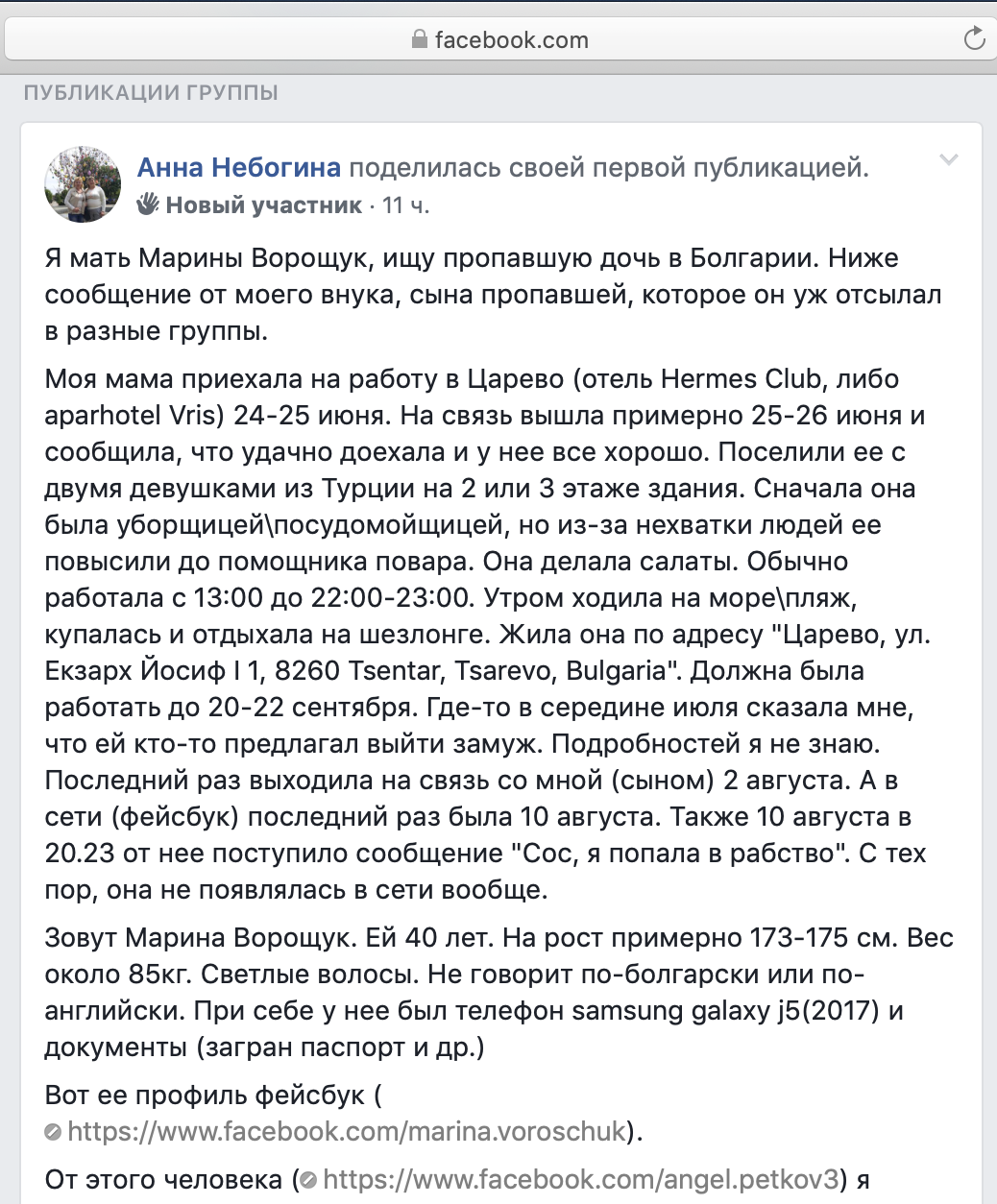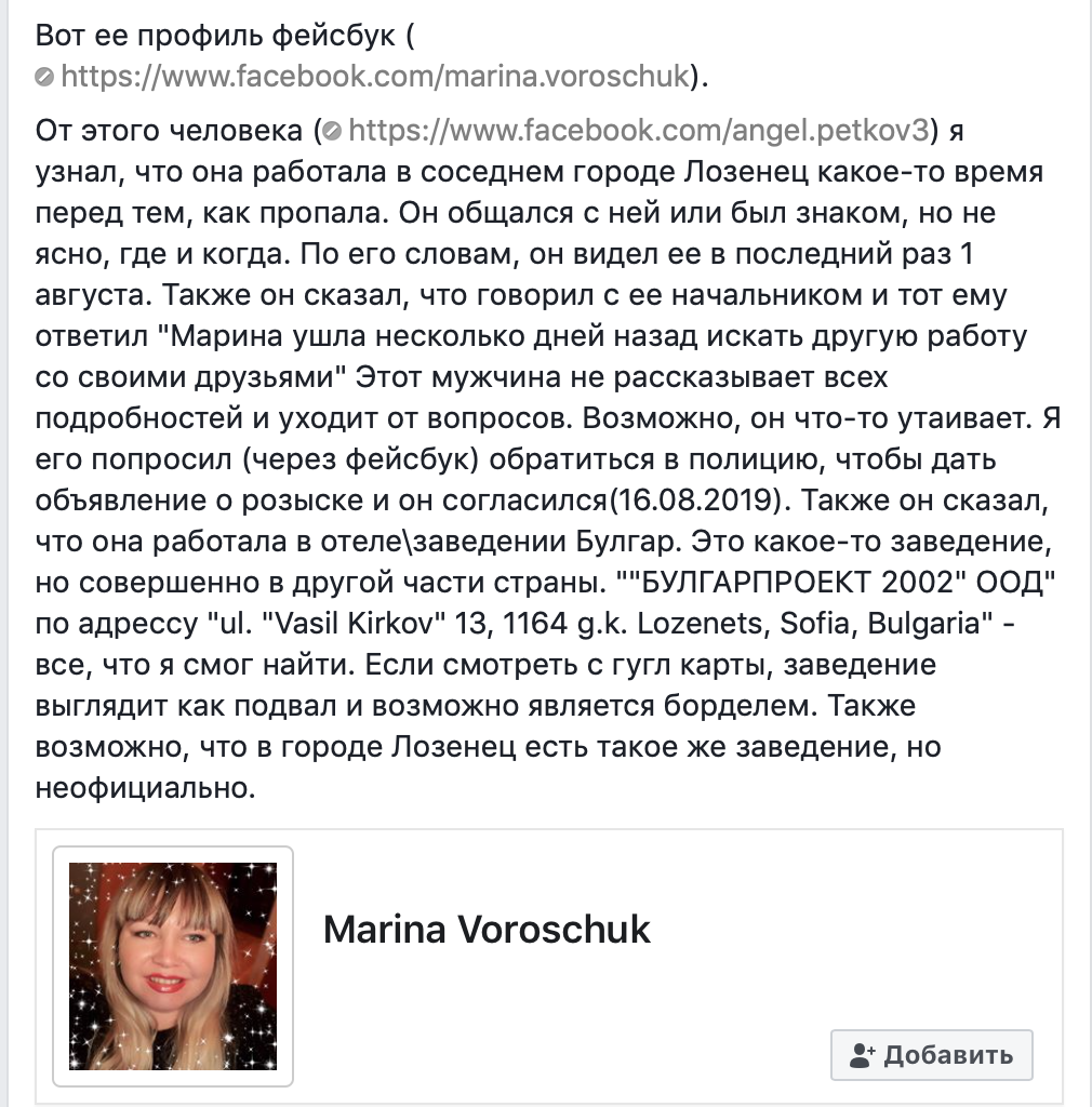 В группе фейсбука "Русские мамочки в Болгарии" выложили пост о пропавшем человеке! Её очень ищут её сын и мама. Если Вы видели её сообщите! Она явно в беде и последнее что написала сыну что попала в рабство. Такое в шутку точно не пишут своему сыну.